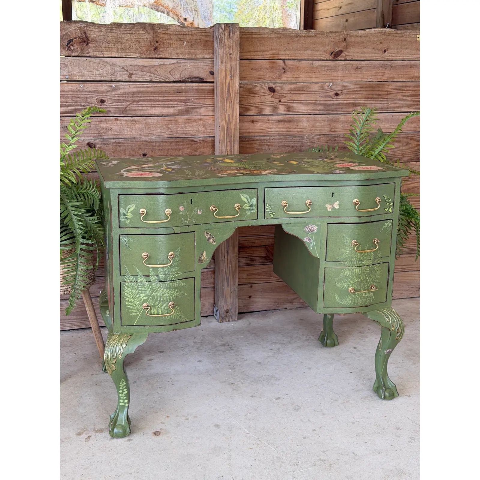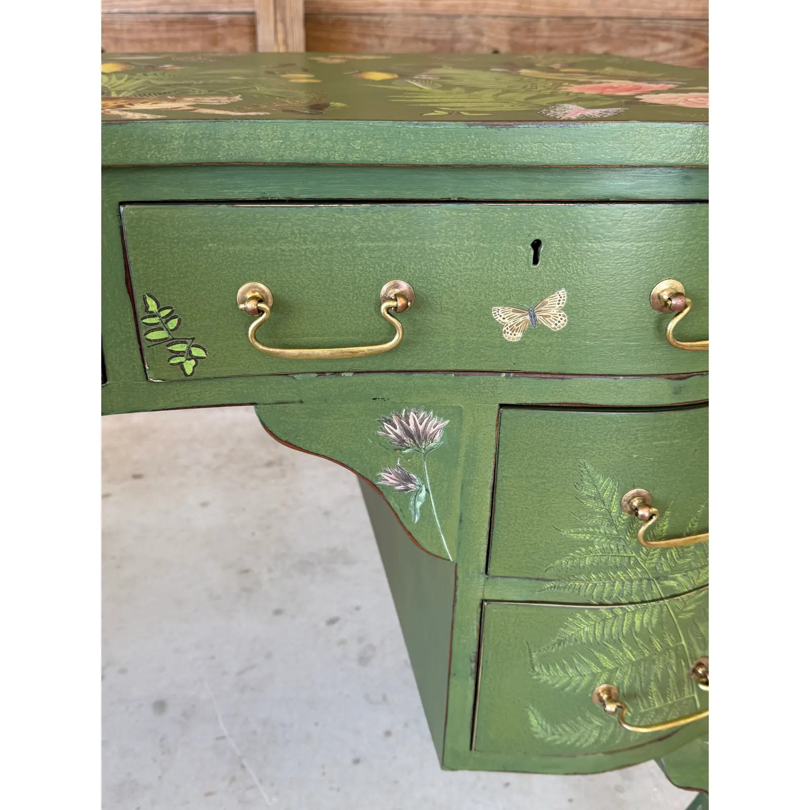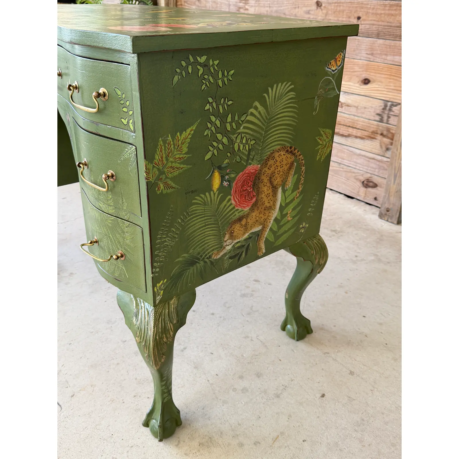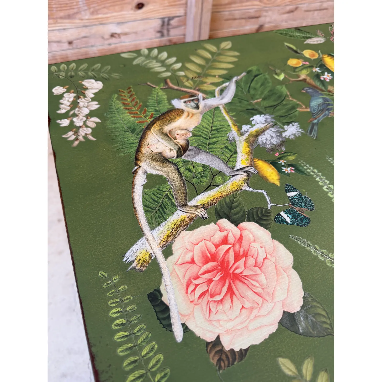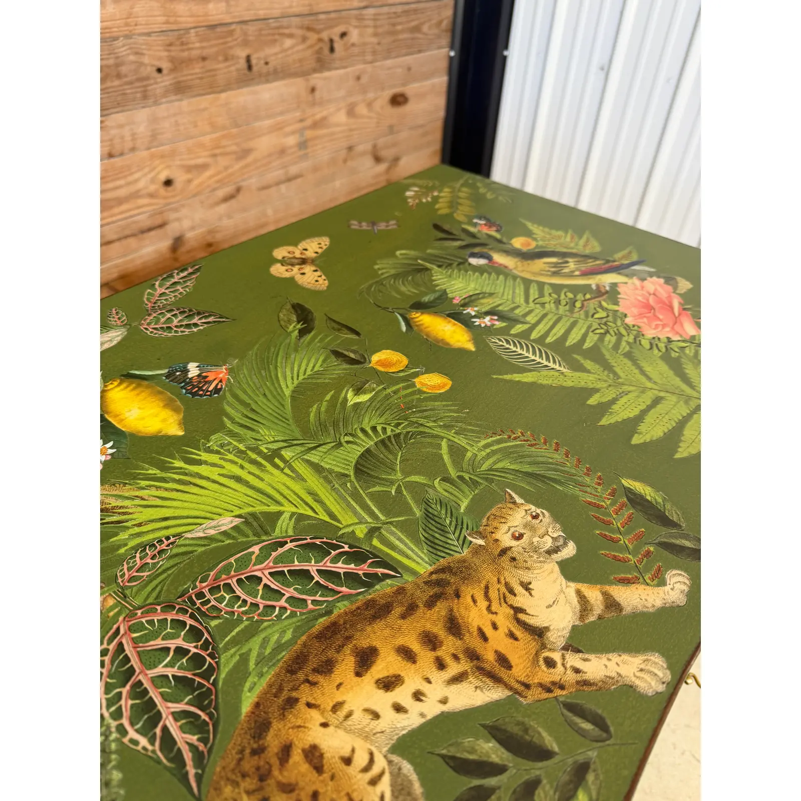 A truly one-of-a-kind antique solid wood vanity or entryway console, thoughtfully reimagined with a custom hand-painted and decoupage boho tropical motif. This piece blends Old World craftsmanship with bold, layered jungle imagery—featuring exotic leopards, monkeys, parrots, butterflies, lush botanicals, and florals—all set against a rich, moody green ground.