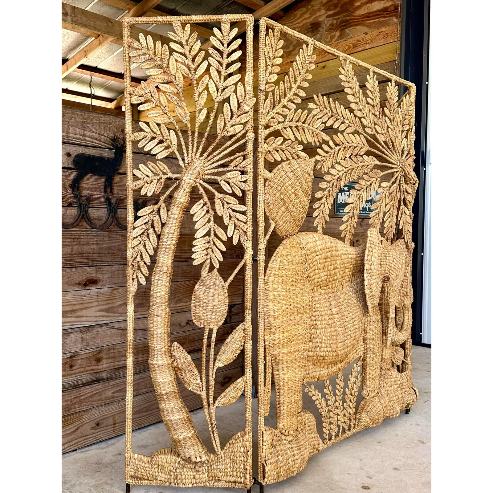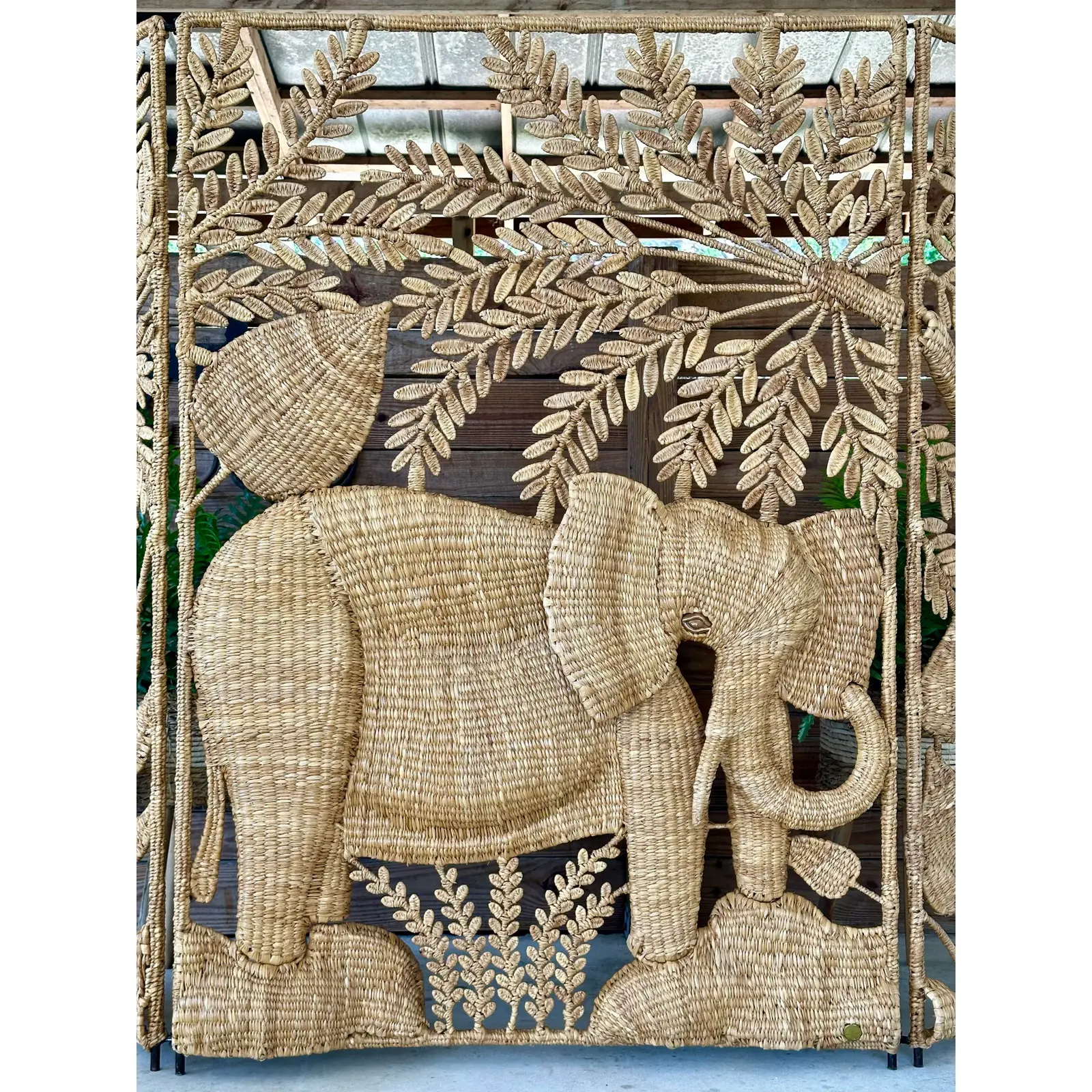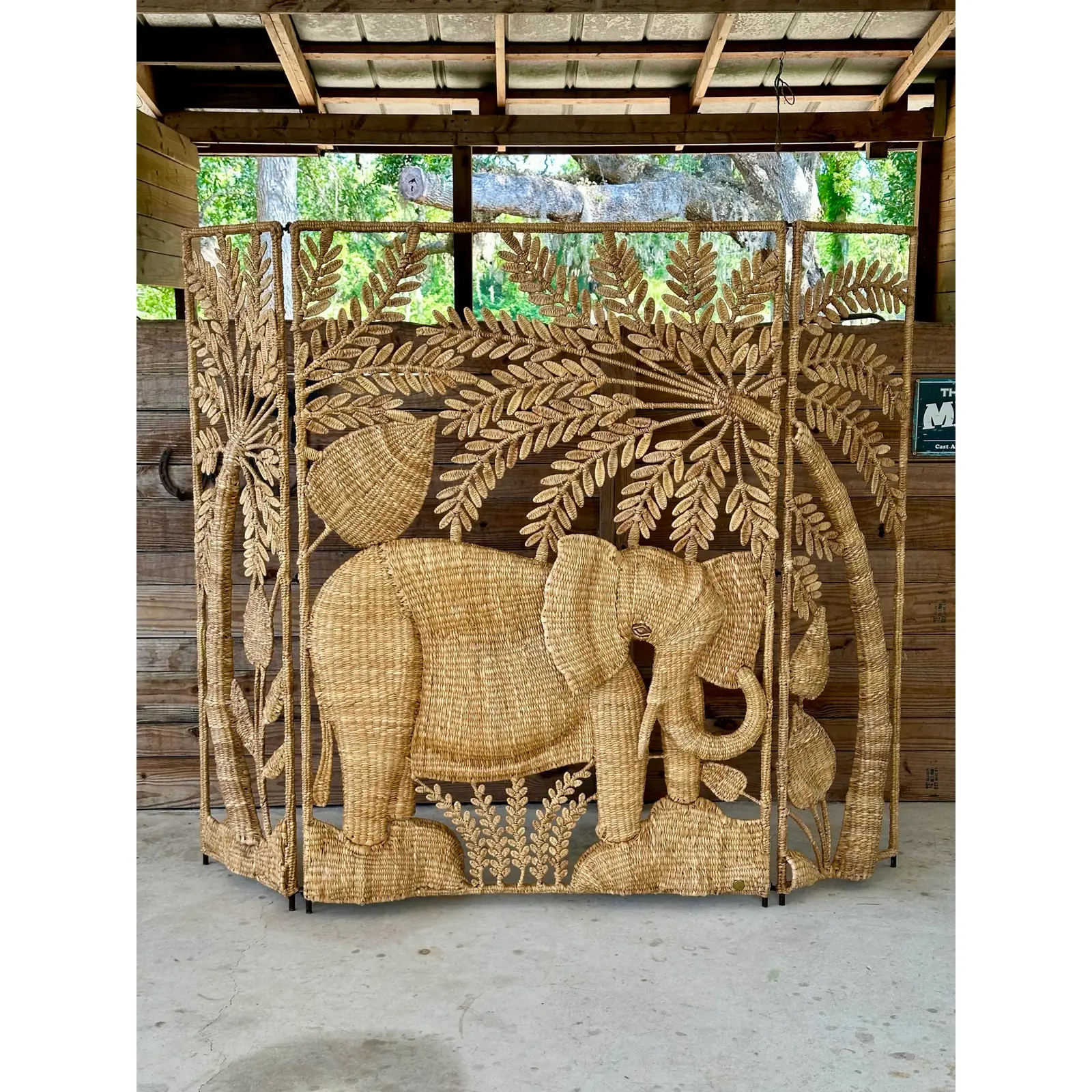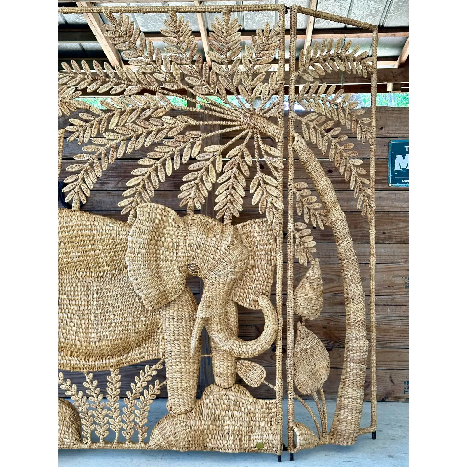 Fabulous statement three panel folding room divider screen by Mario Lopez Torres handcrafted with palm trees and a large sculptural elephant.