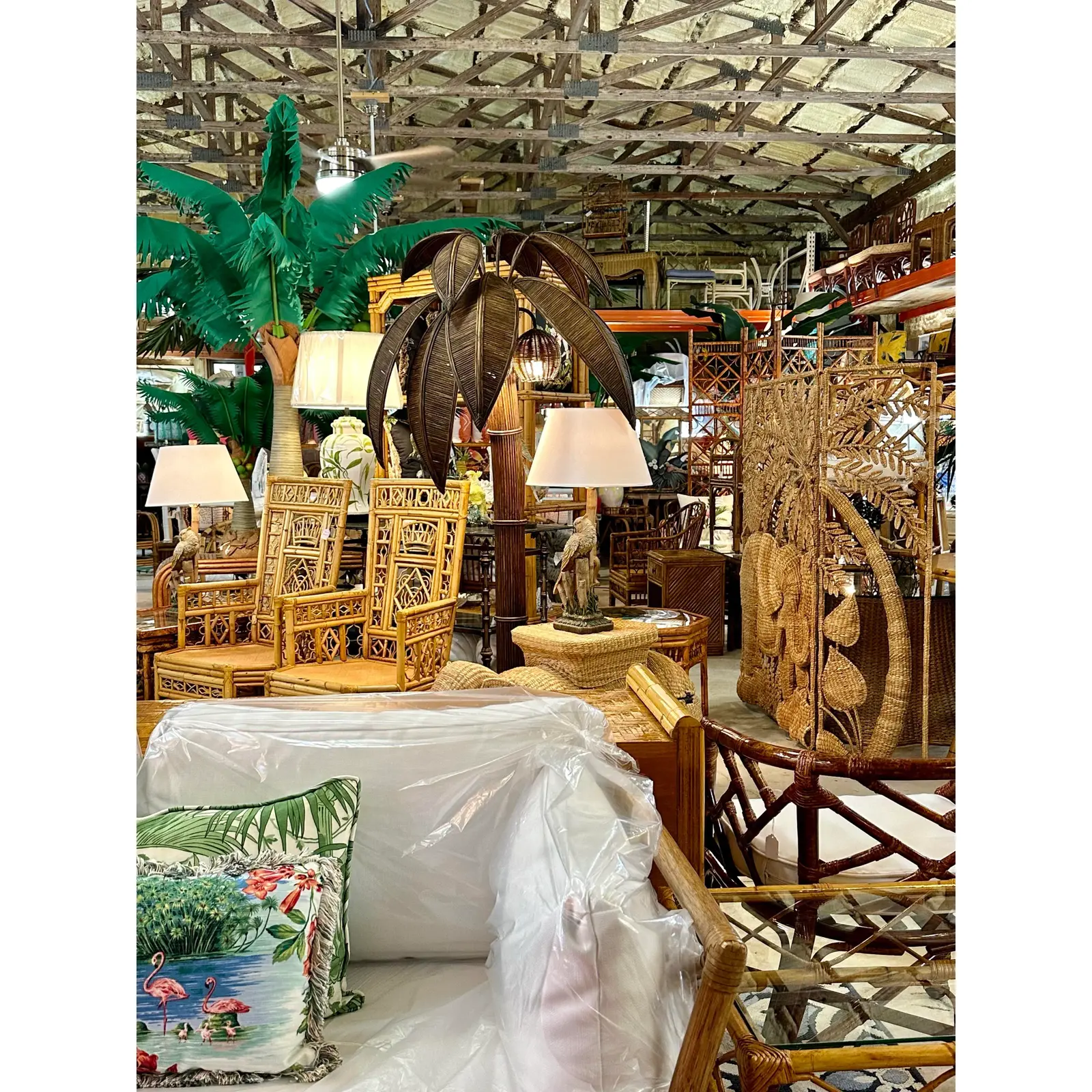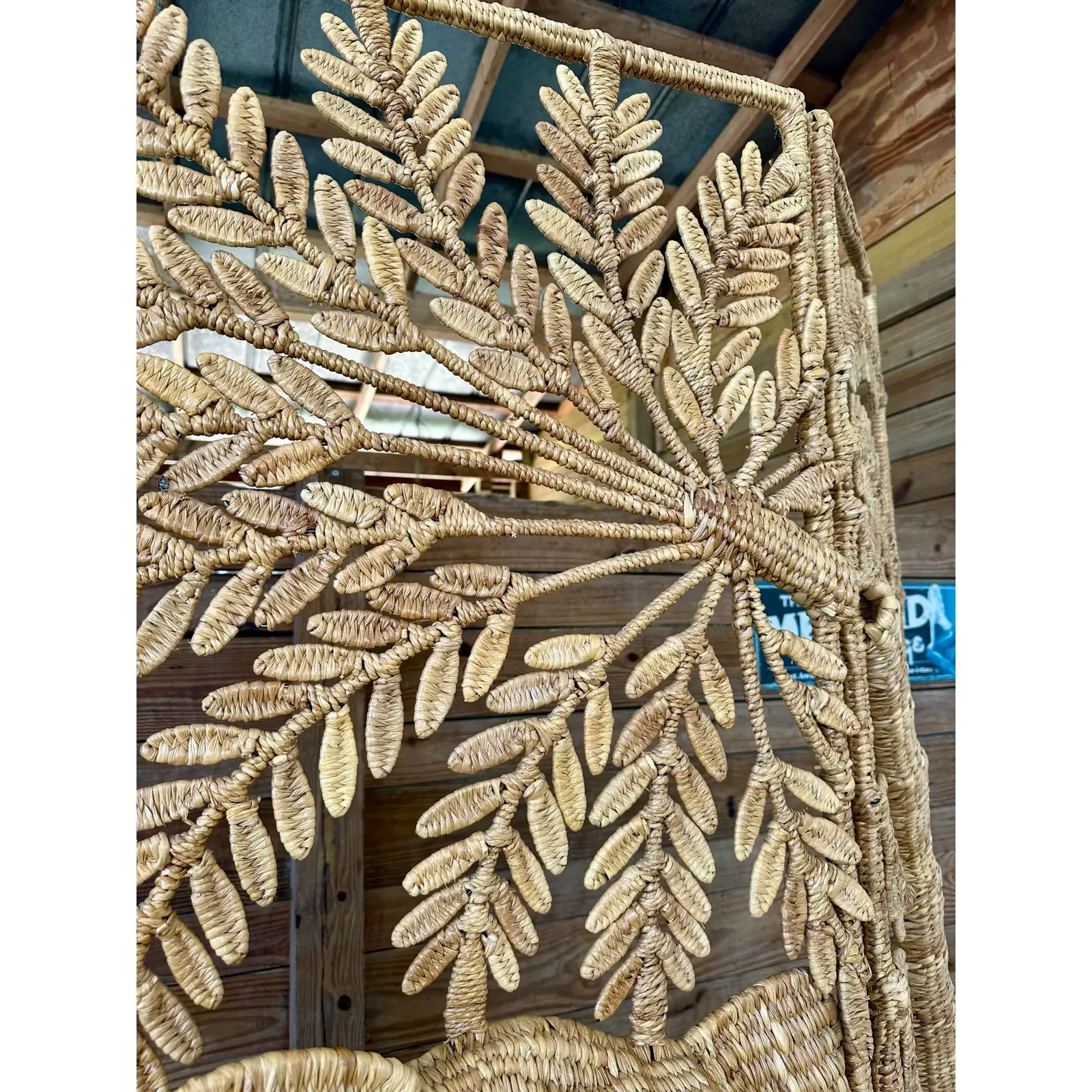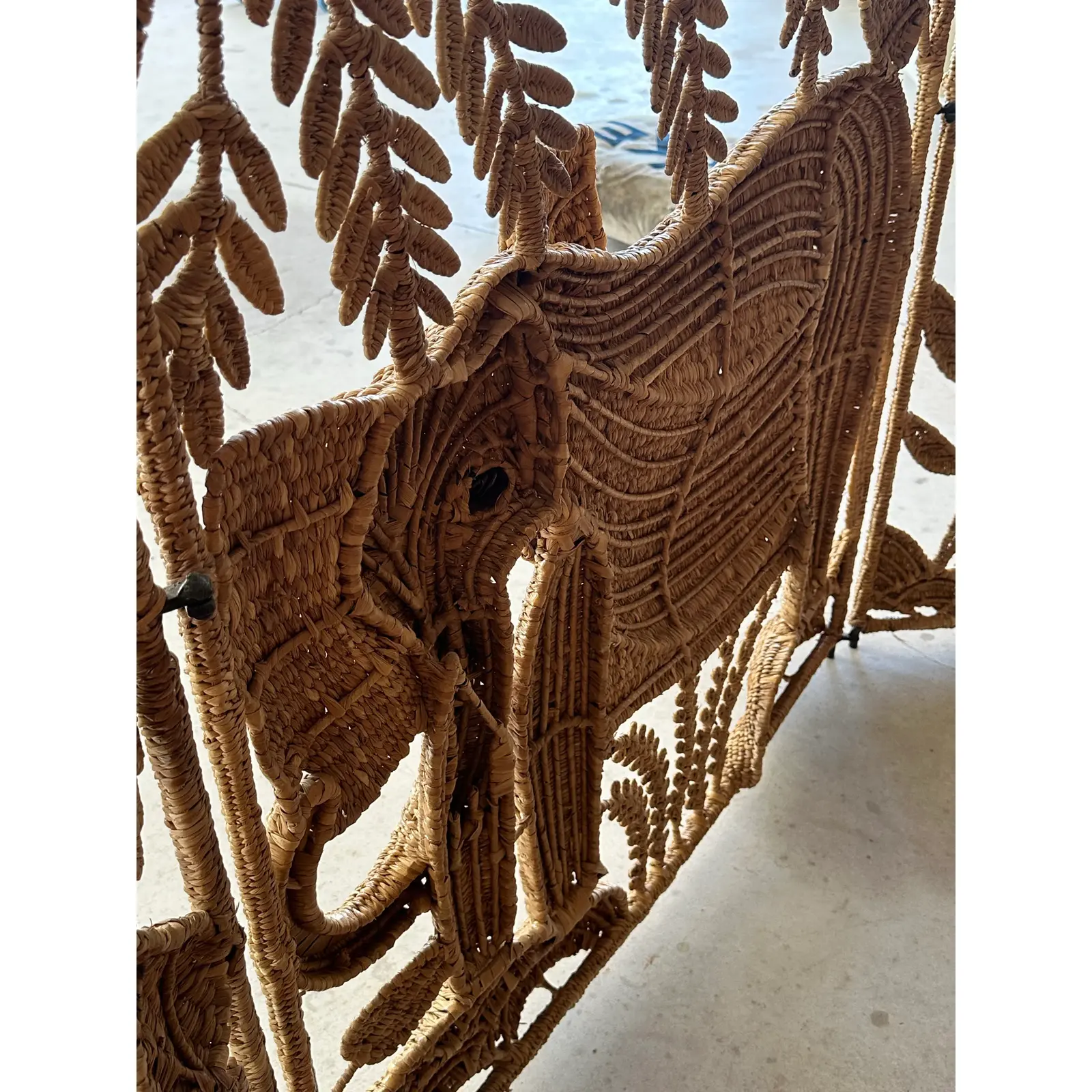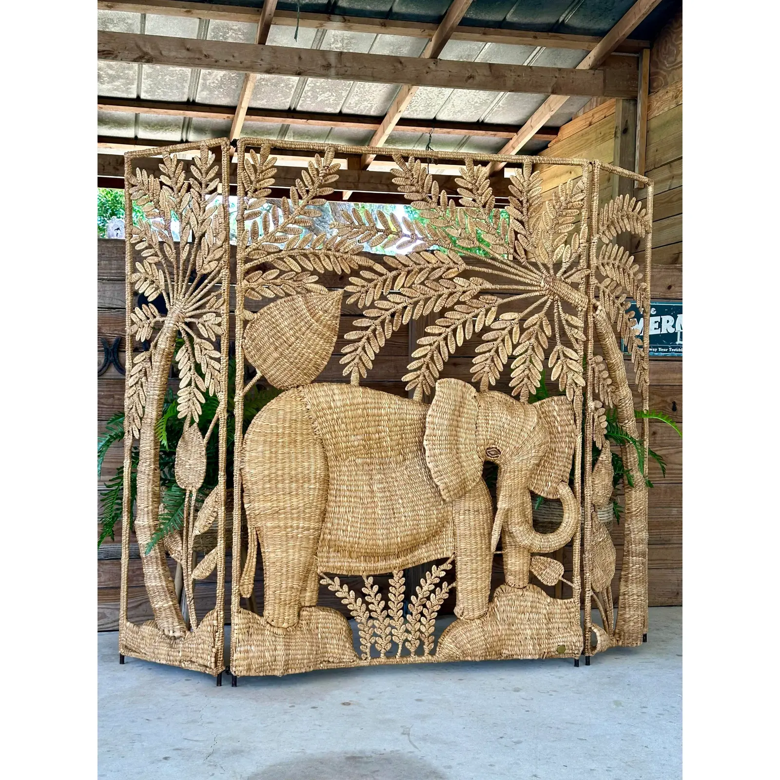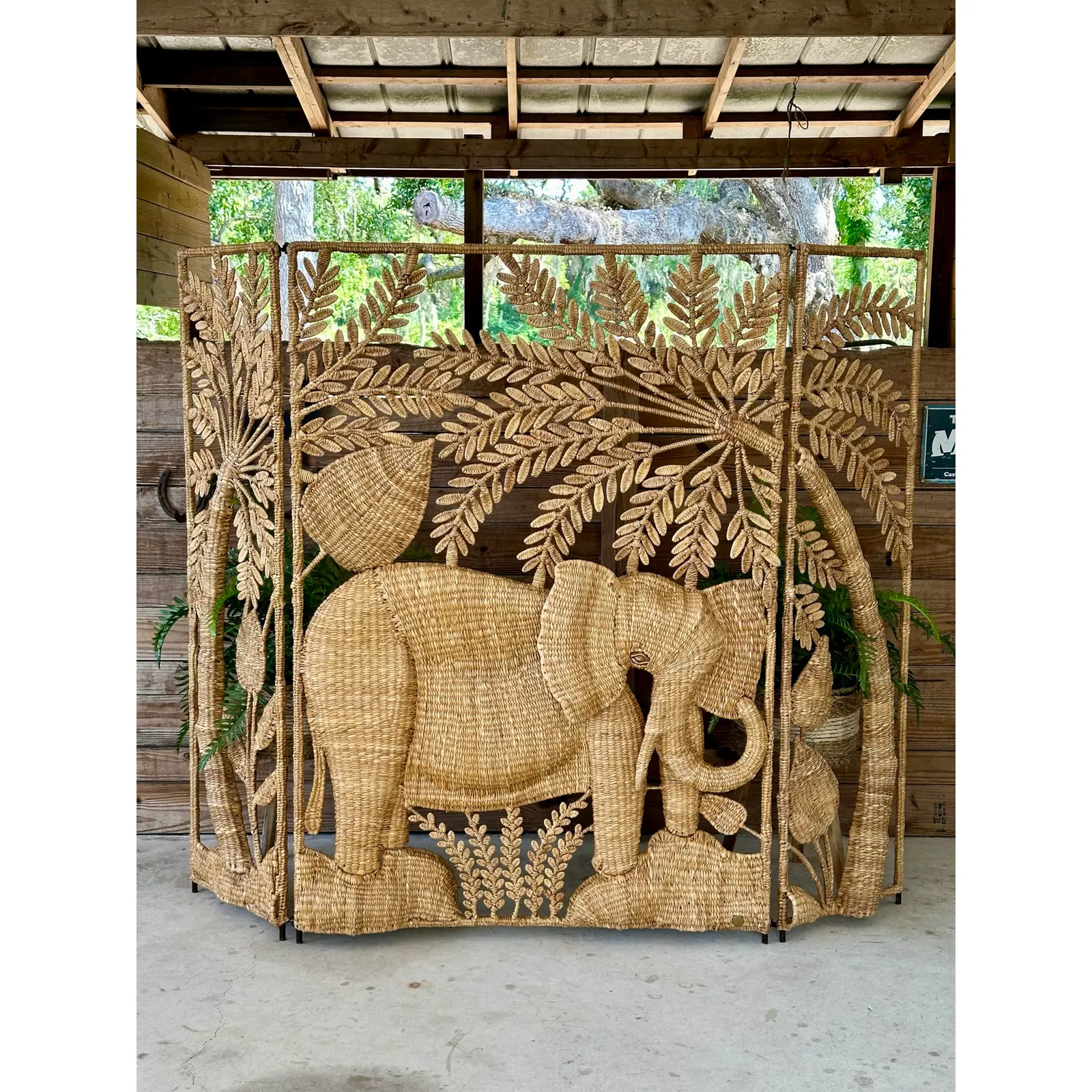 Fabulous statement three panel folding room divider screen by Mario Lopez Torres handcrafted with palm trees and a large sculptural elephant.