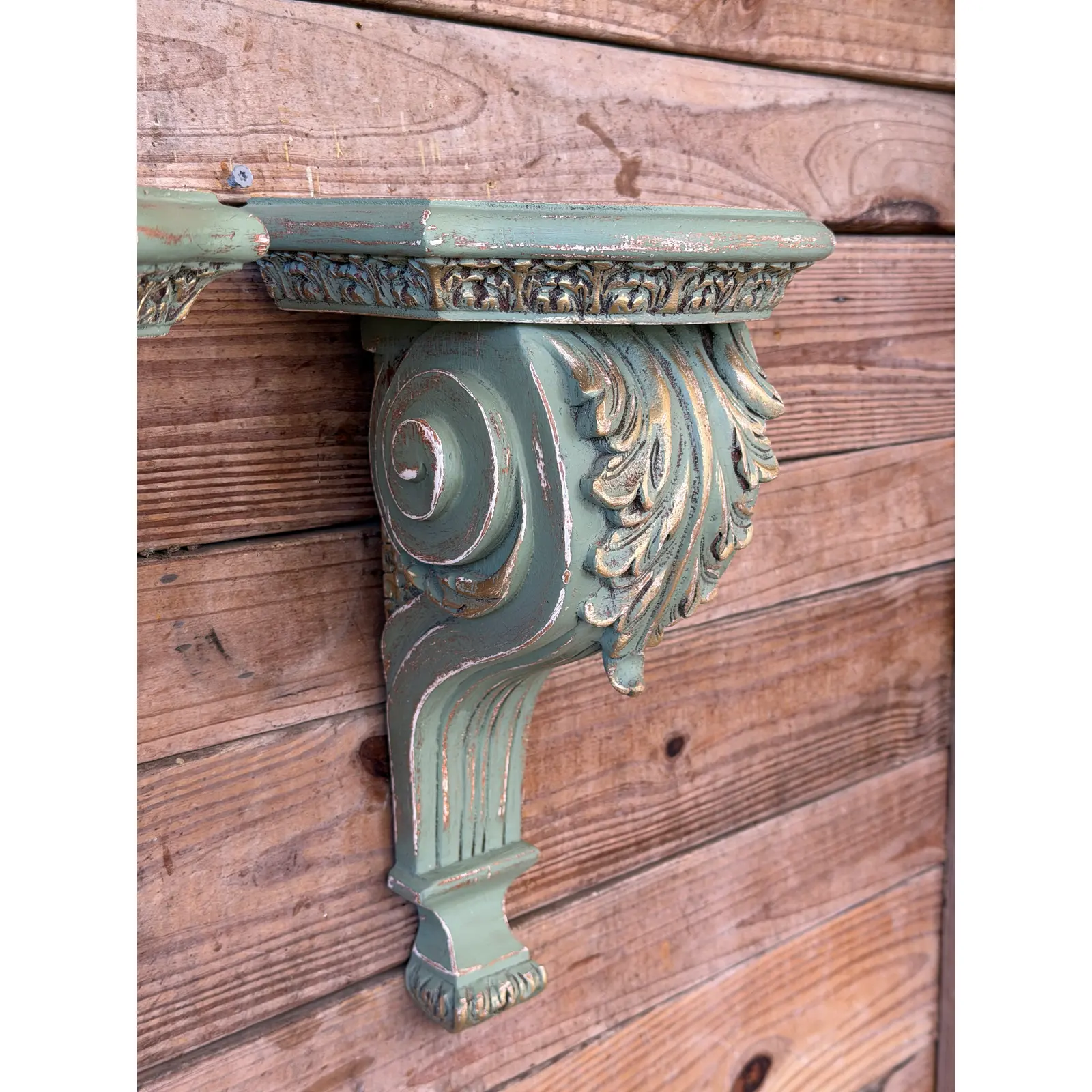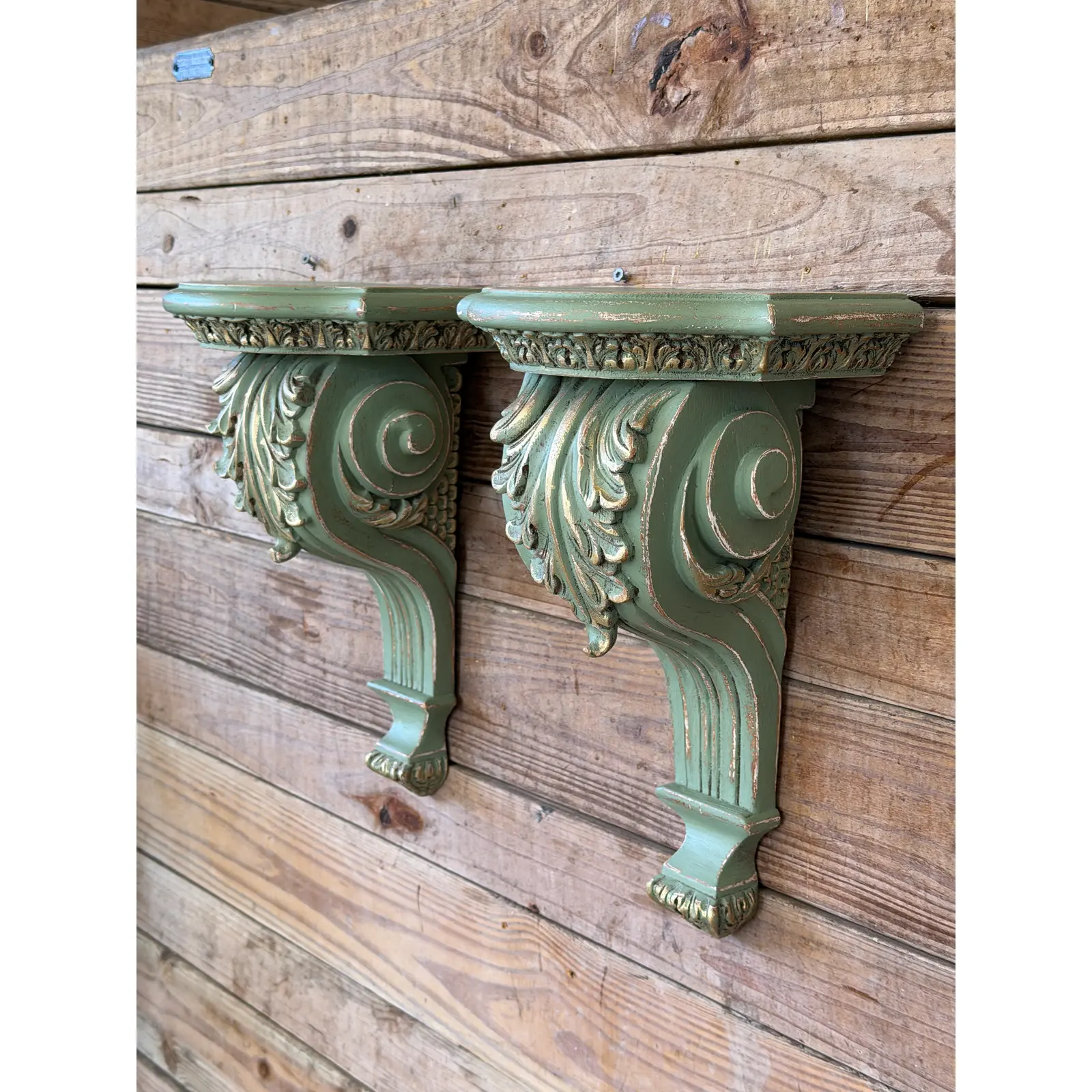 Pair of Carved Acanthus Wall Bracket Shelves / Corbels in Distressed Green Finish