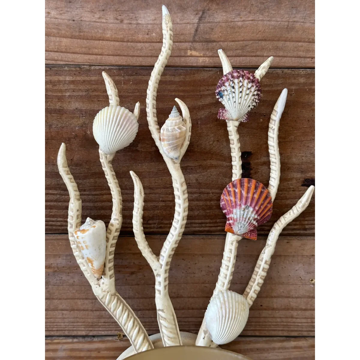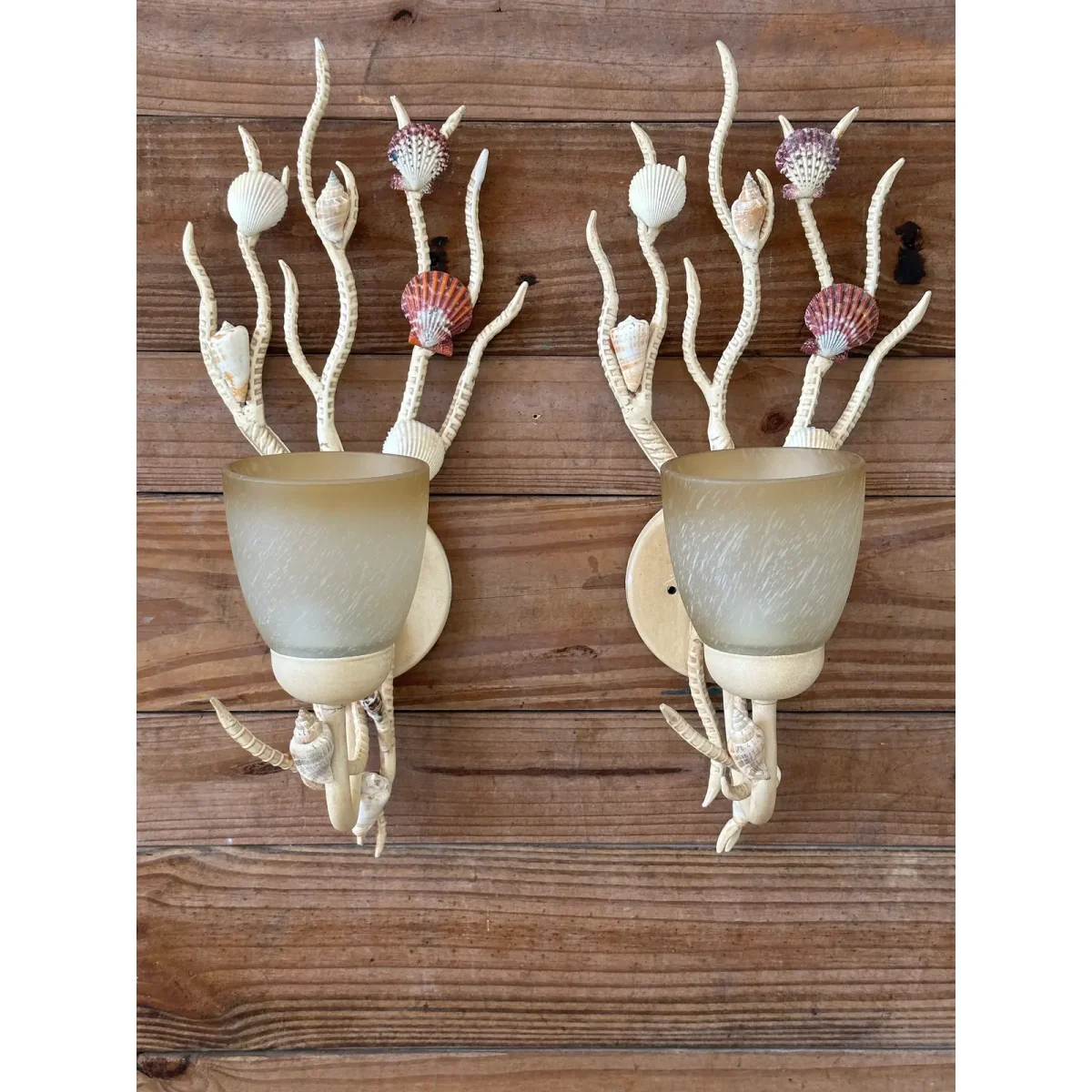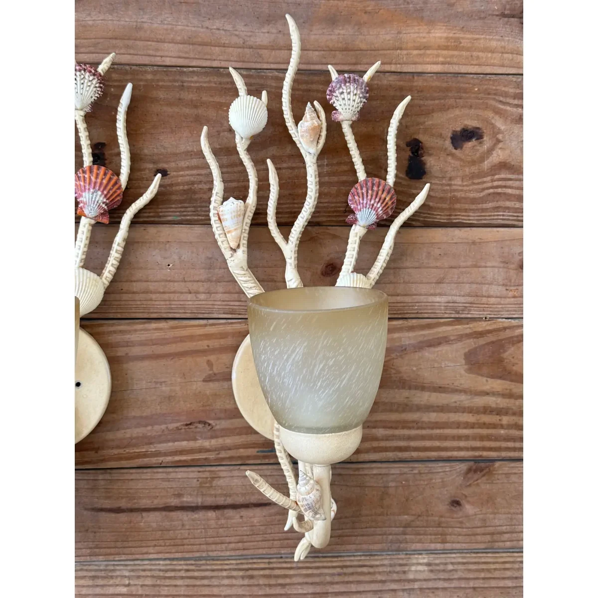 Coastal hand forged metal coral and sea shell hardwired wall light sconces with frosted glass globes in working condition. Fabulous coastal wall light sconces ready to hang with all wiring and in working condition.