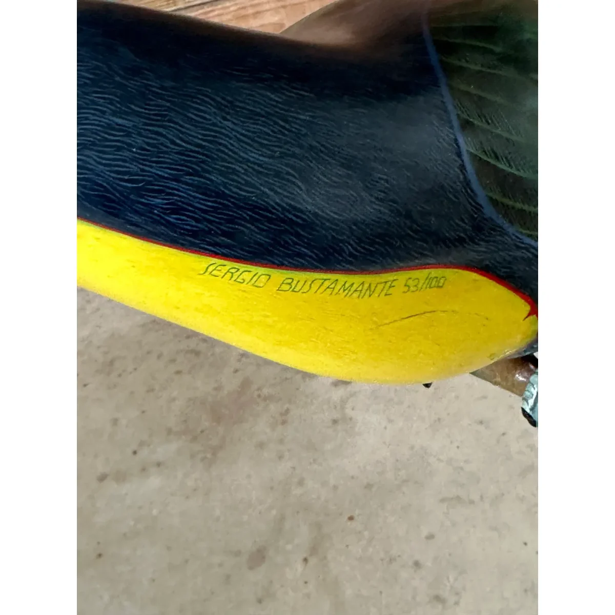 Tropical coastal Sergio Bustamante (Mexican, b. 1942) , “Toucan”, polychrome papier-mâché and mixed media sculpture, signed and numbered “53/100” on neck, leaf motif decorated ring mount.