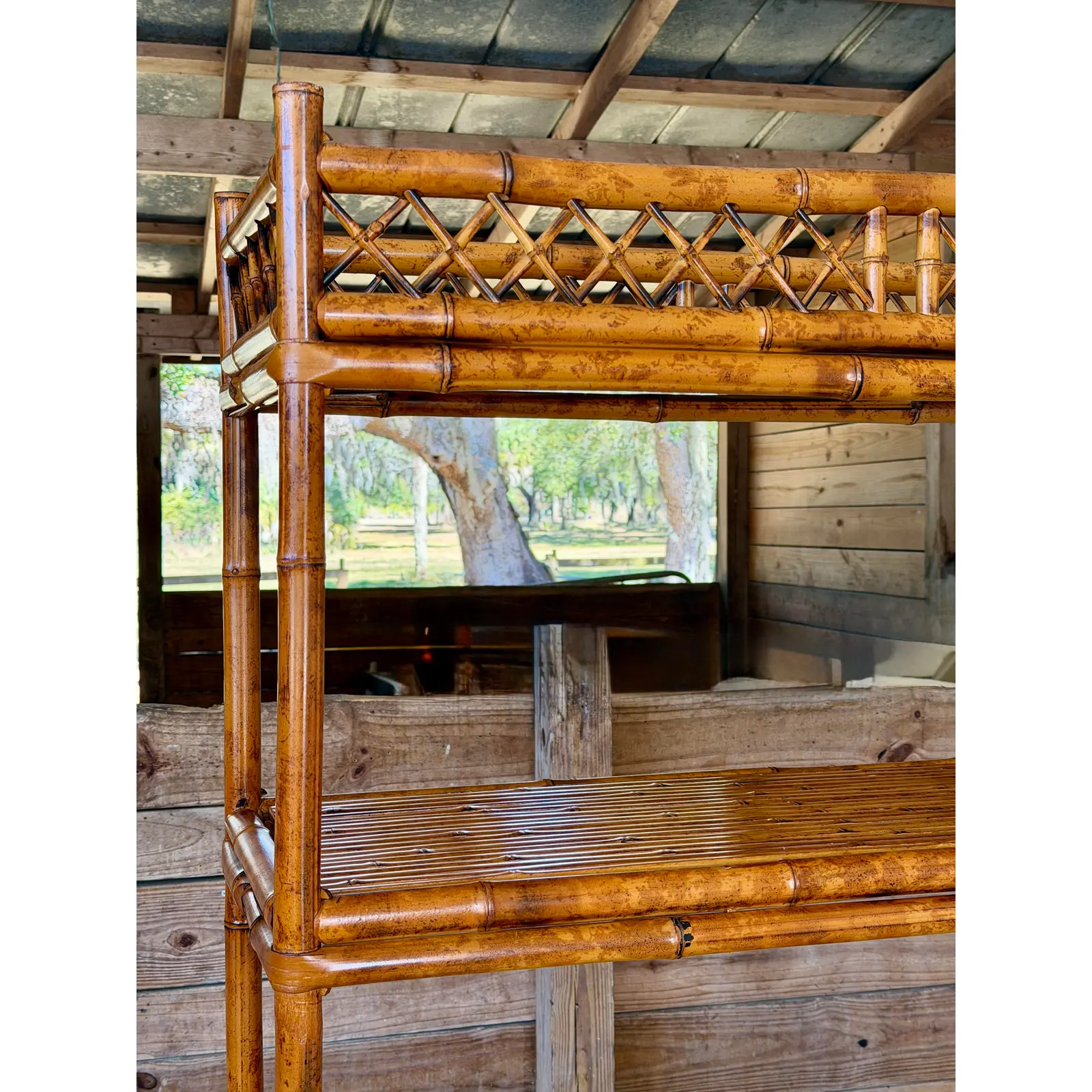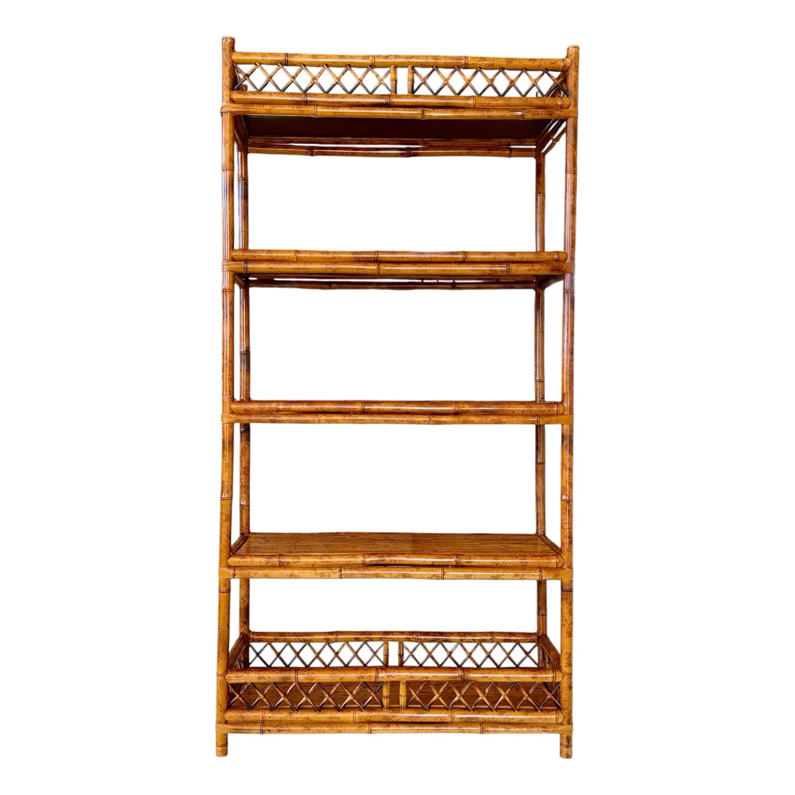The piece features multiple fixed shelves with bamboo slat surfaces, upper and lower lattice gallery details, and strong vertical lines—perfect for books, ceramics, barware, or styled collections. The warm patina and subtle surface variation are exactly what collectors look for in authentic vintage bamboo.