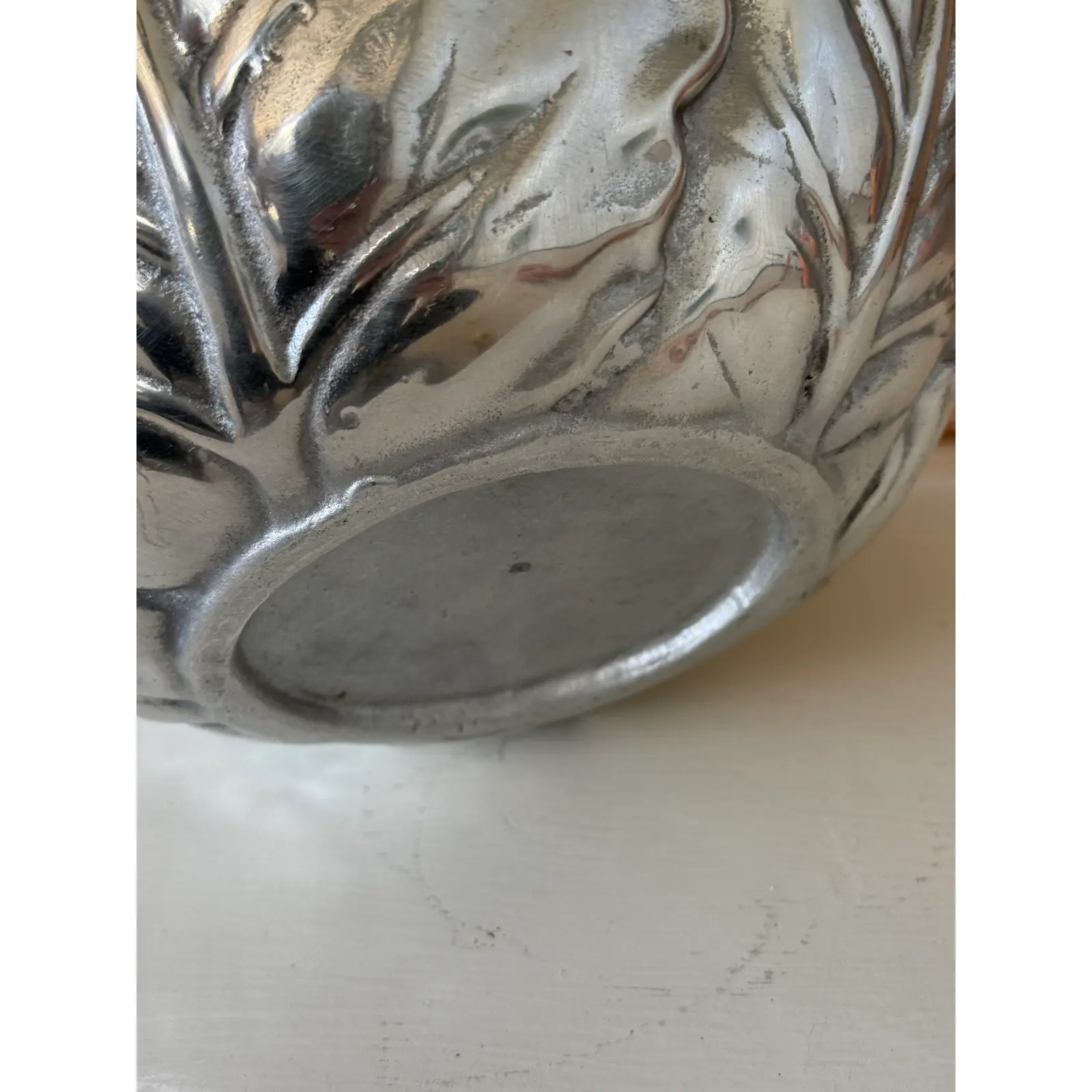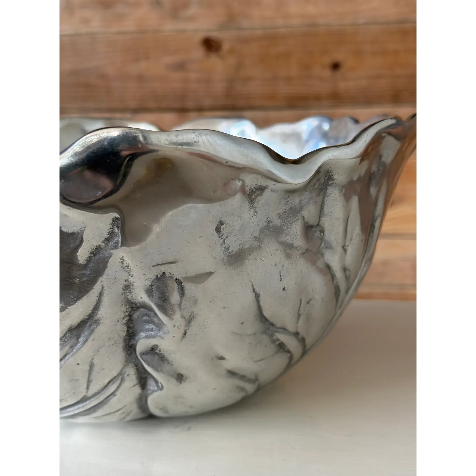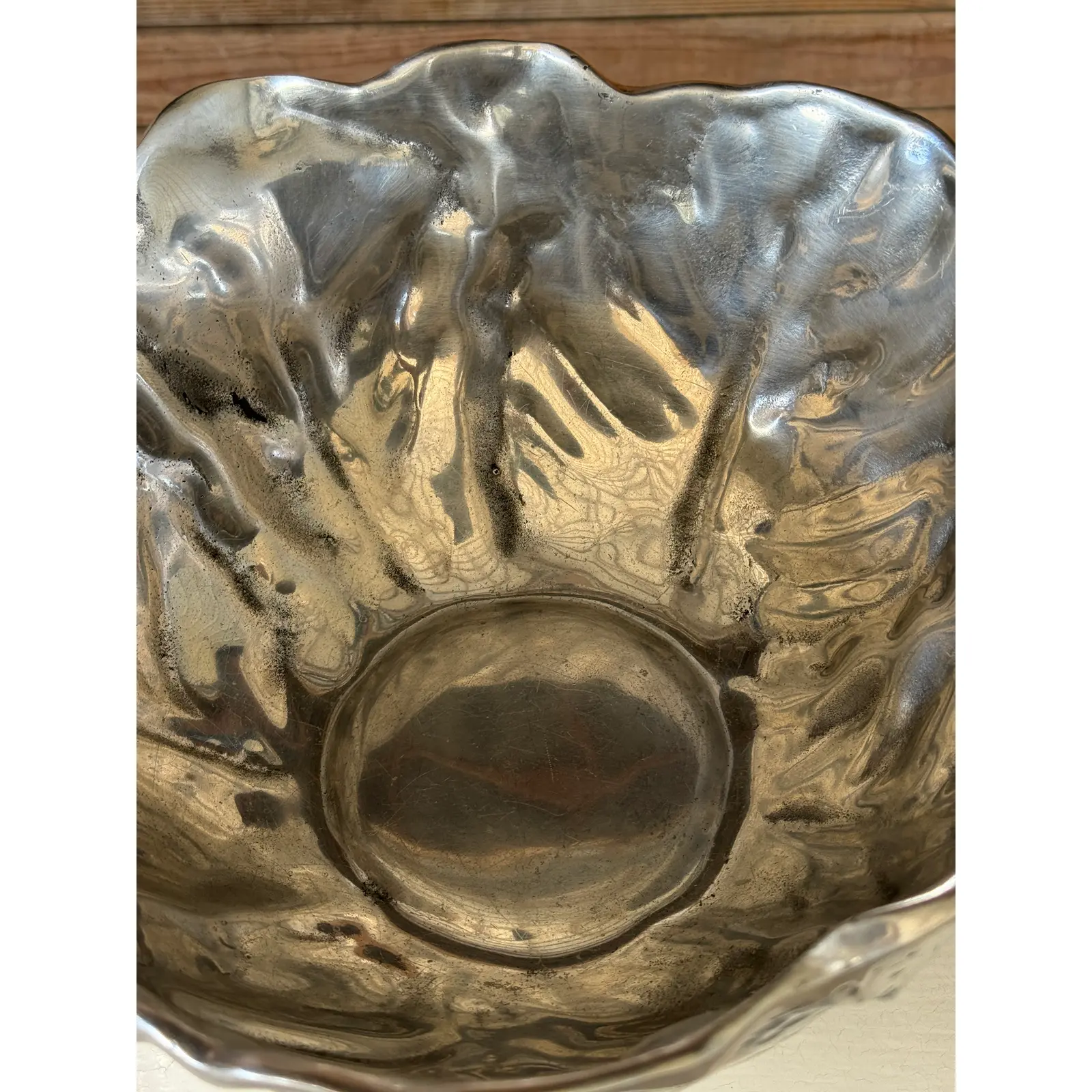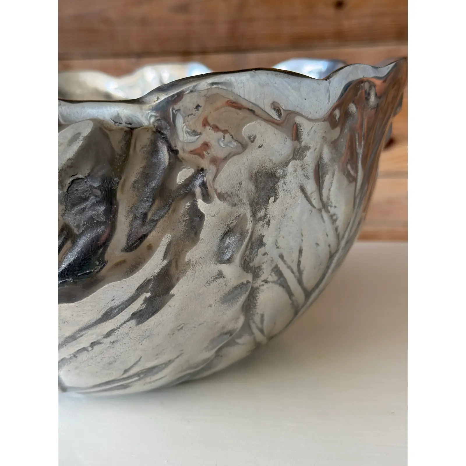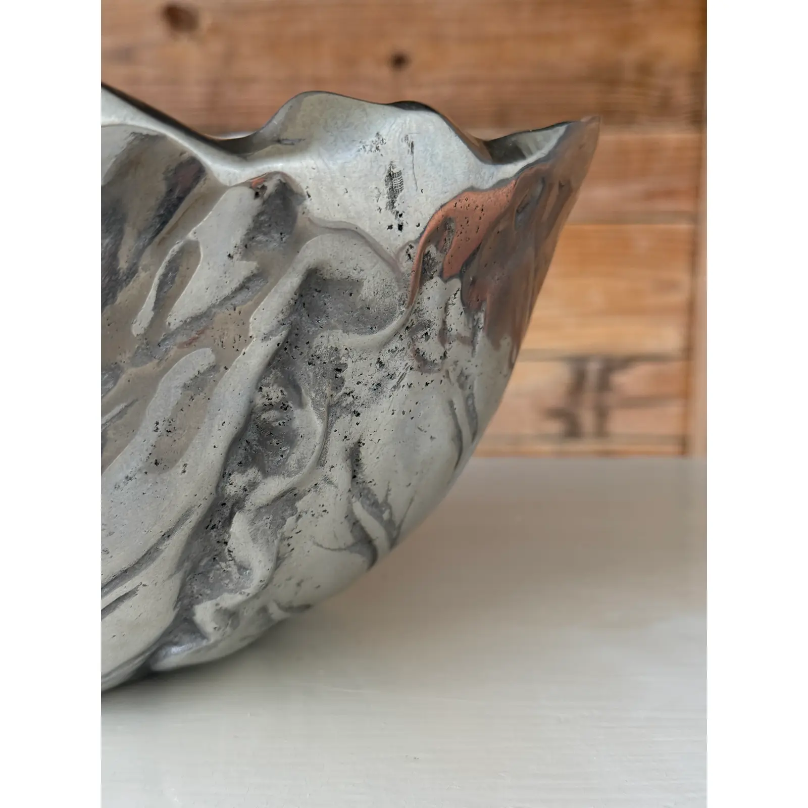 The finish presents a soft silvery-gray patina with natural tonal variation, surface pitting, and wear that enhance its character and sculptural appeal. This piece works beautifully as a decorative bowl, centerpiece, or objet d’art, and pairs well with both traditional and eclectic interiors.