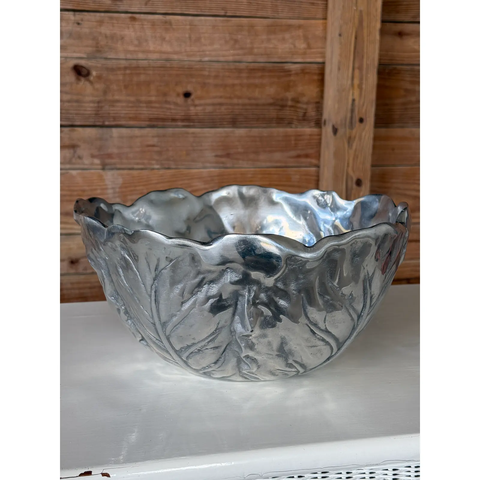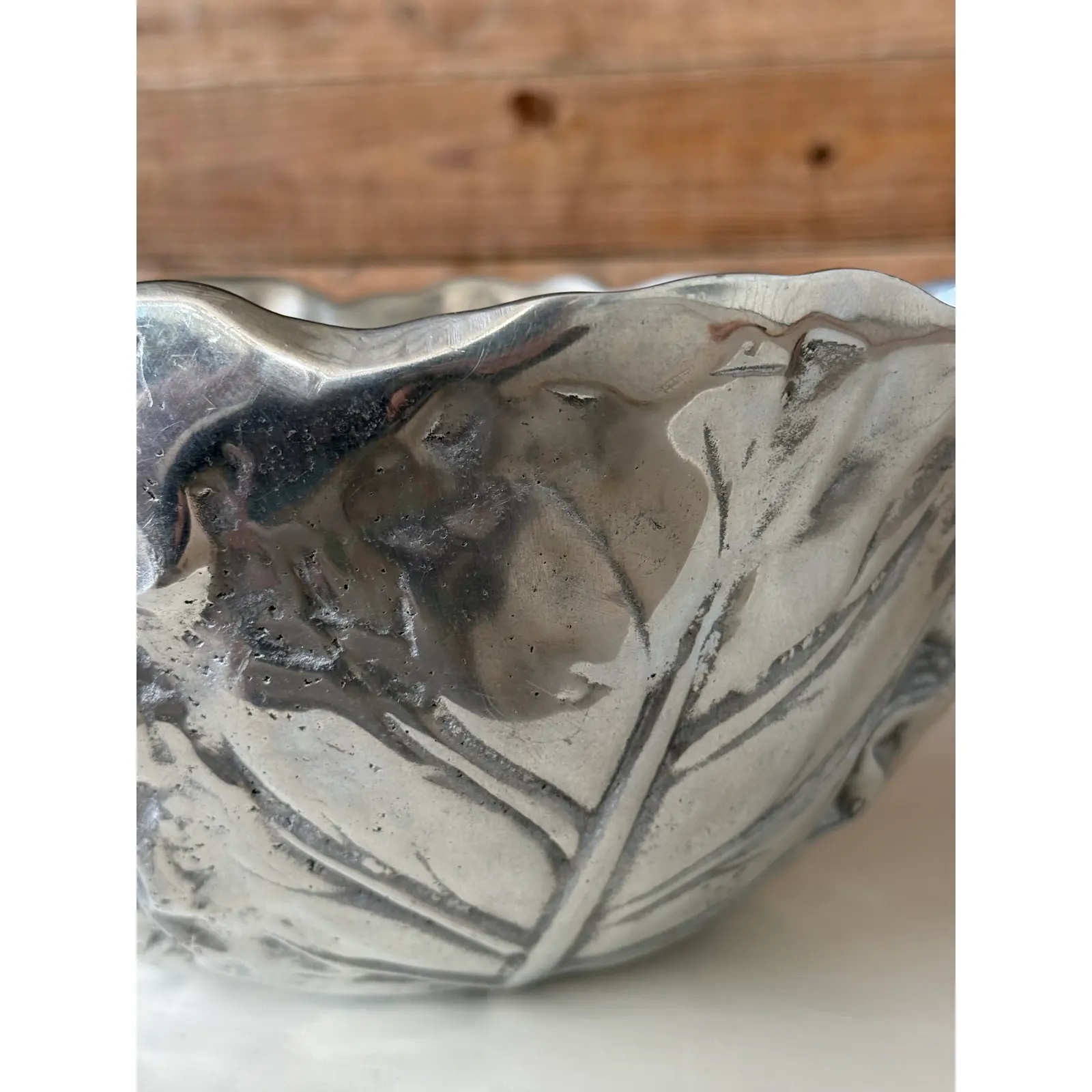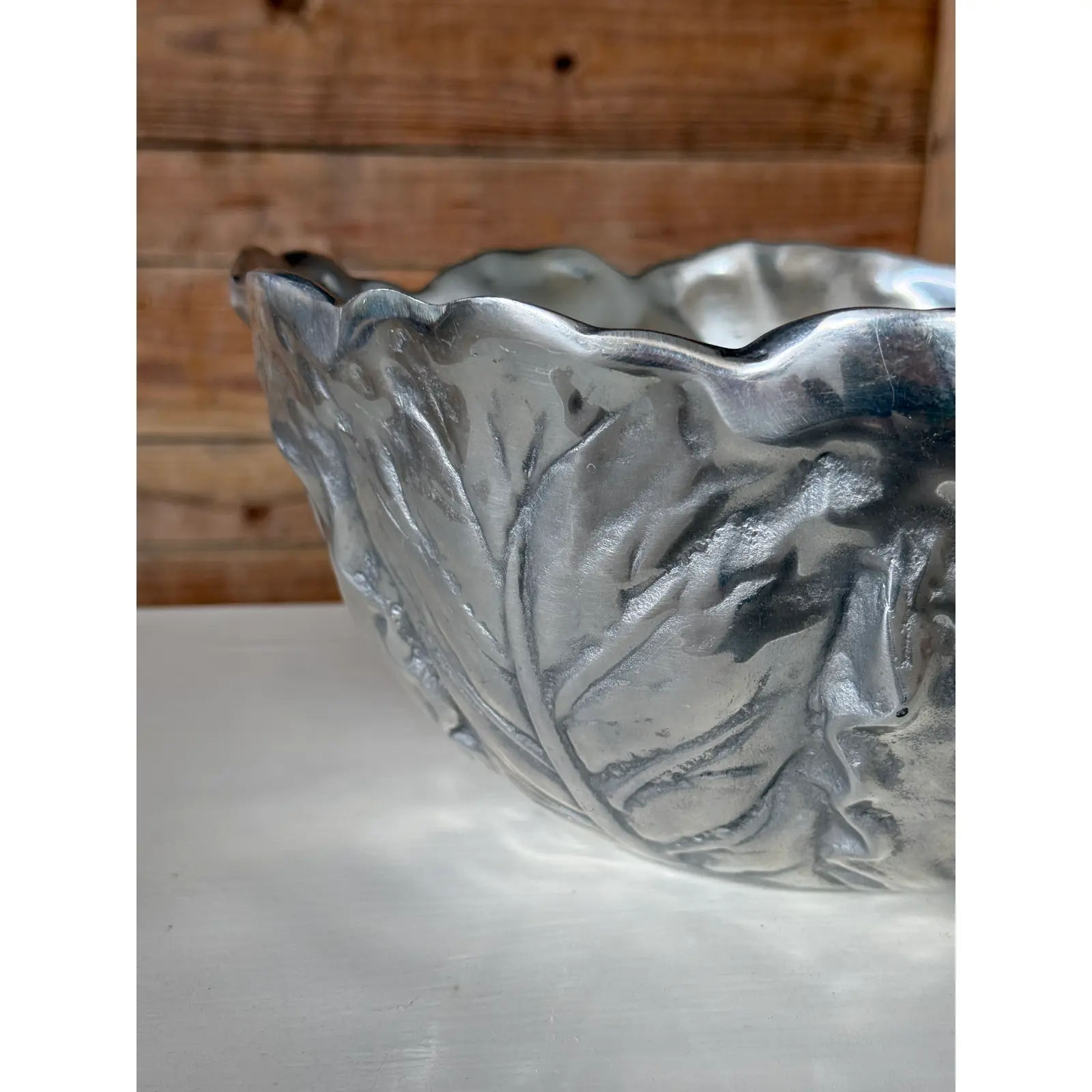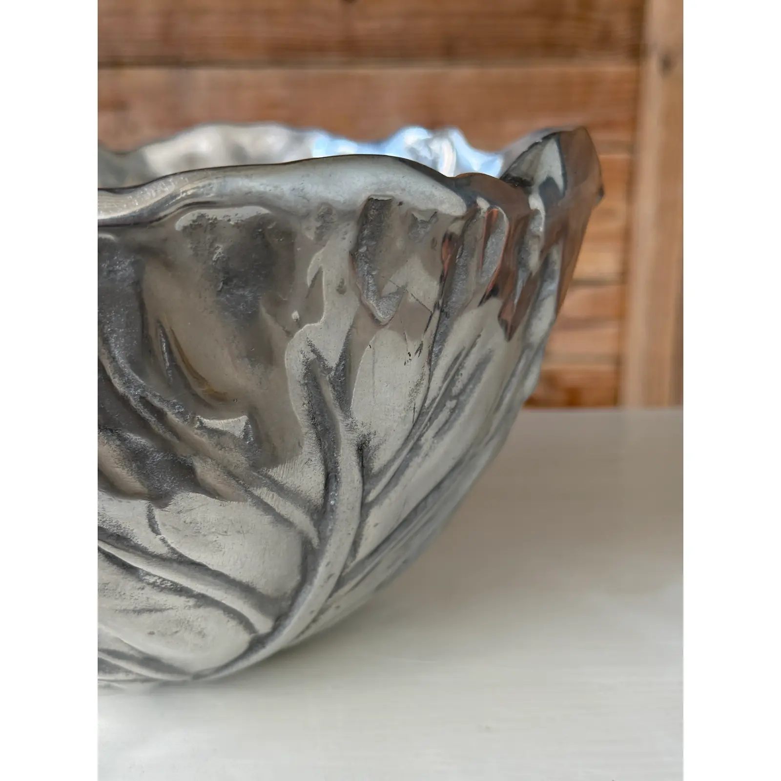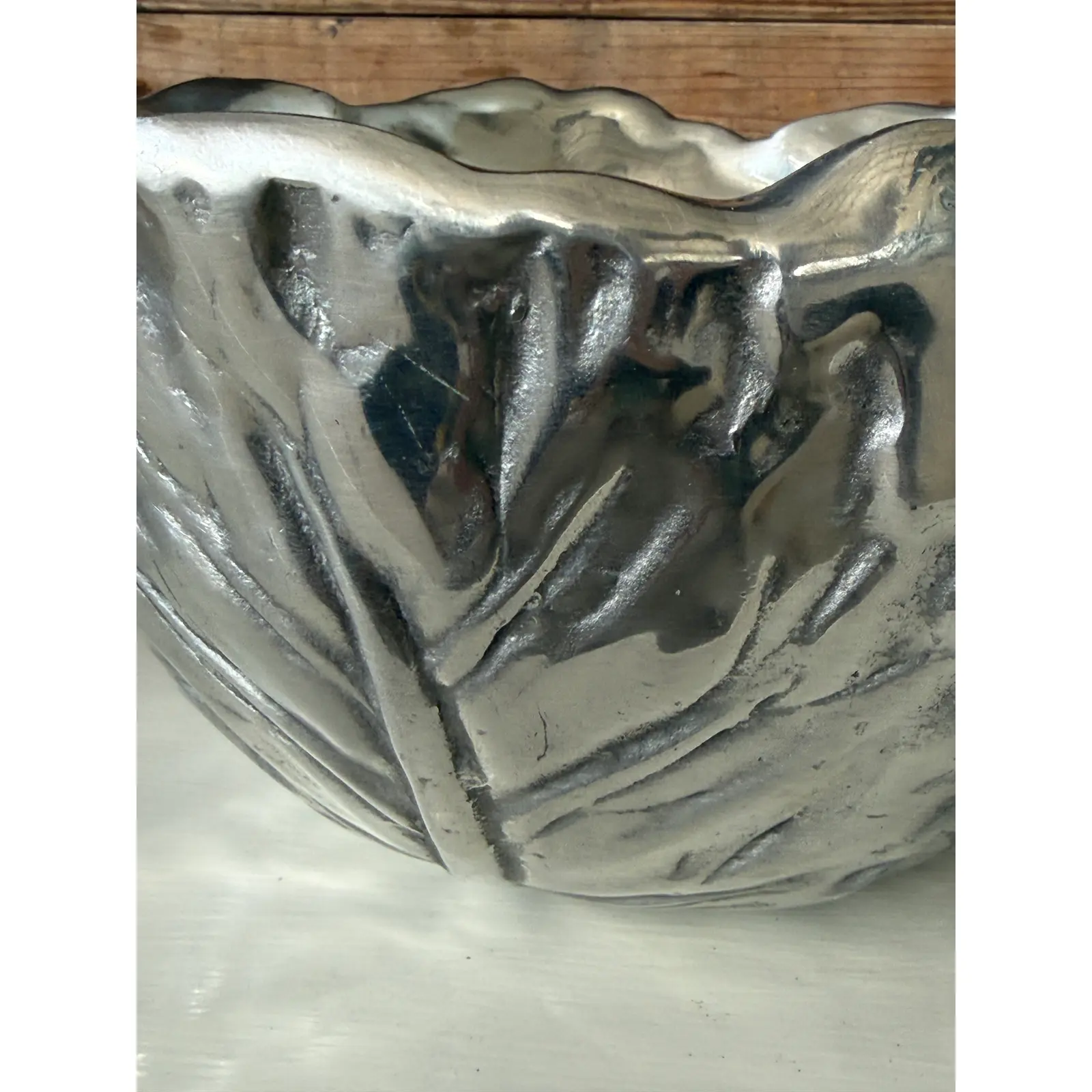A sculptural vintage cabbage-form decorative bowl, crafted in cast metal with a pewter-tone finish. The deeply modeled leaf veins and organically scalloped rim give this piece wonderful texture and visual movement, making it an eye-catching accent for a tabletop, console, or shelf.