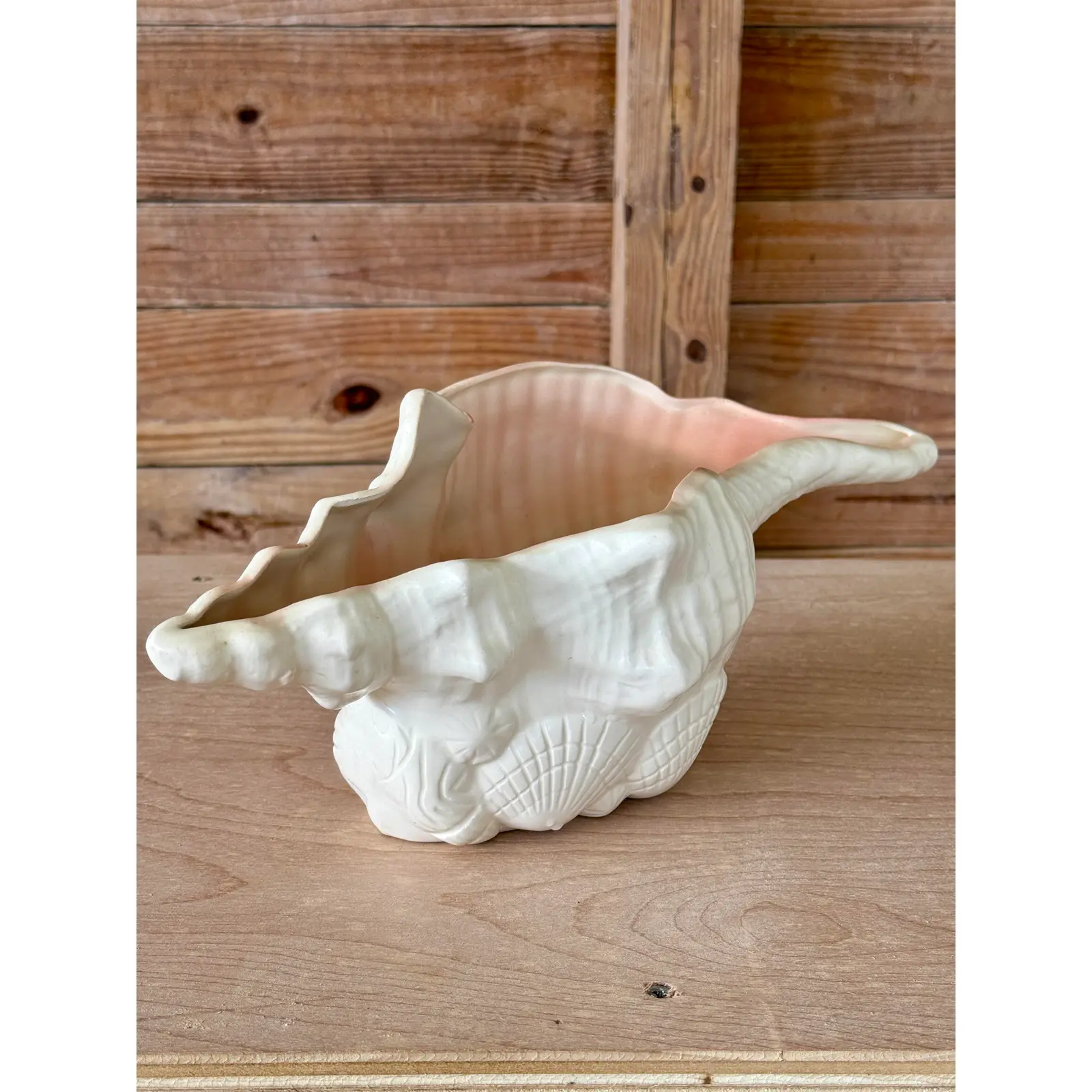 Bring a touch of coastal charm to your space with this ceramic conch shell planter or centerpiece. Crafted in the mid-20th century, it features a creamy white exterior with delicate shell detailing along the base and a soft blush interior glaze. Its sculptural form captures the natural beauty of the sea, making it a versatile decorative accent. Perfect for displaying flowers, holding greenery, or as a standalone statement piece.