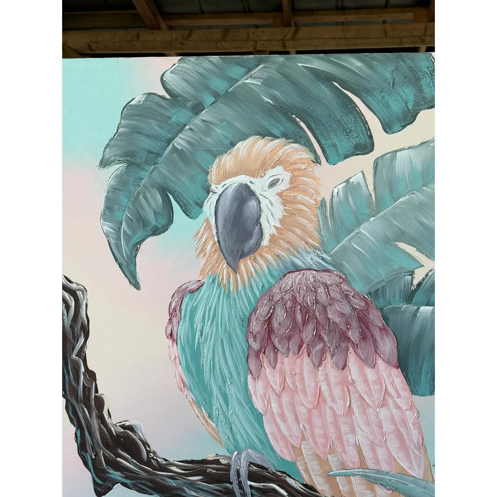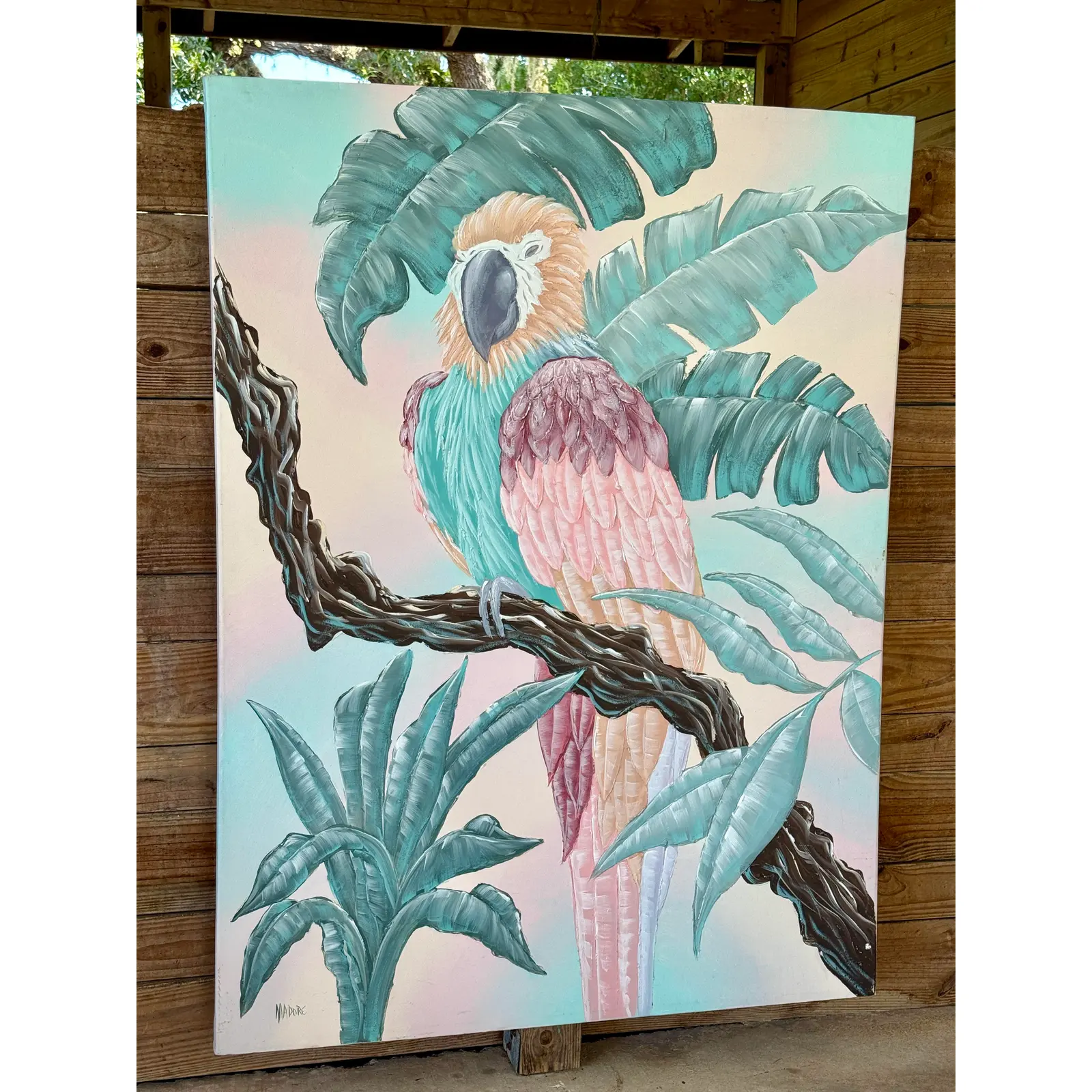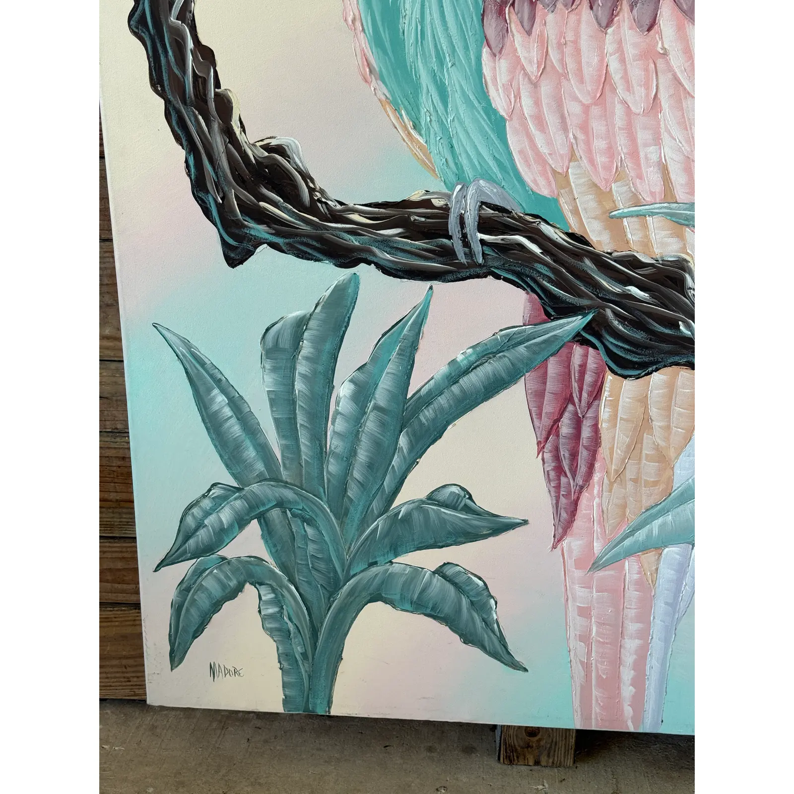 A vibrant and textured contemporary painting by artist Madore, featuring a majestic macaw perched among lush tropical foliage. Executed in a palette of soft pastels and rich teals, the piece captures both whimsy and boldness with its dimensional brushwork and large scale.