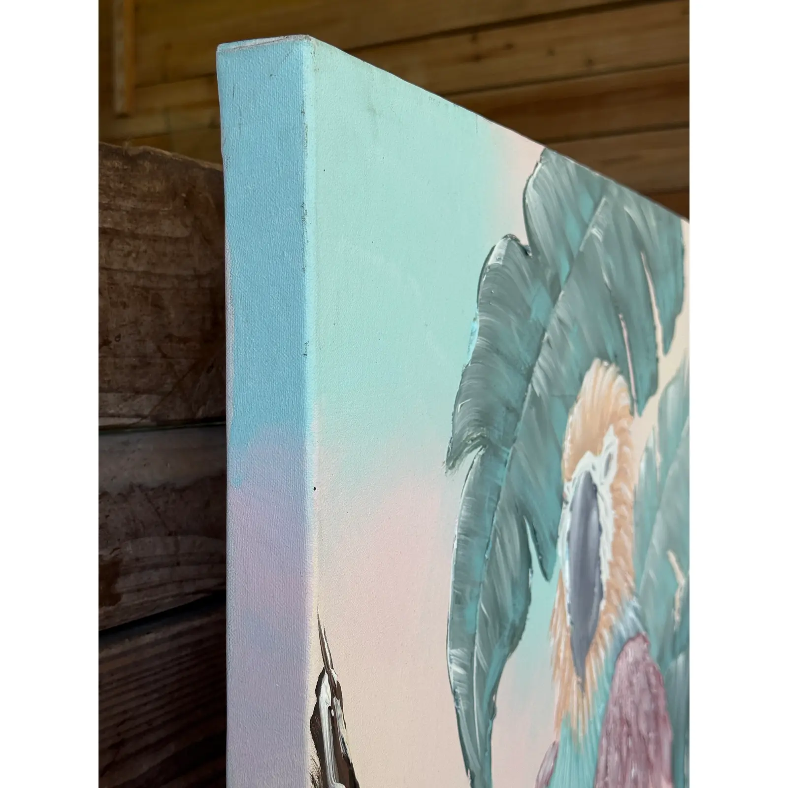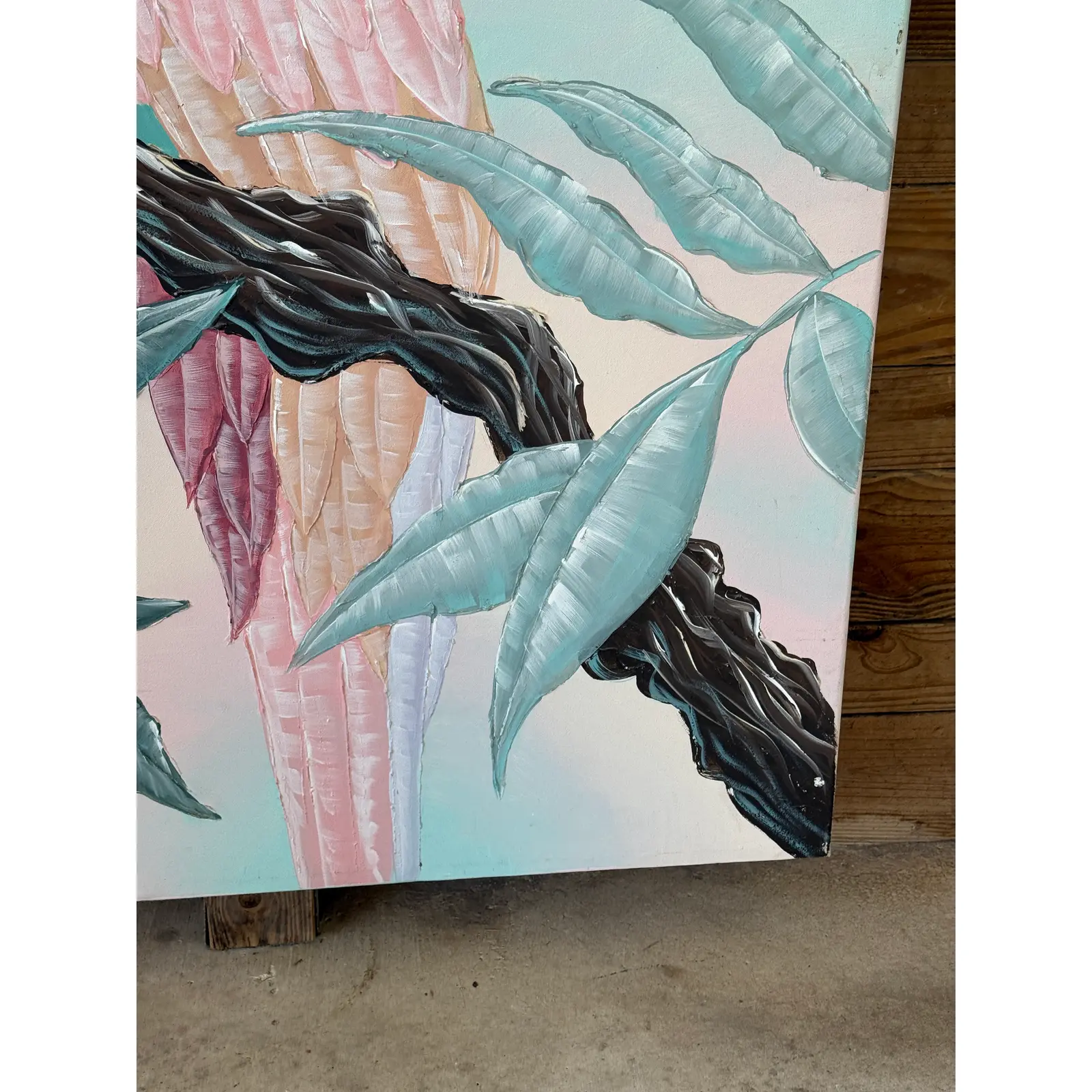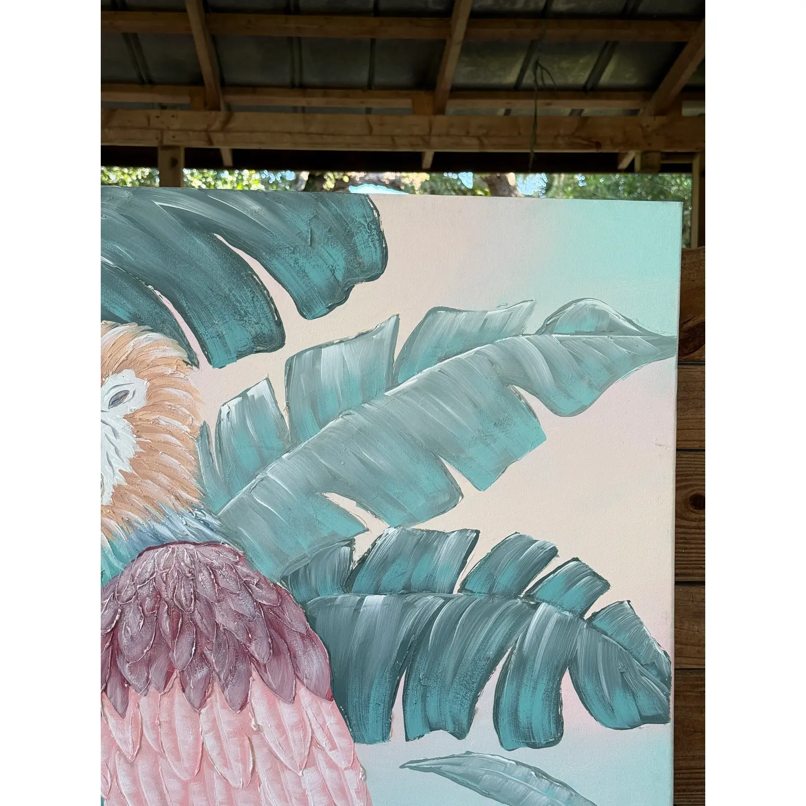 A vibrant and textured contemporary painting by artist Madore, featuring a majestic macaw perched among lush tropical foliage. Executed in a palette of soft pastels and rich teals, the piece captures both whimsy and boldness with its dimensional brushwork and large scale.