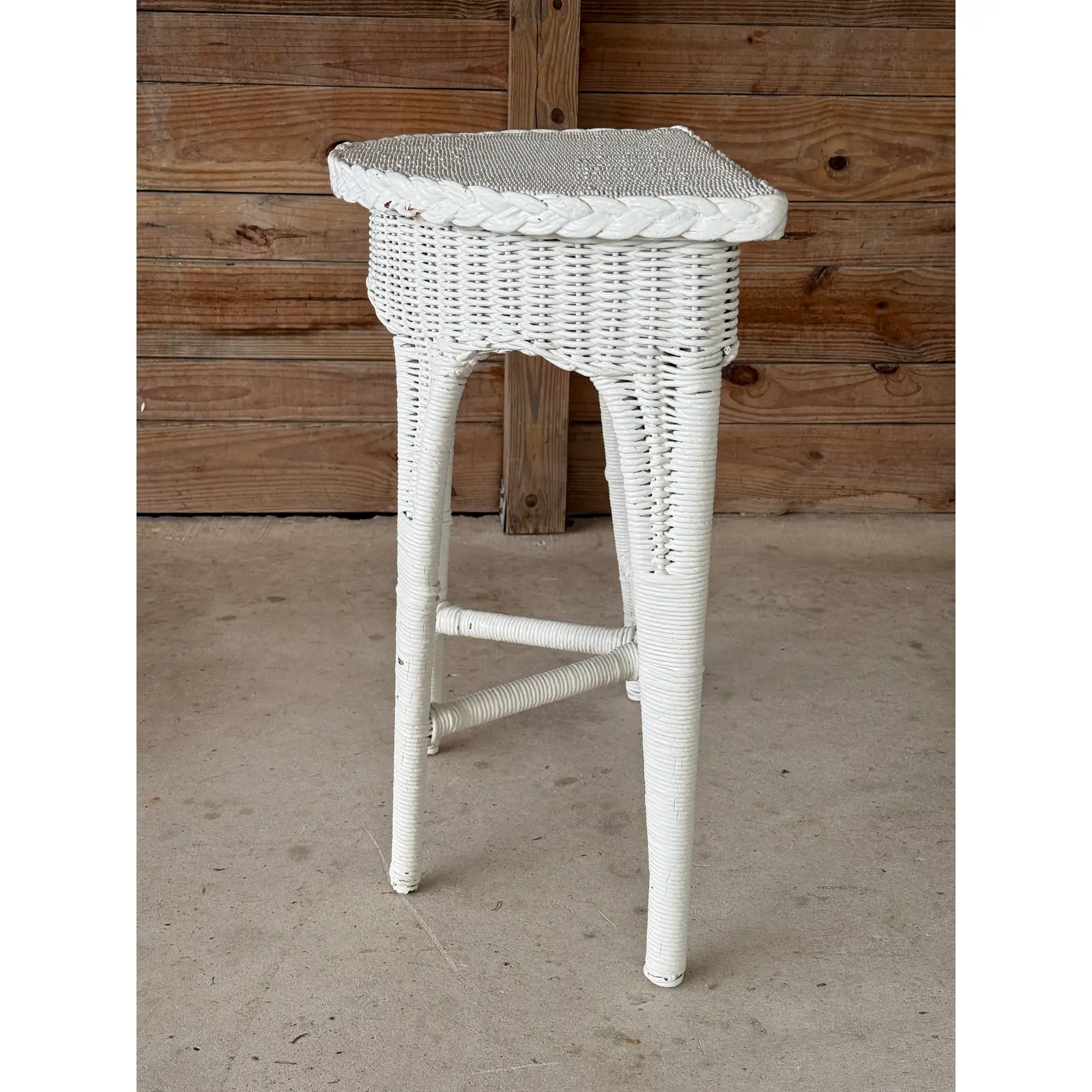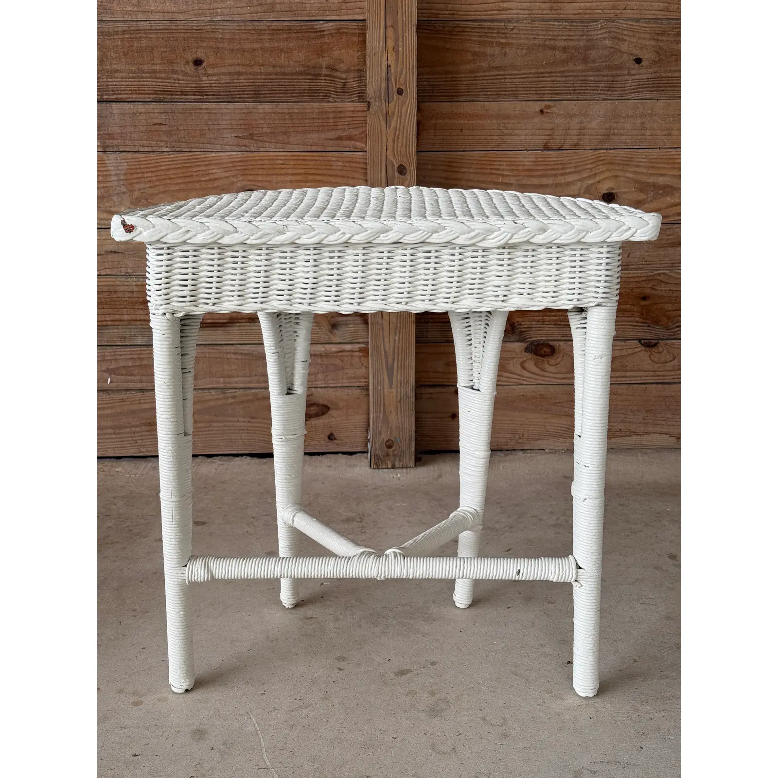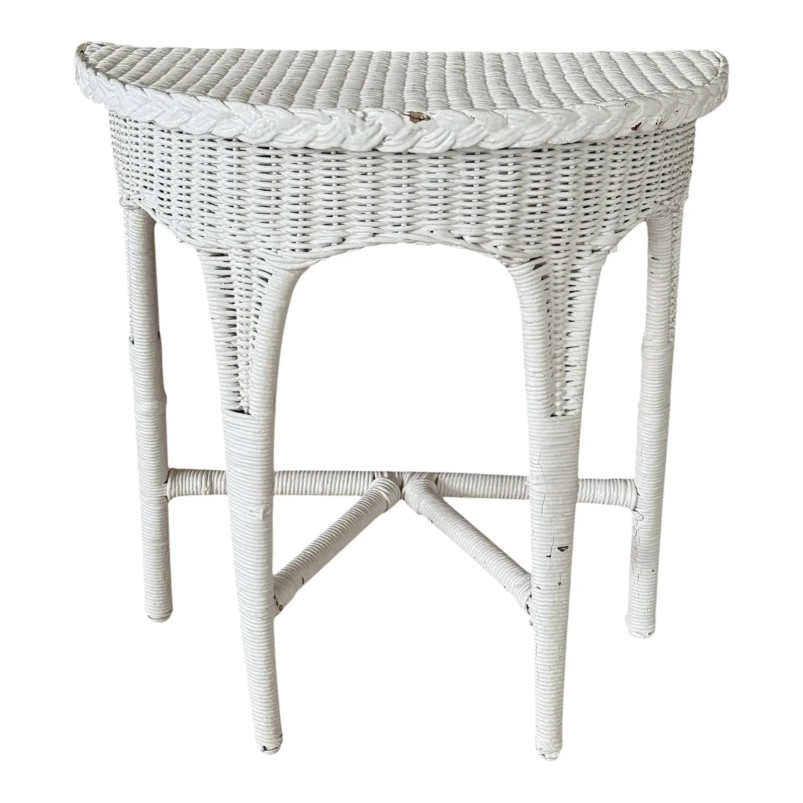 The form features tapered legs with stretchers and a braided rim detail, all consistent with early 20th-century production. Though painted long ago, the structure remains strong and intact, presenting beautifully with honest wear that speaks to its age and history.