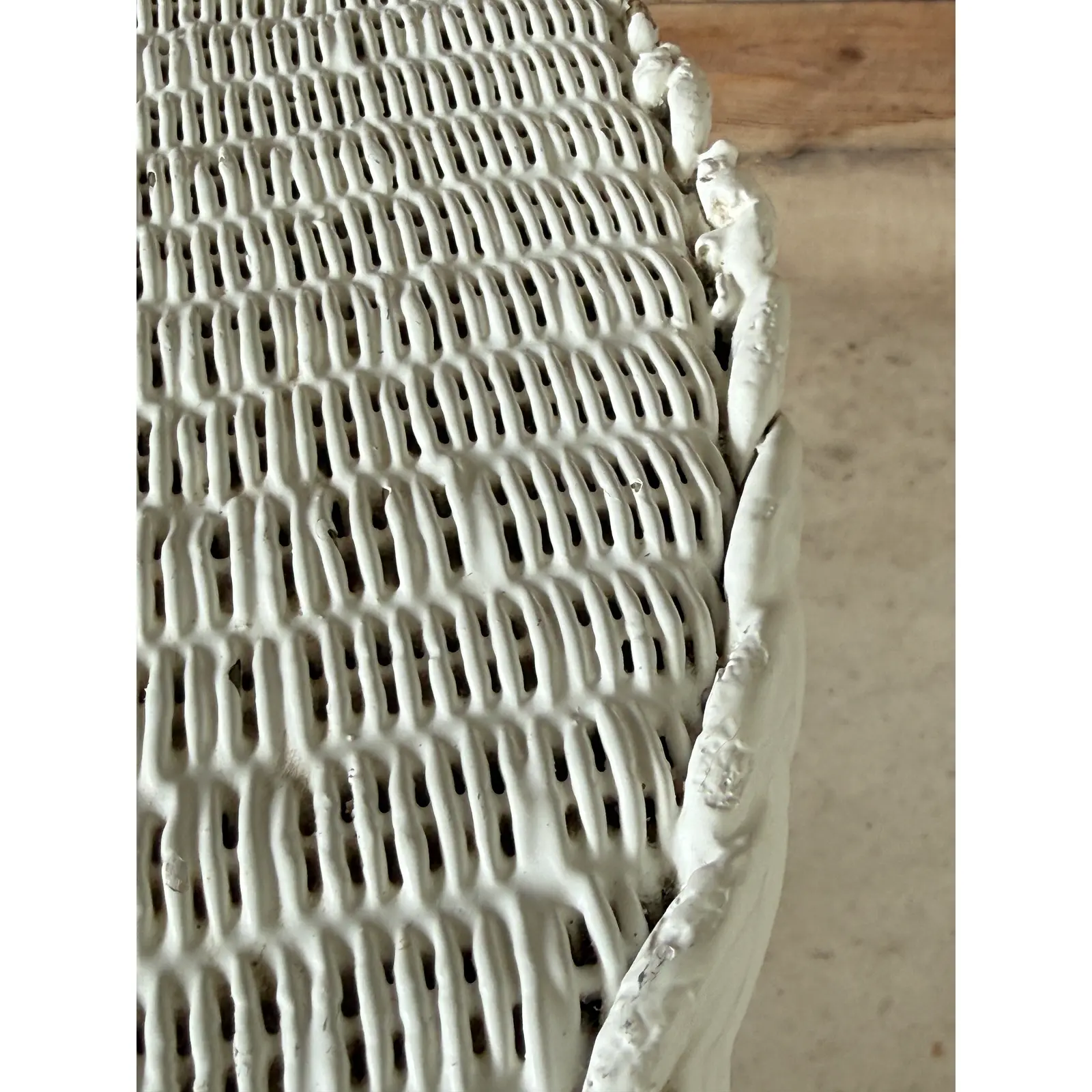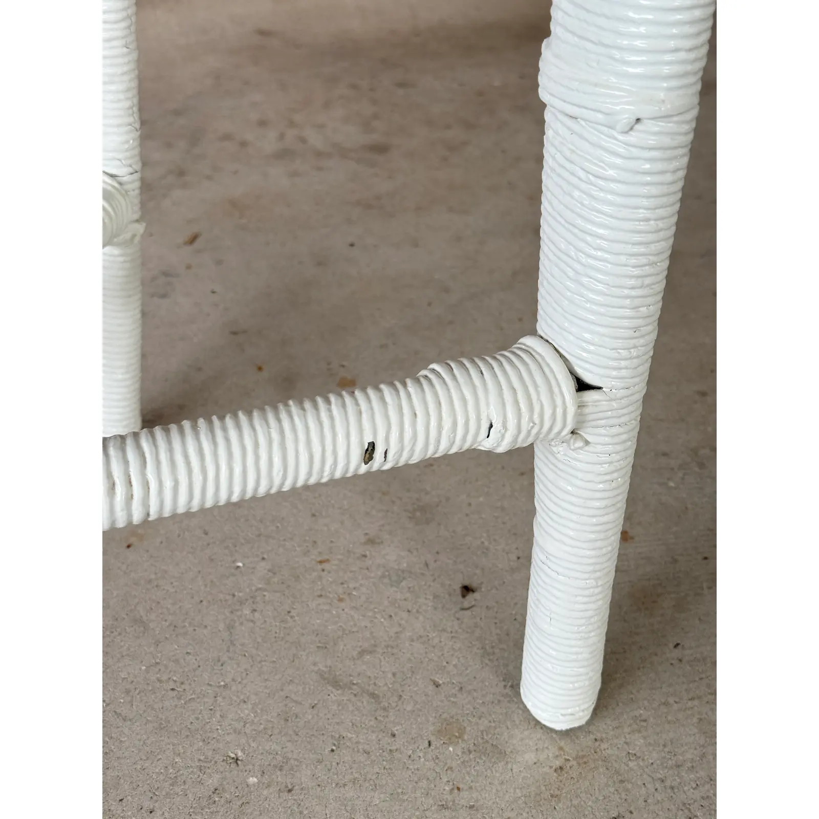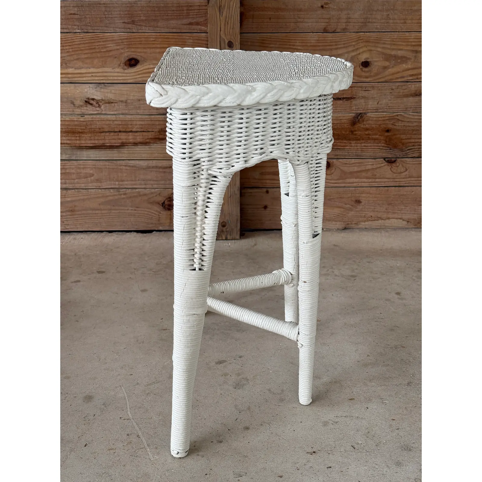 The form features tapered legs with stretchers and a braided rim detail, all consistent with early 20th-century production. Though painted long ago, the structure remains strong and intact, presenting beautifully with honest wear that speaks to its age and history.