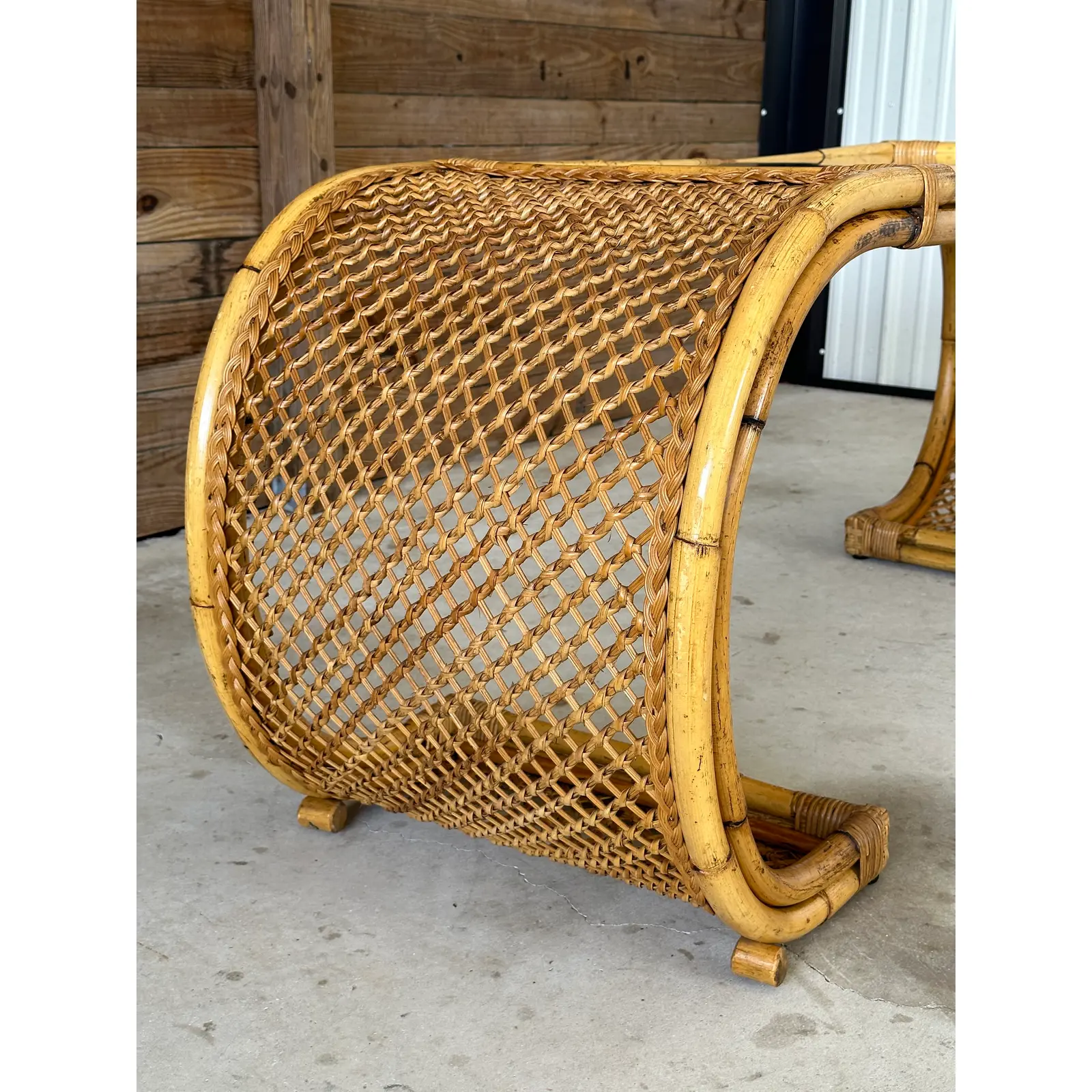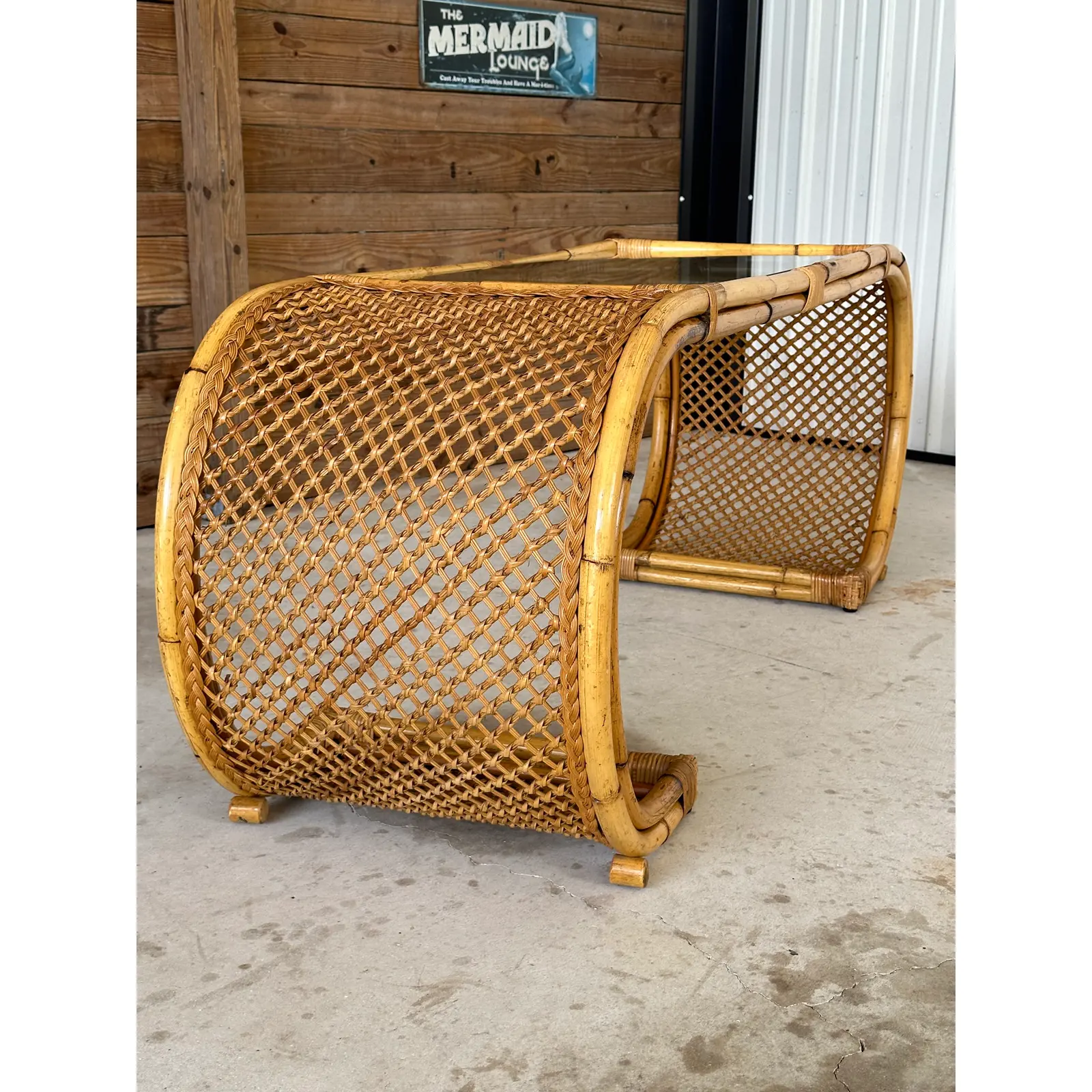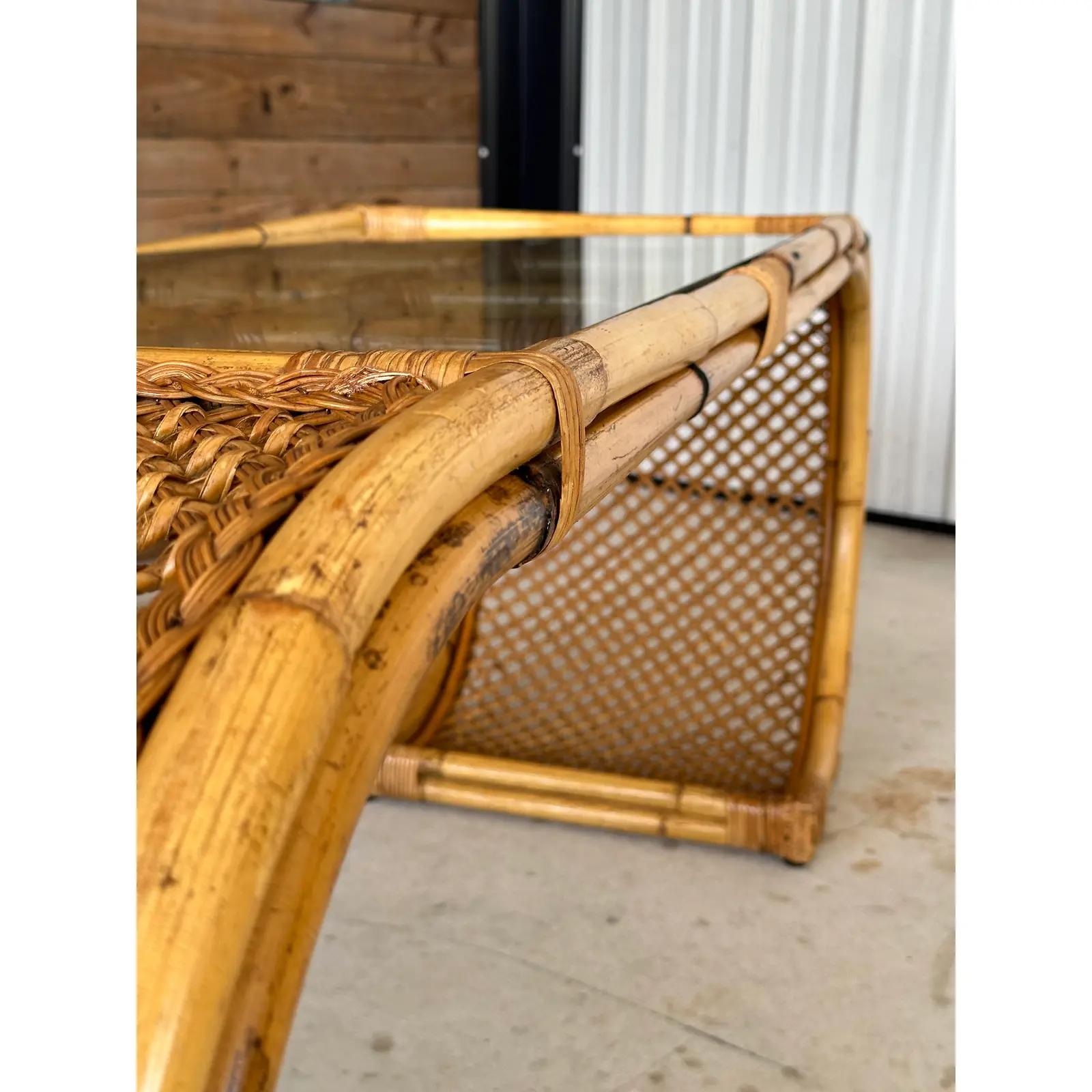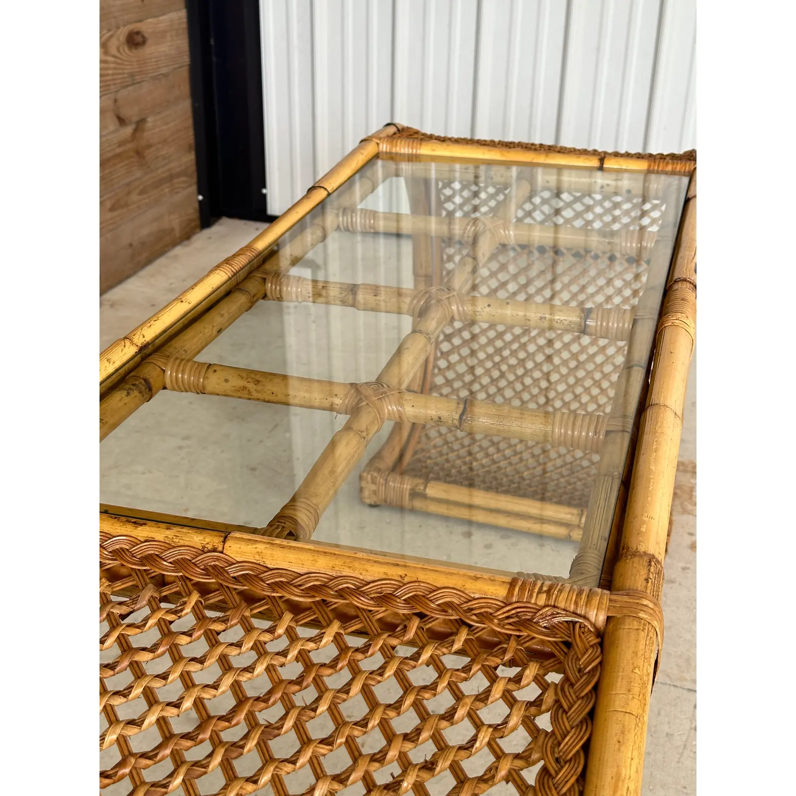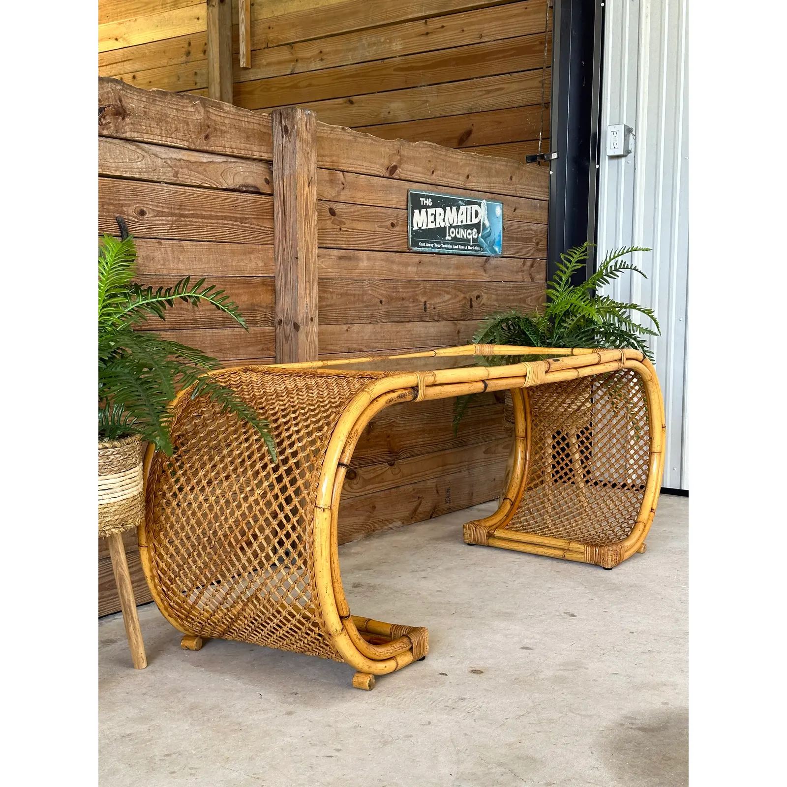 Fabulous vintage bamboo waterfall console with rattan grid sides, wicker braid trim and glass top made in Italy.