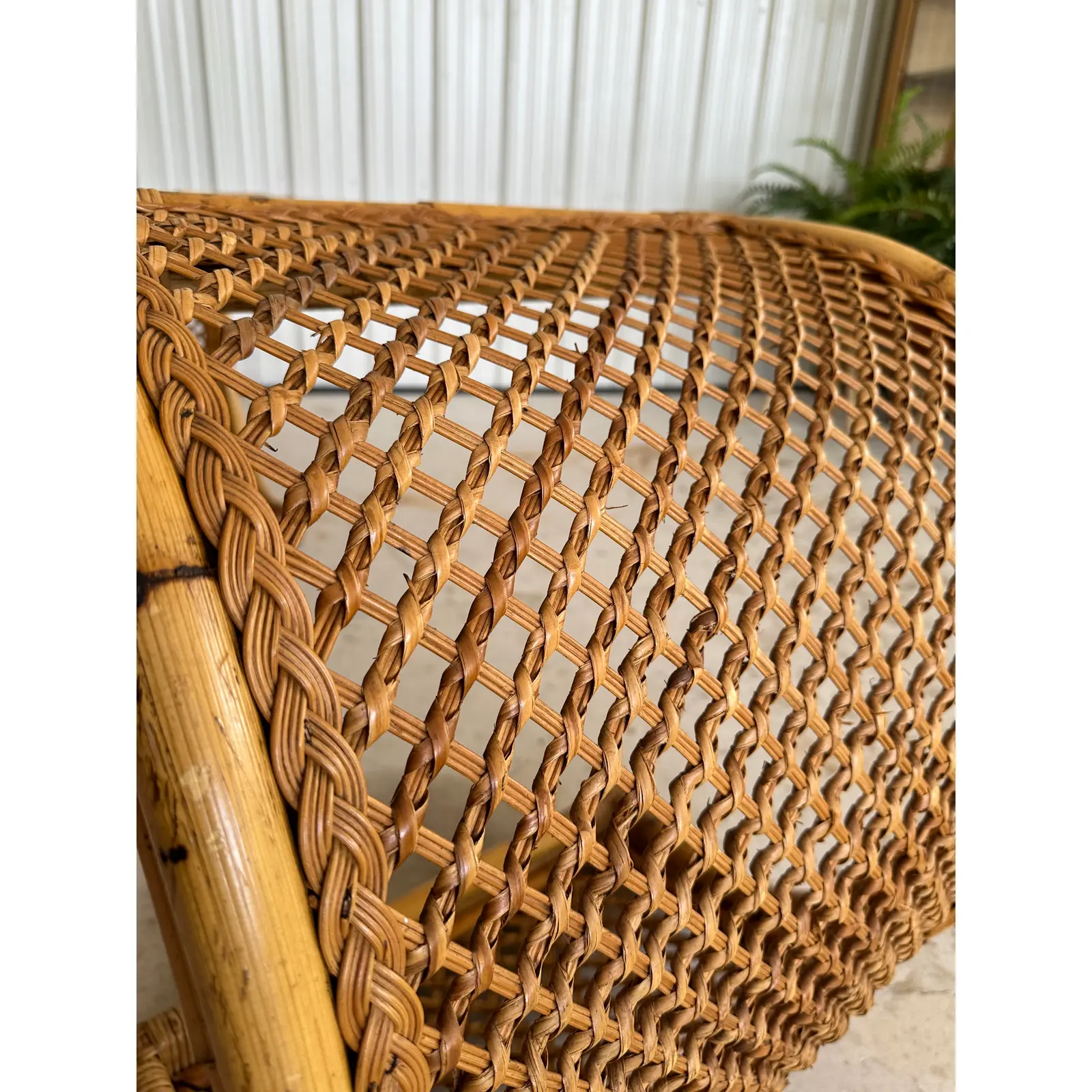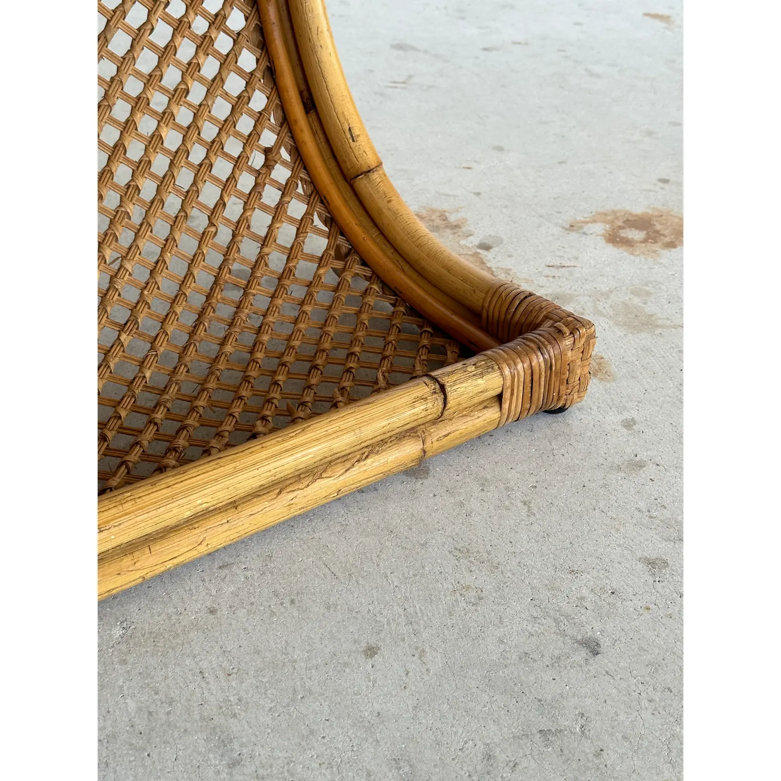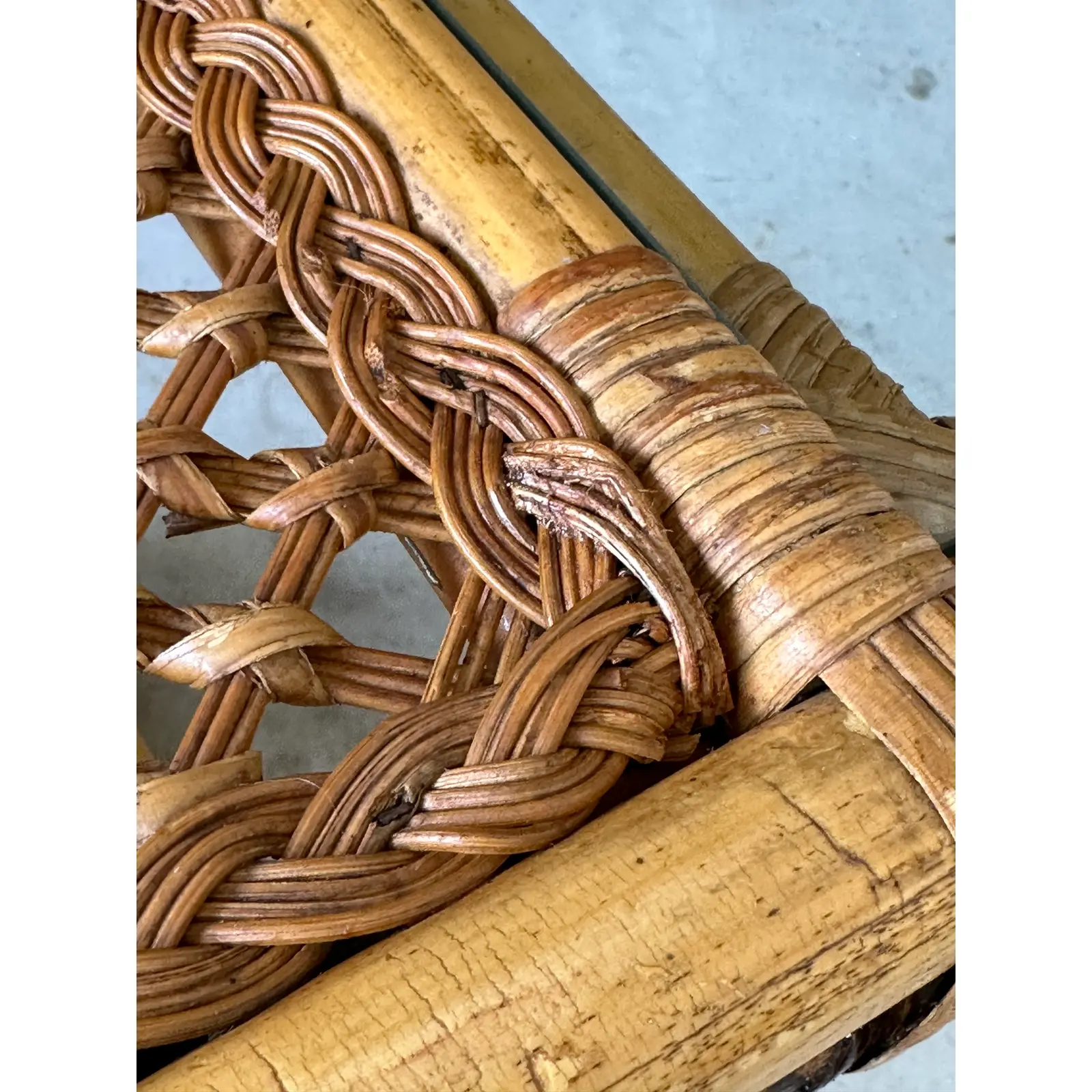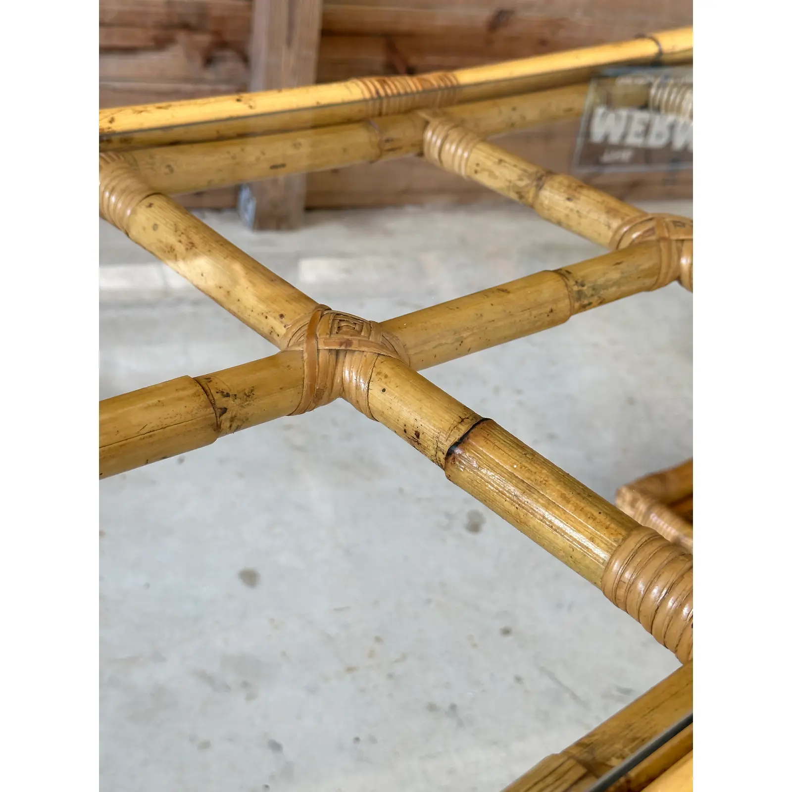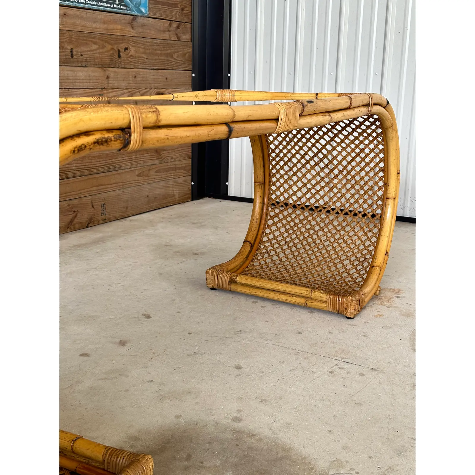 Fabulous vintage bamboo waterfall console with rattan grid sides, wicker braid trim and glass top made in Italy.