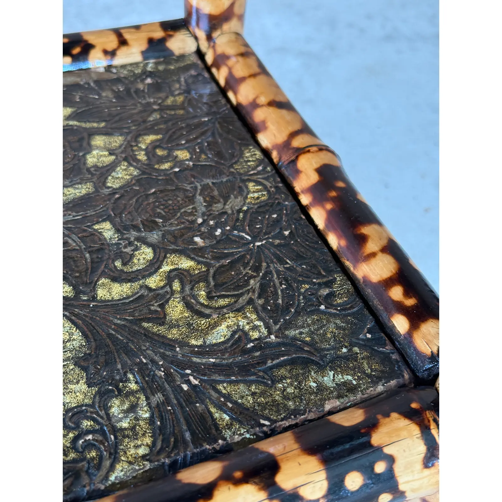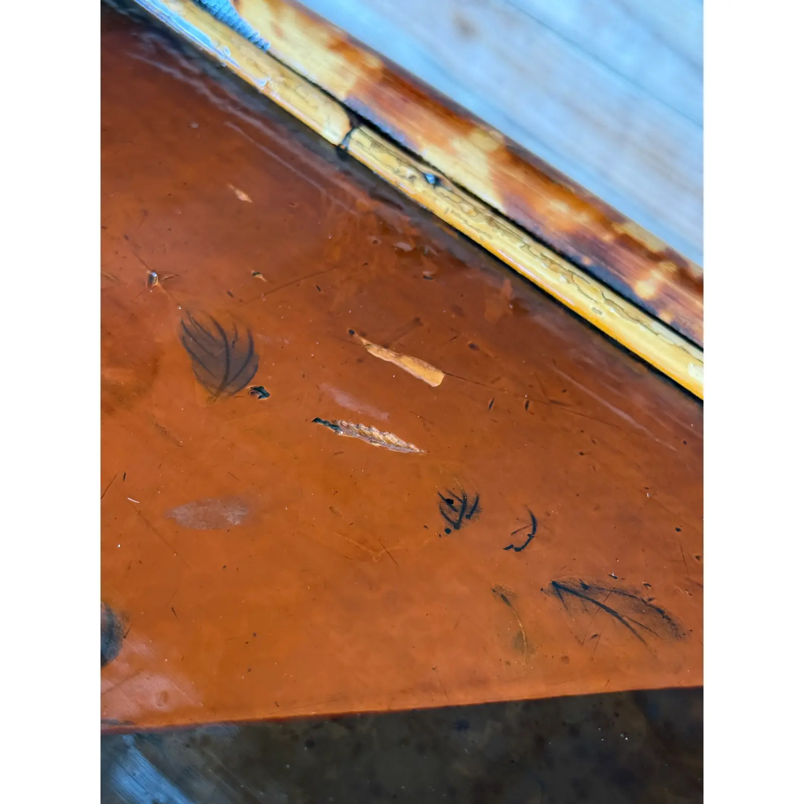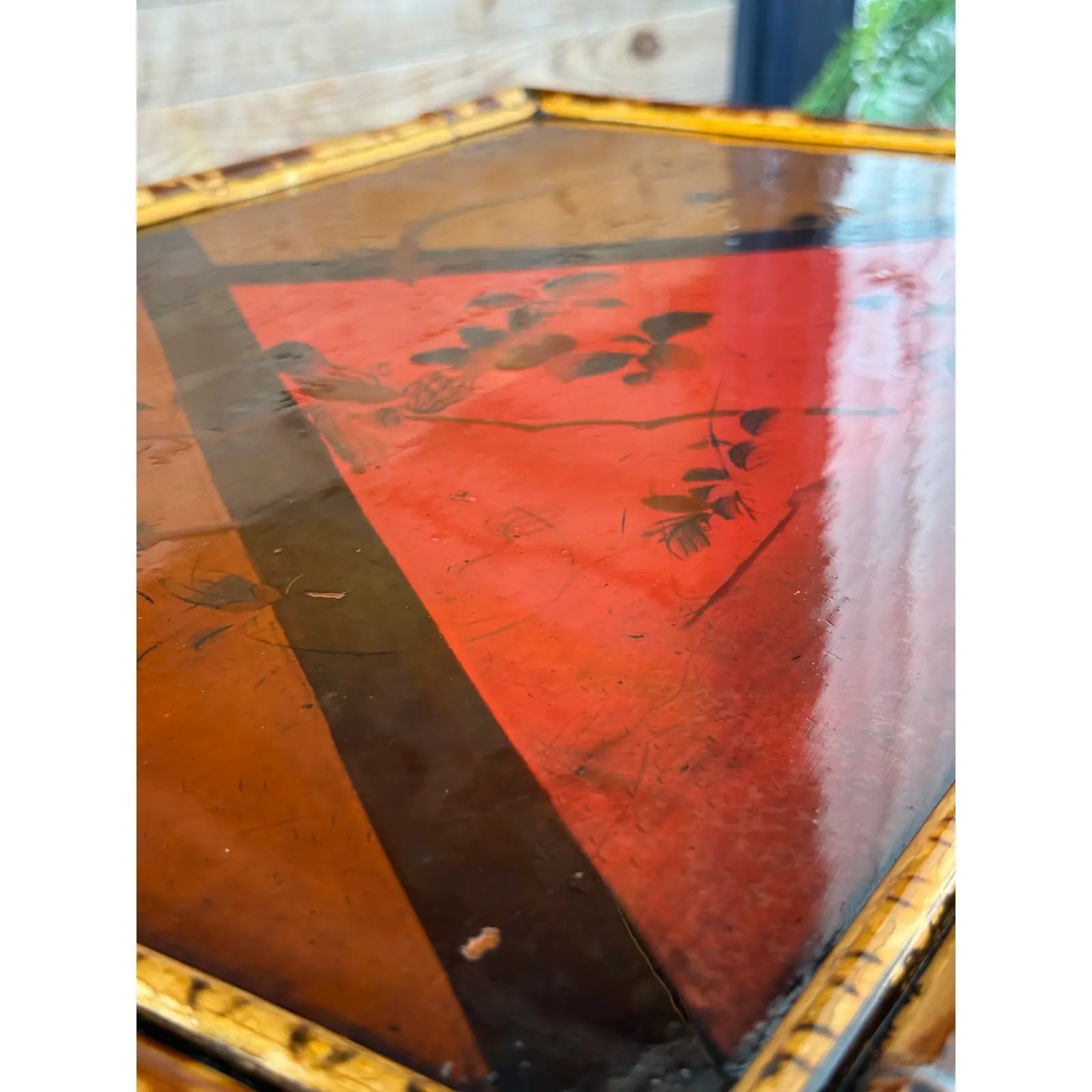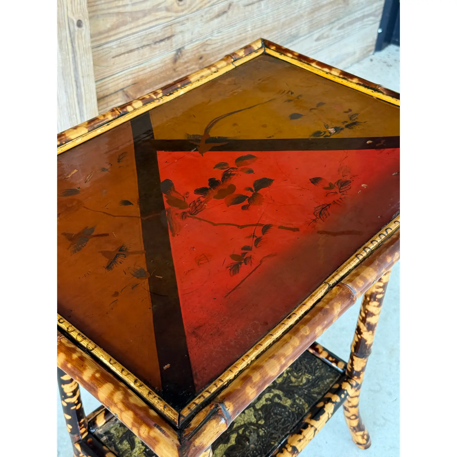A late 19th century Victorian lacquered scorched bamboo side table featuring a warm patina and classic Old World charm. The rectangular top showcases hand-painted lacquer panels in red, amber, and black with delicate floral and bird motifs, while the lower shelf is decorated with a gilt embossed floral design.