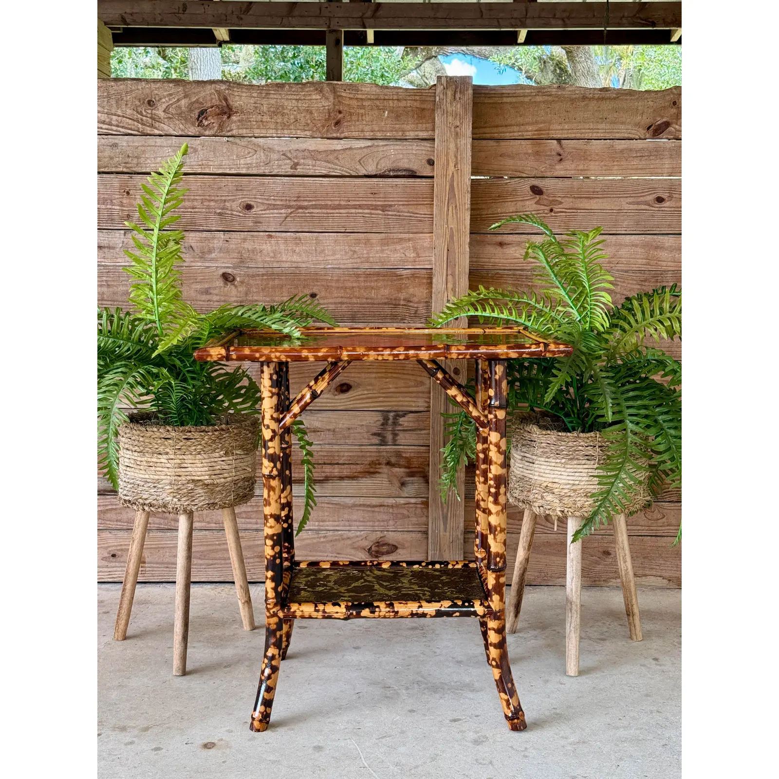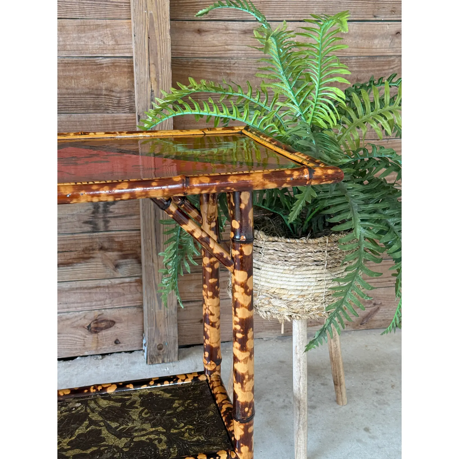 A late 19th century Victorian lacquered scorched bamboo side table featuring a warm patina and classic Old World charm.