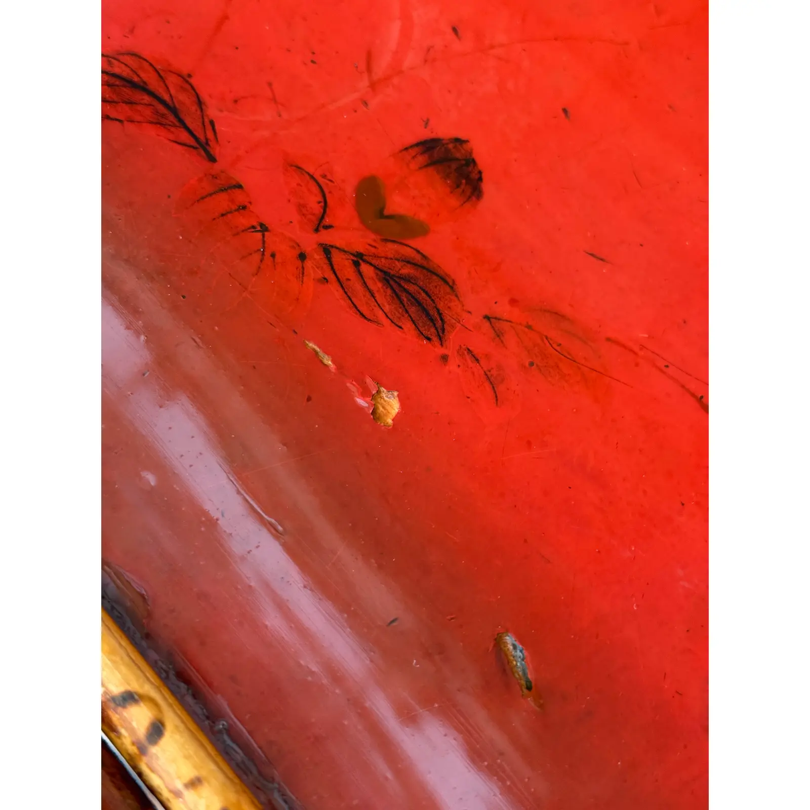 Recently restored, the piece still retains areas of wear and imperfections consistent with age and use, including surface losses to the lacquer panels and a natural crack in the bamboo.