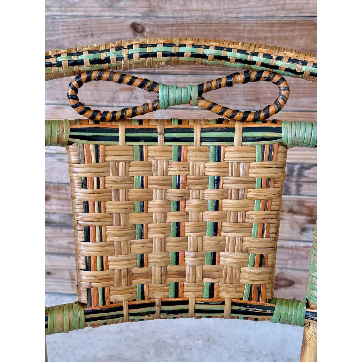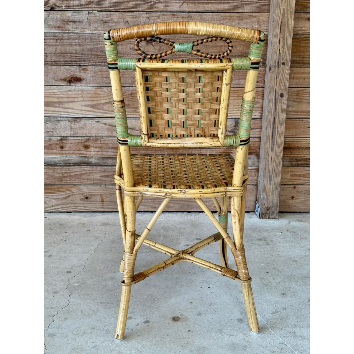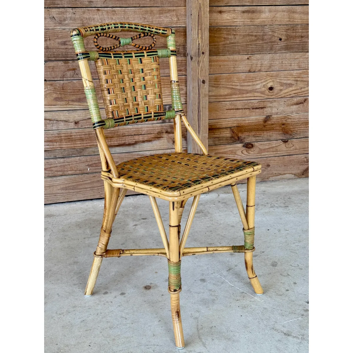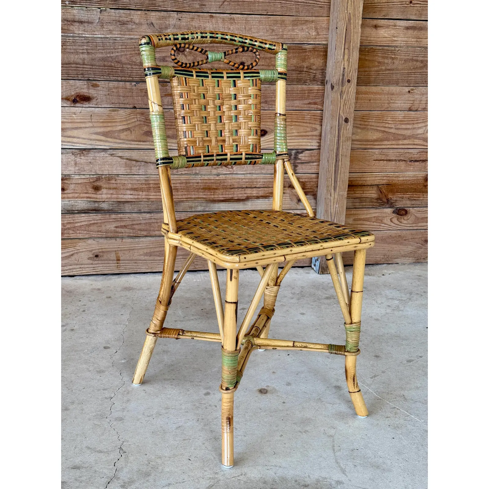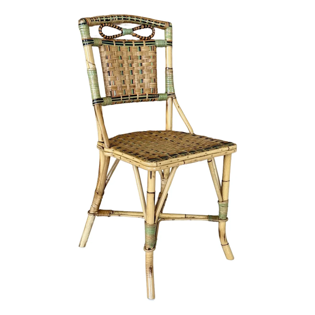 Charming Mid-20th Century rattan bistro side chair featuring colorful woven accents and a sculptural bow detail at the top. A light refinishing has been completed to preserve the original finish while protecting its coastal character.