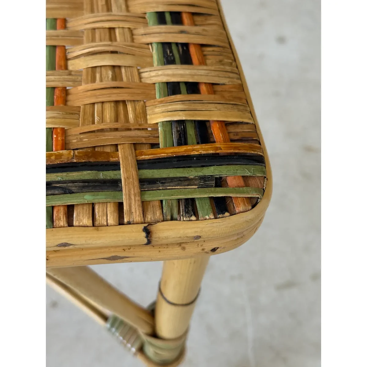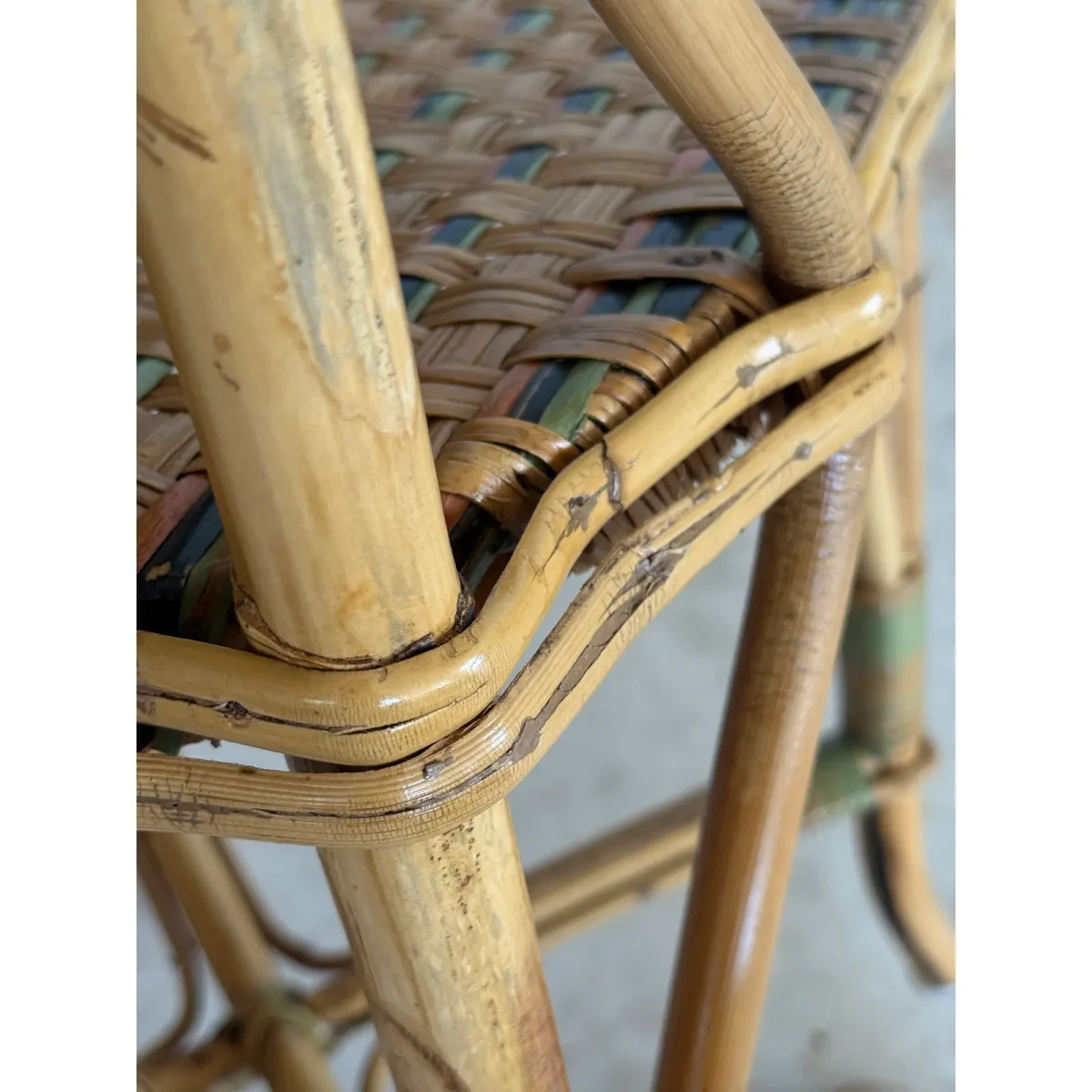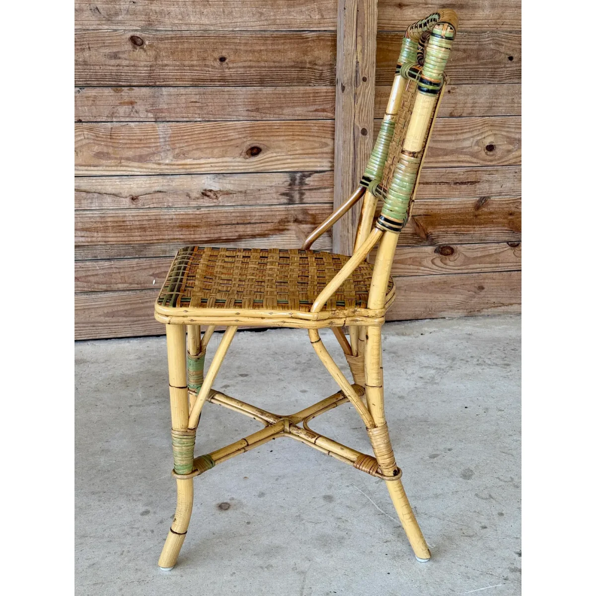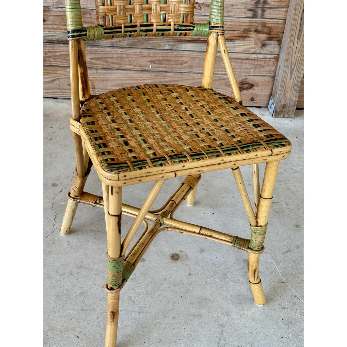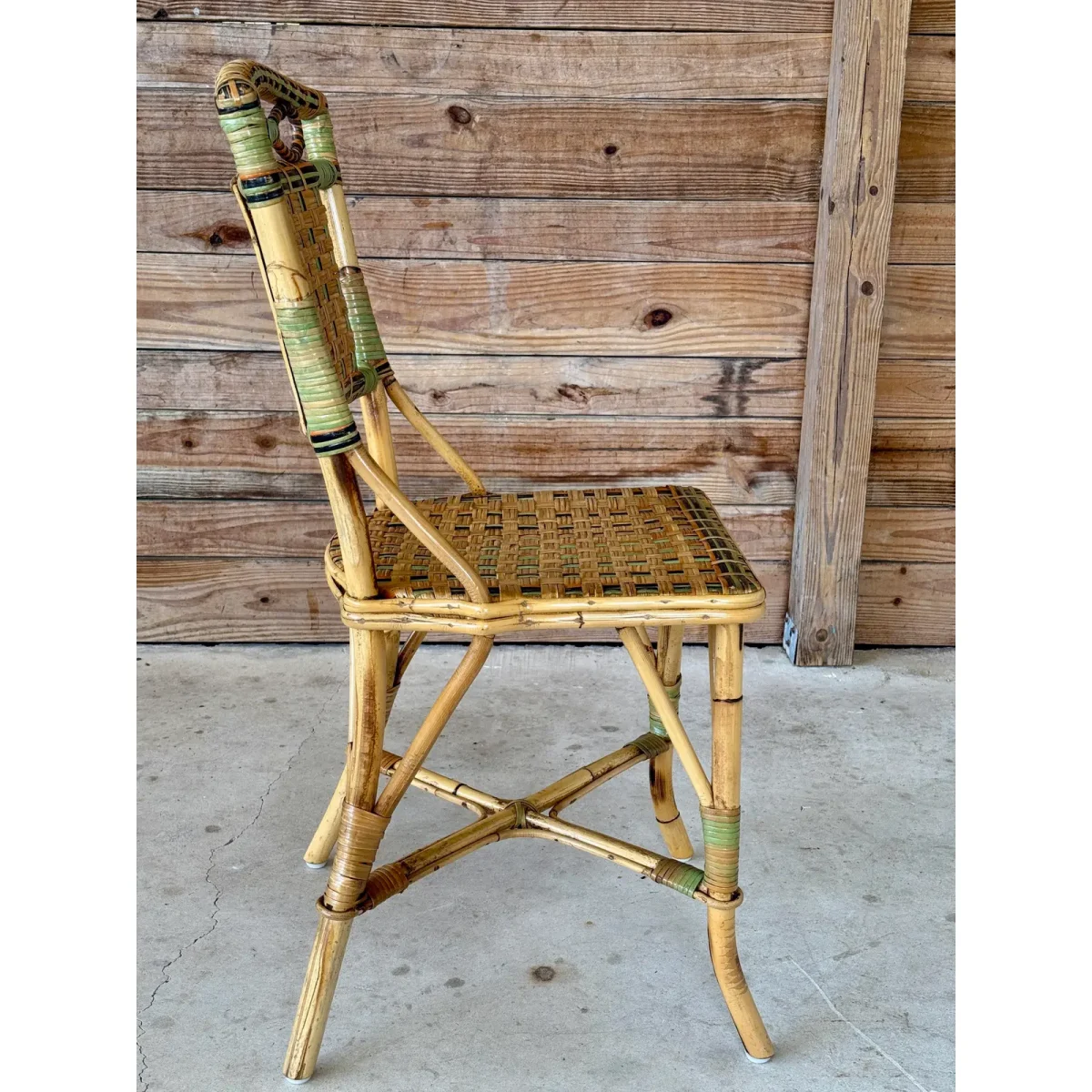 Charming Mid-20th Century rattan bistro side chair featuring colorful woven accents and a sculptural bow detail at the top. A light refinishing has been completed to preserve the original finish while protecting its coastal character.