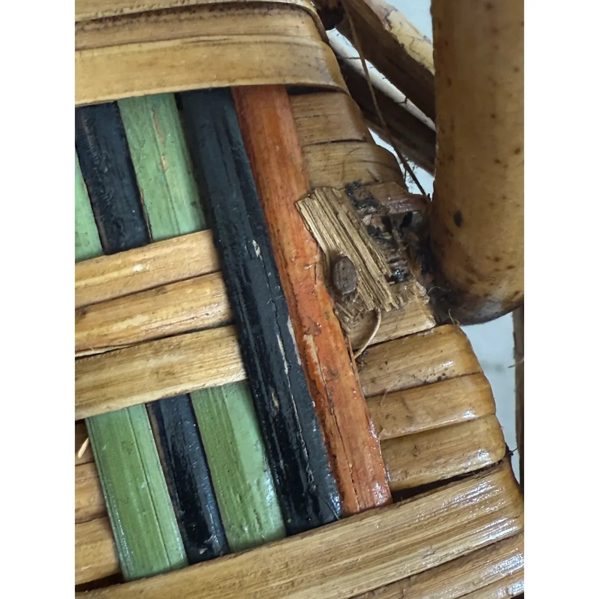 A small area on top of seat where the wrapping is scarce along with an area in back on seat with it’s missing a wrapping. Chair has had a light refinishing and lacquer finish to preserve and enhance its character.