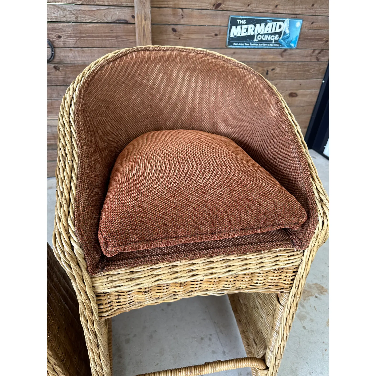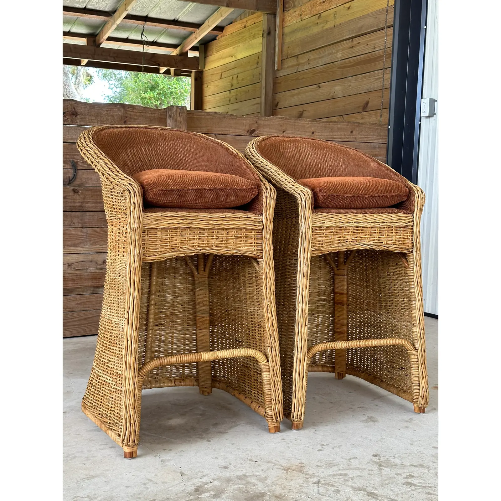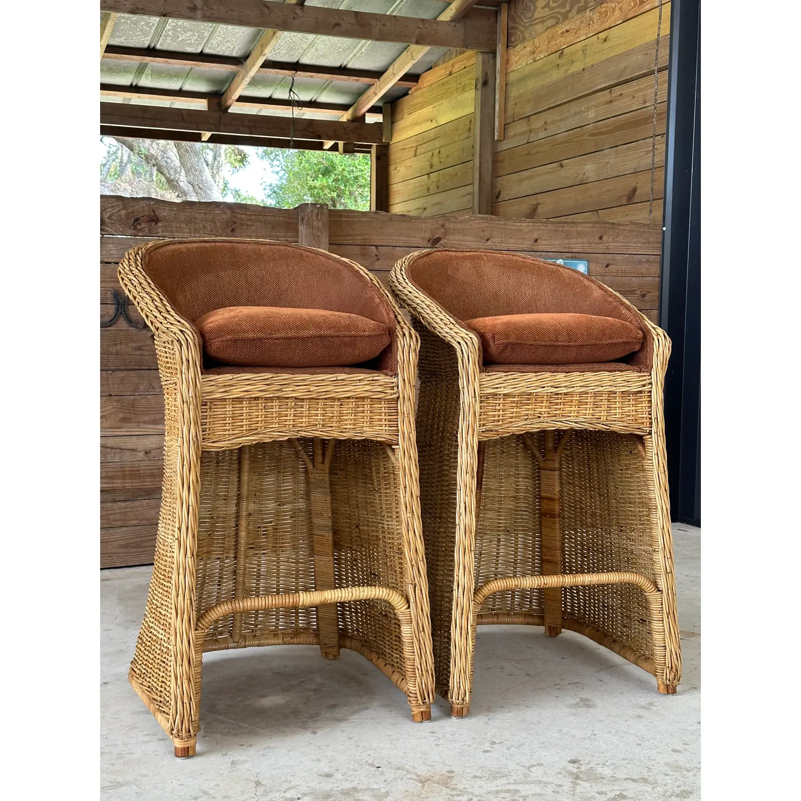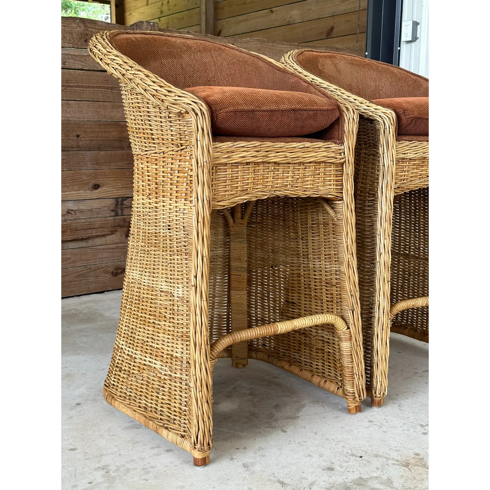 Fabulous pair of vintage large braid rattan bar stools that have been previously upholstered. Stools are part of an estate matching the dining chairs I will have listed as well. These are tall bar stools with the rattan frames being refinished and in excellent condition.