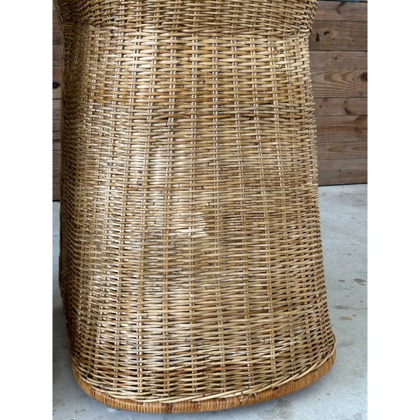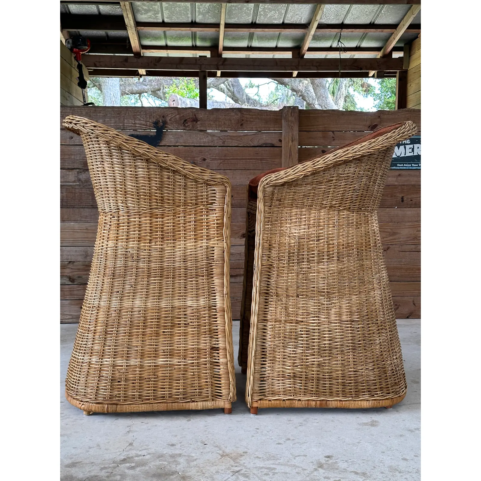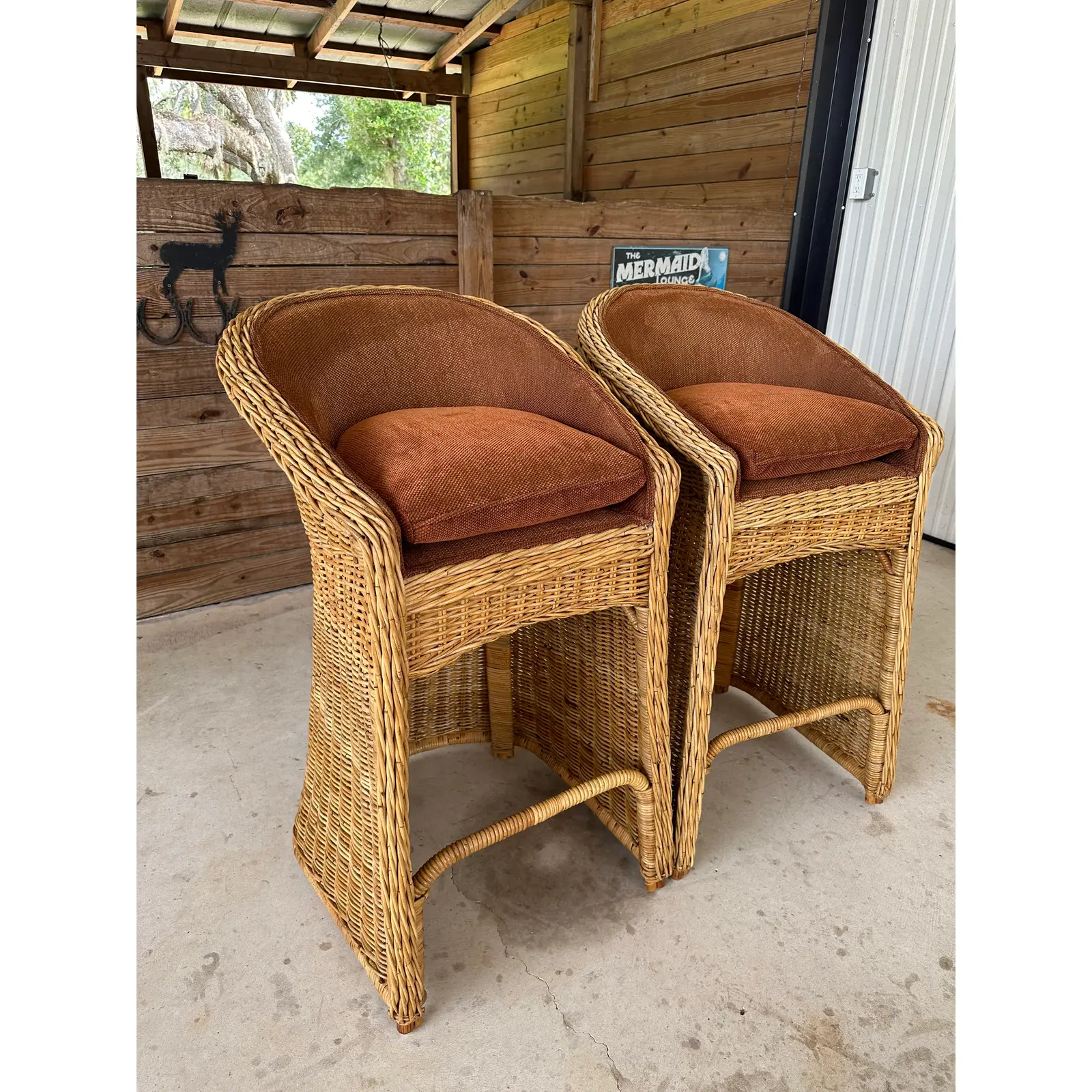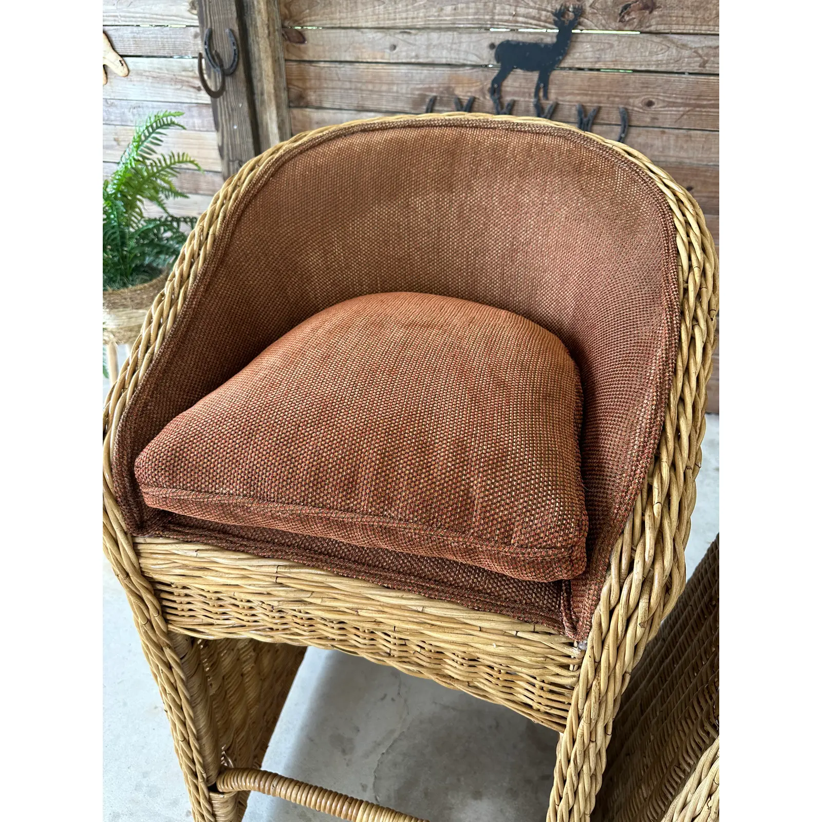 Fabulous pair of vintage large braid rattan bar stools that have been previously upholstered. Stools are part of an estate matching the dining chairs I will have listed as well. These are tall bar stools with the rattan frames being refinished and in excellent condition.