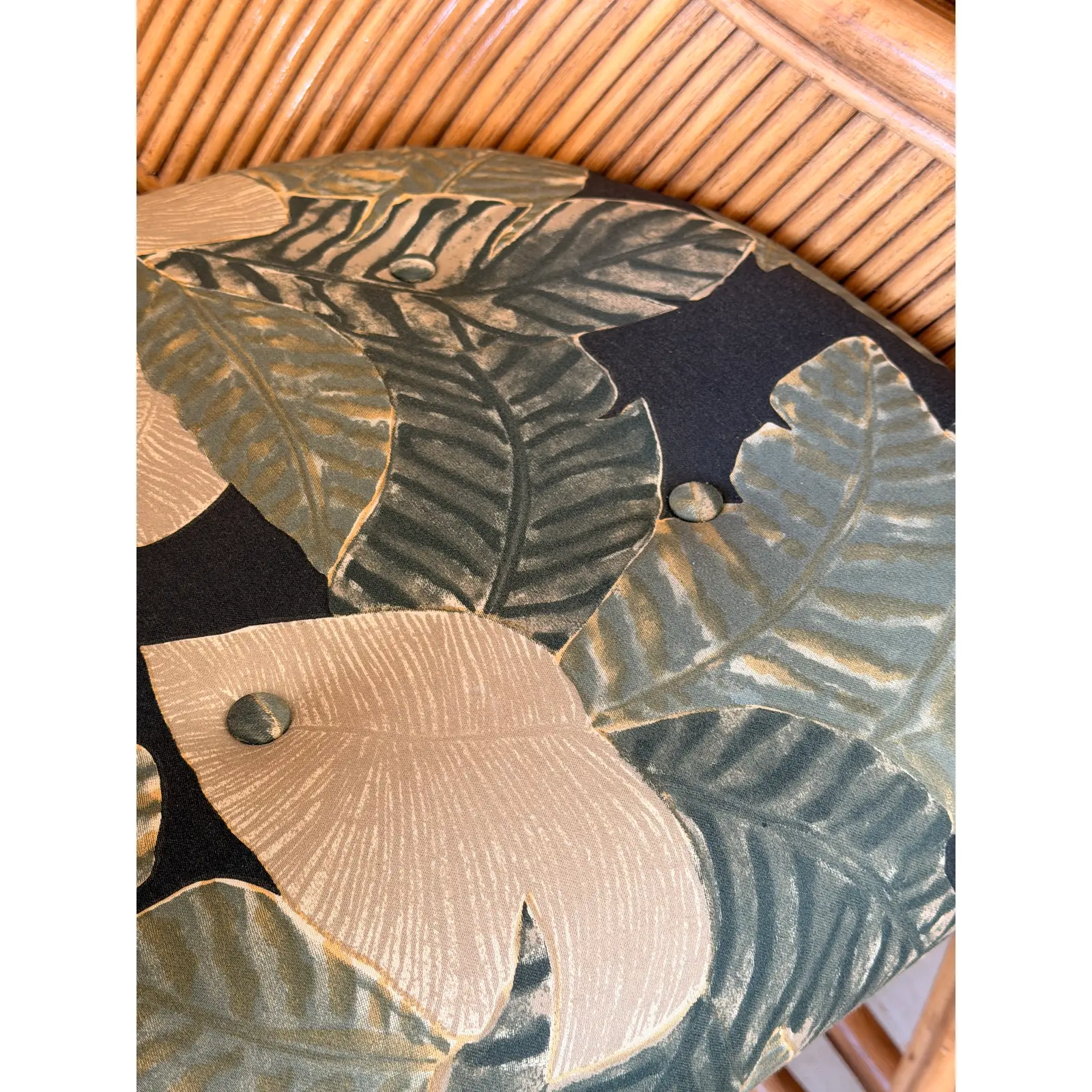 The stools retain their original rattan and cane construction, showing warm, natural patina and minor wear consistent with age, adding to their authentic vintage character. The seat cushions are not original and were added recently; upholstered in a leafy tropical fabric that complements the rattan beautifully and enhances the relaxed, coastal vibe of the set.