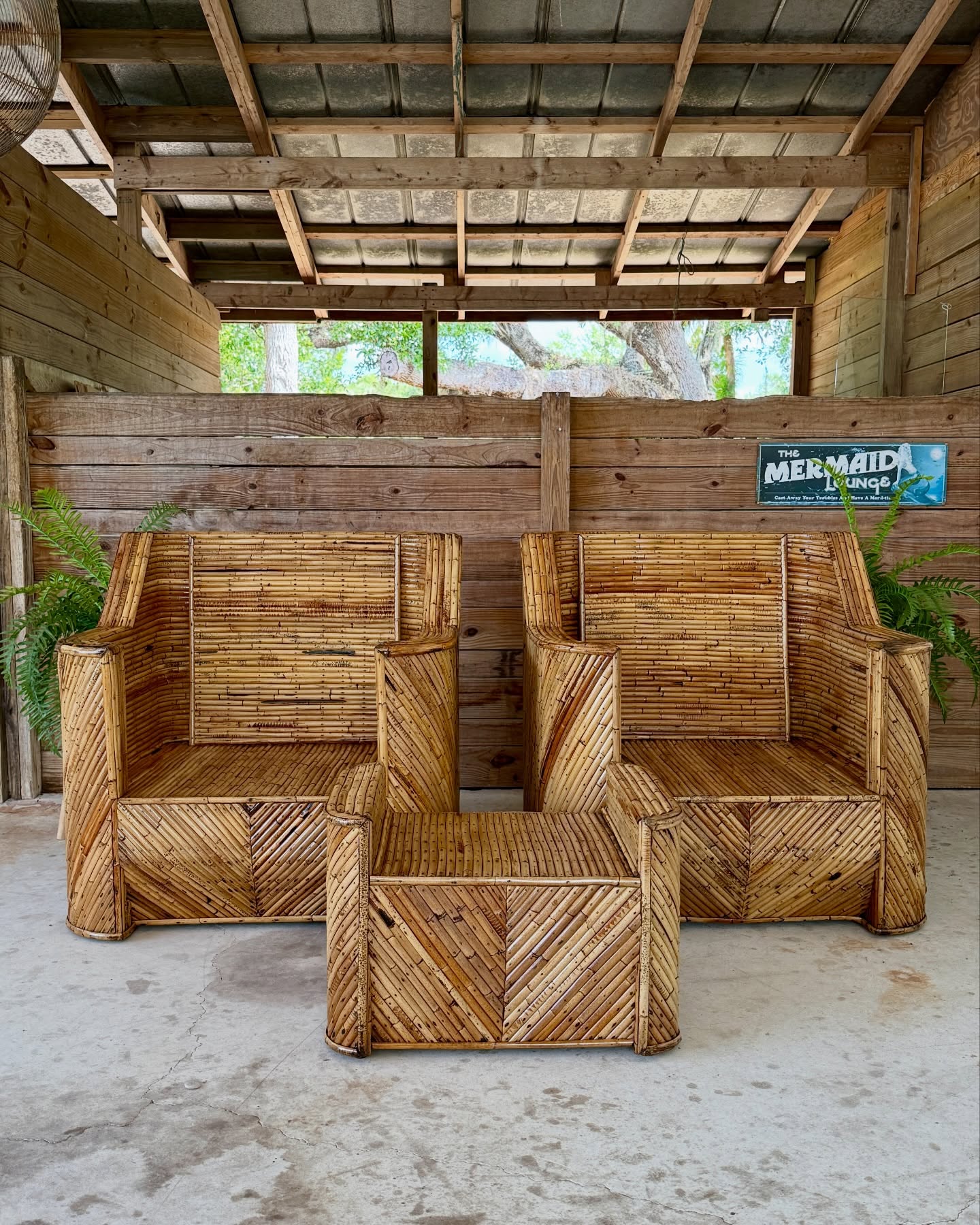 Cushions have some wear and stains. Rattan frame is in excellent condition with all breaks being repaired.