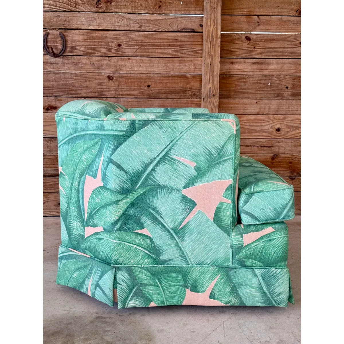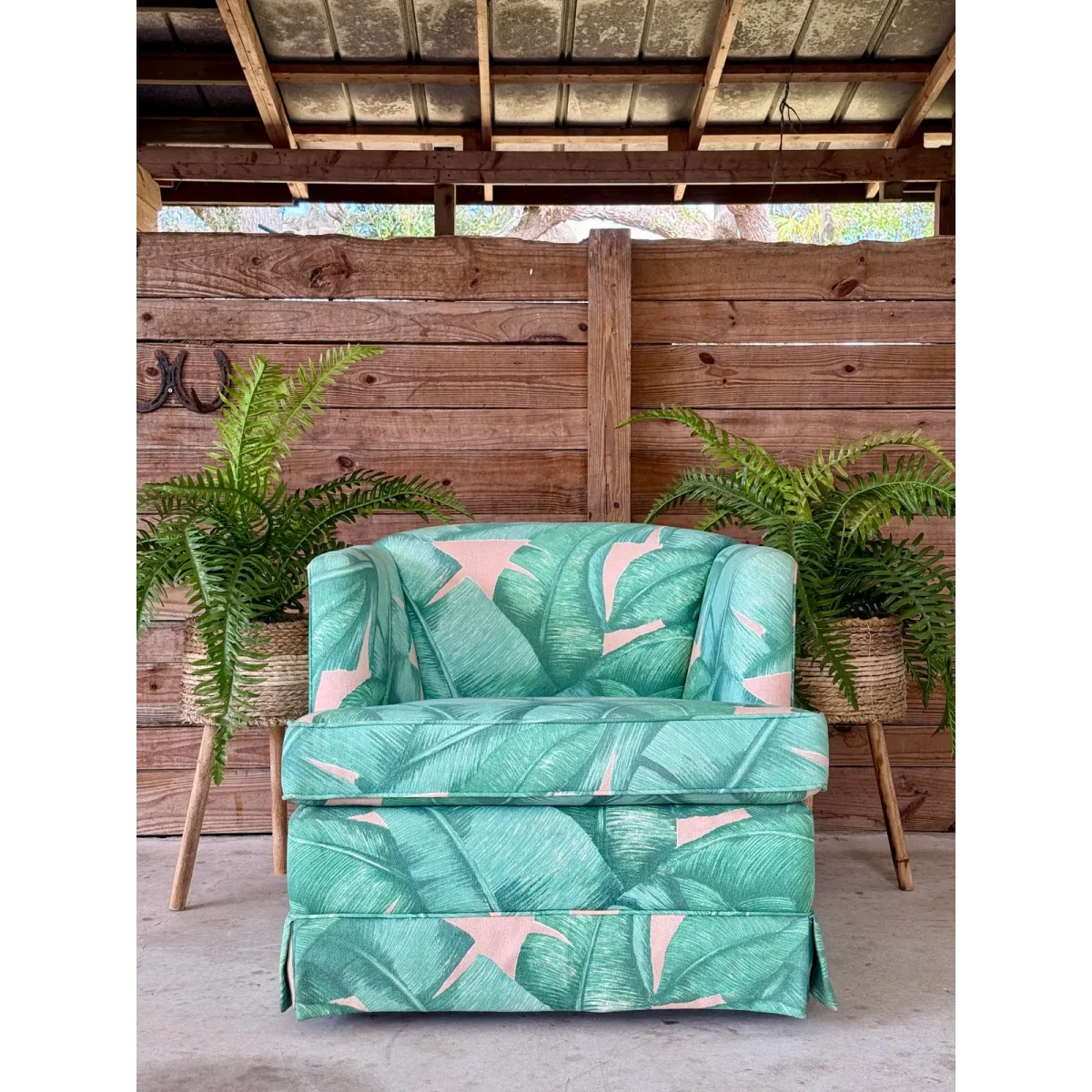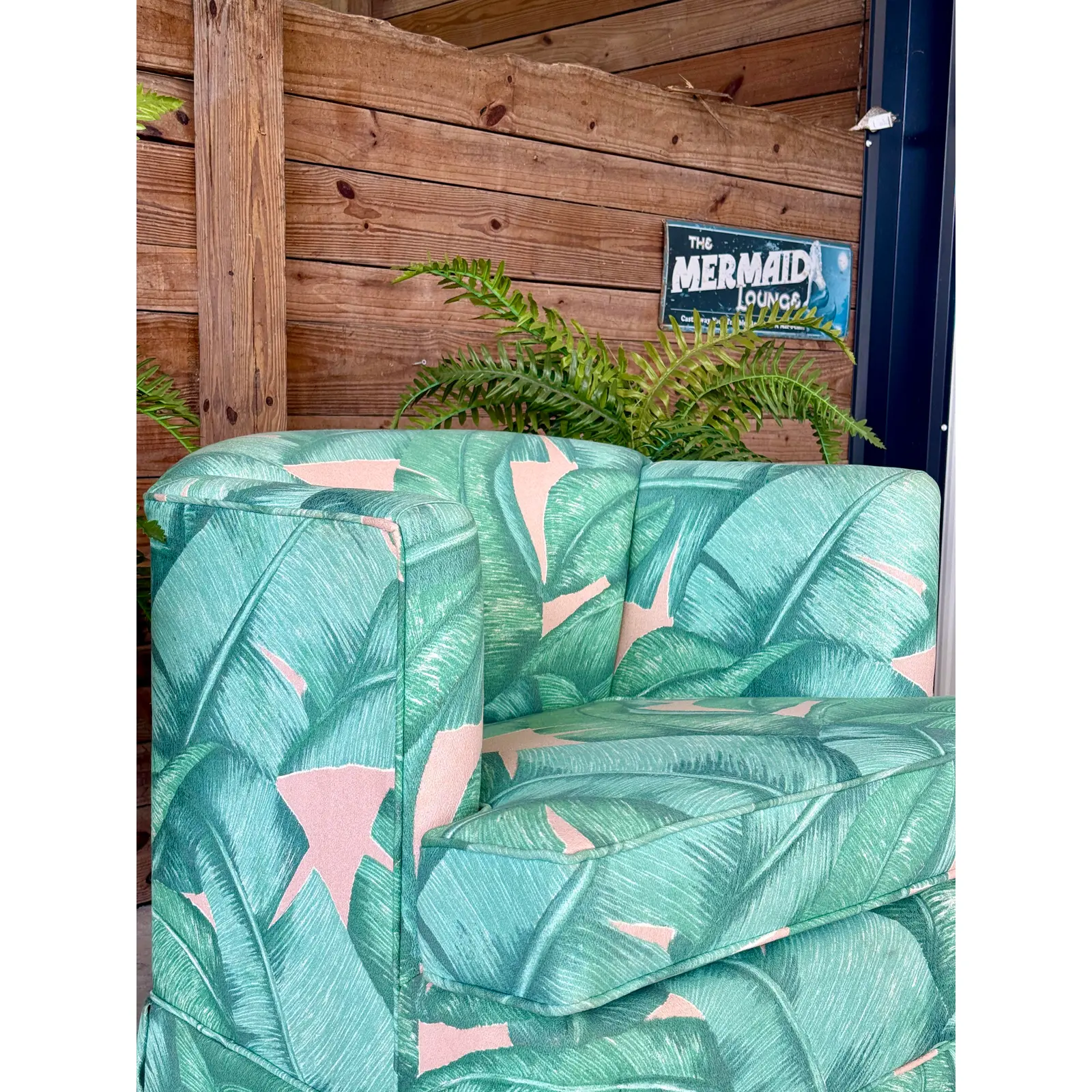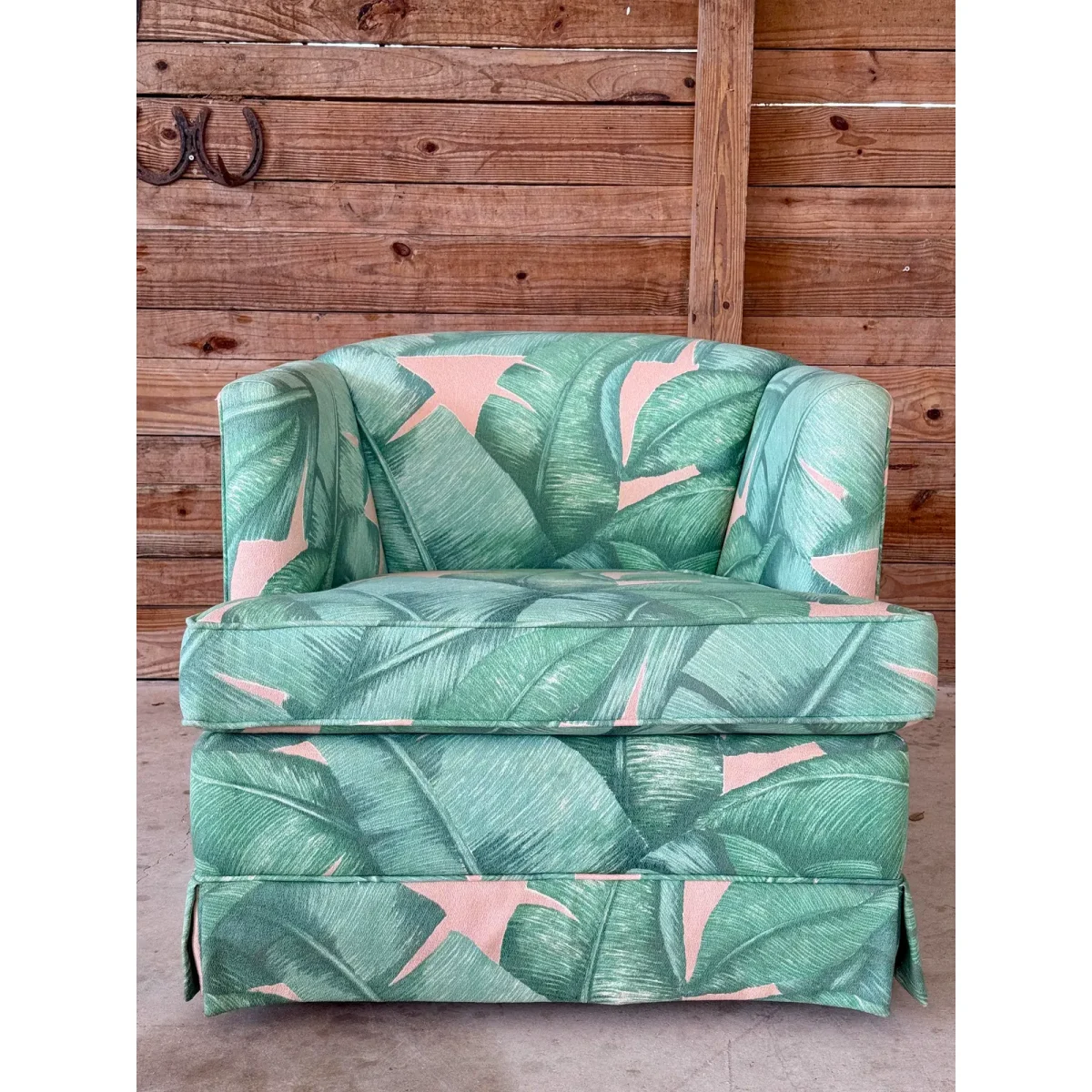 Elevate your space with this vintage Coastal Regency swivel tub chair, crafted by Southern Comfort of Clearwater, Florida. Original upholstery in a bold tropical banana leaf fabric in shades of green and blush pink, this chair brings a touch of Old Florida charm and coastal chic to any room.