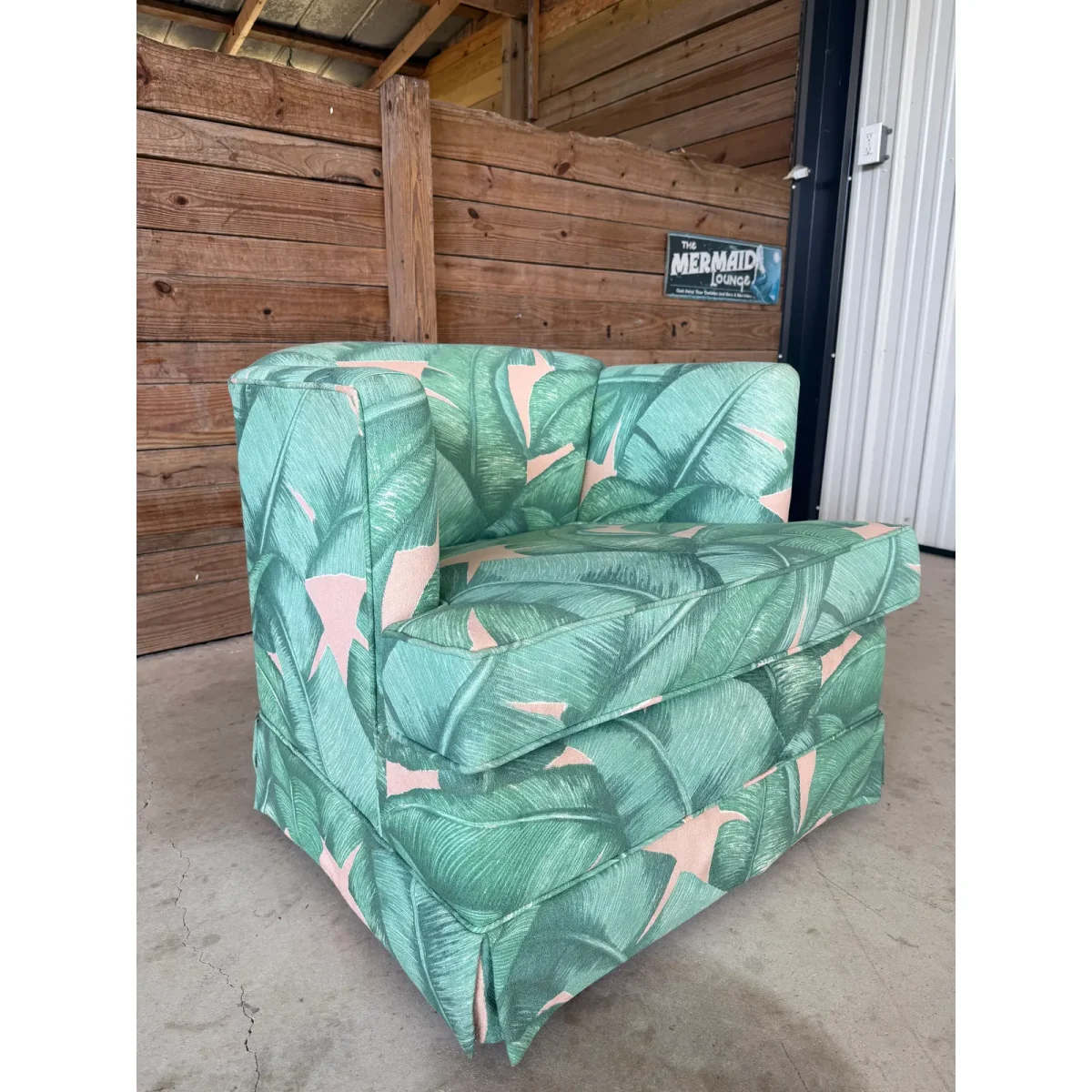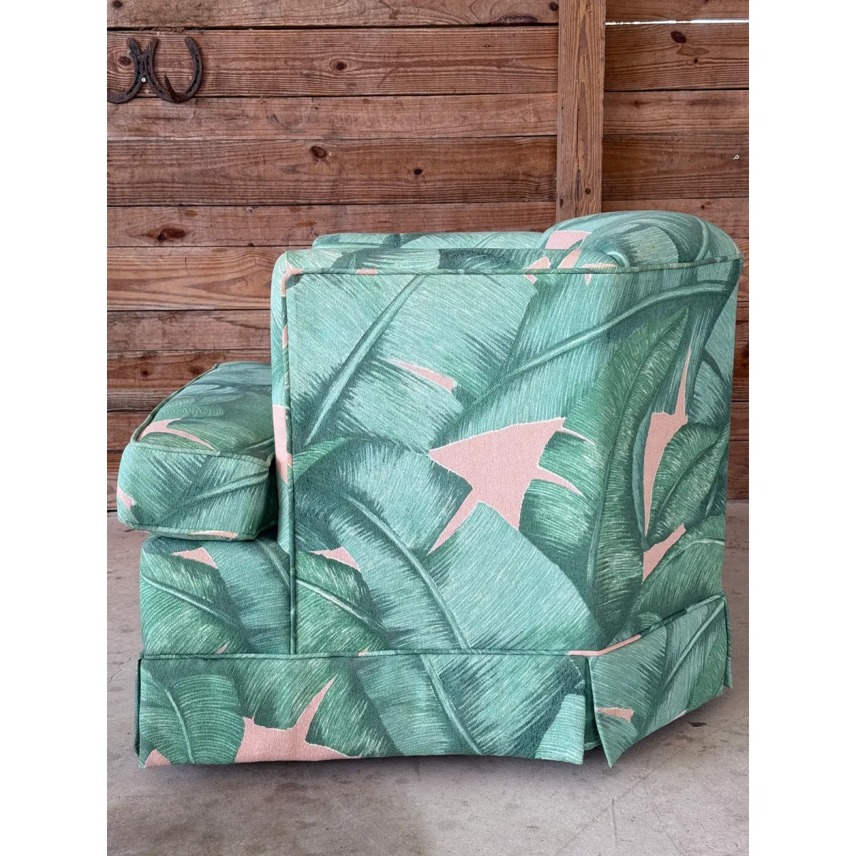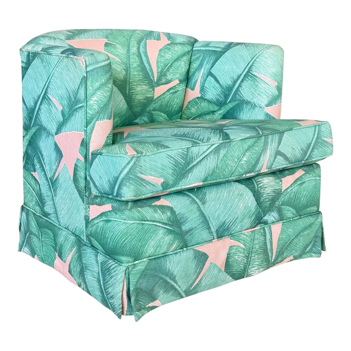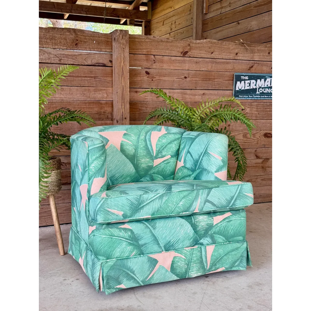 Elevate your space with this vintage Coastal Regency swivel tub chair, crafted by Southern Comfort of Clearwater, Florida. Original upholstery in a bold tropical banana leaf fabric in shades of green and blush pink, this chair brings a touch of Old Florida charm and coastal chic to any room.
