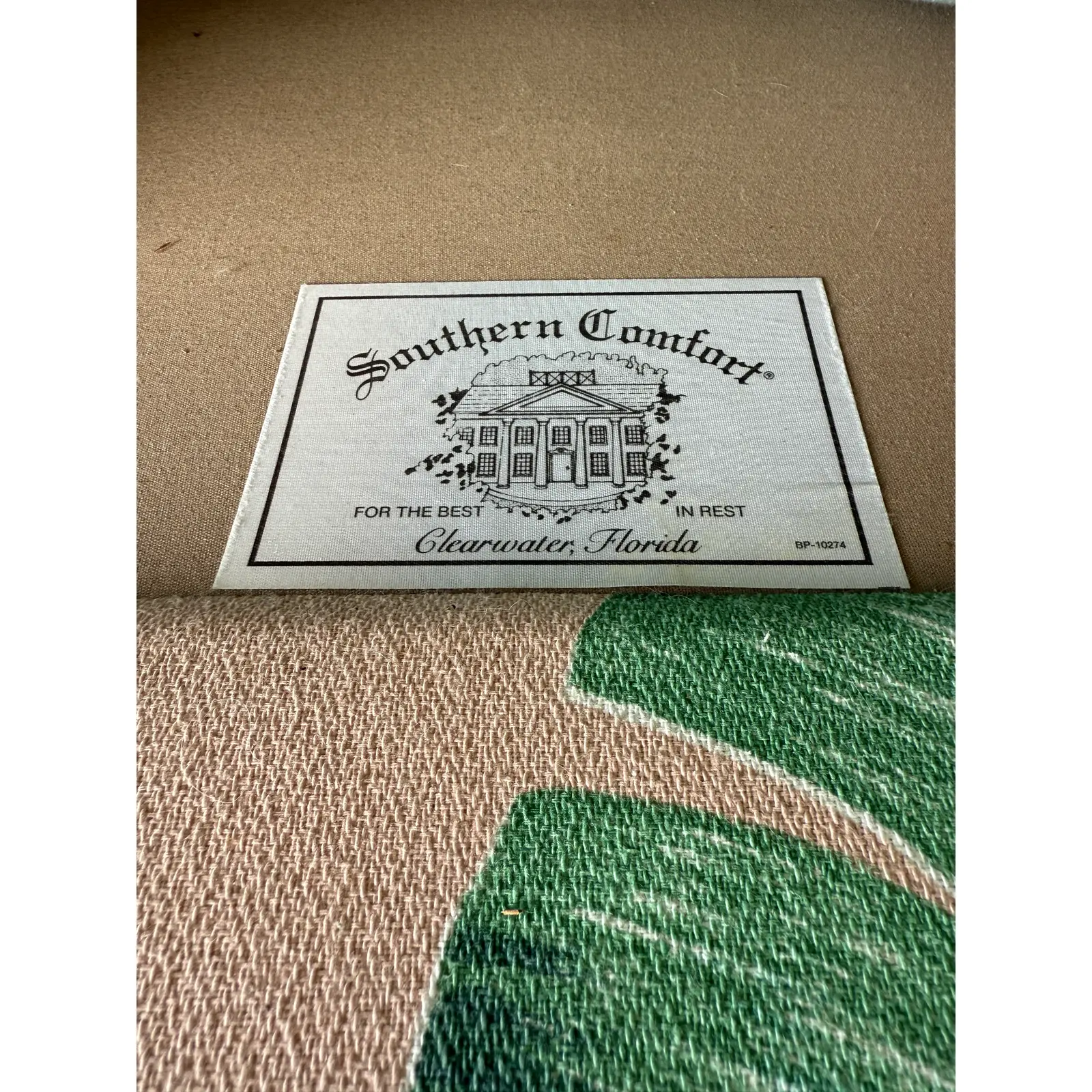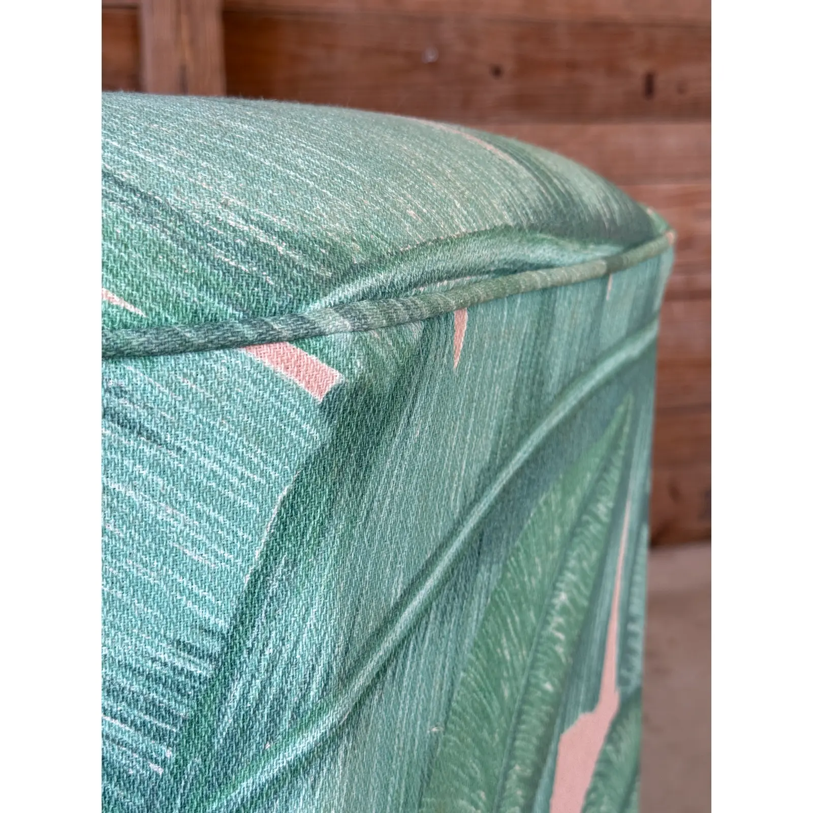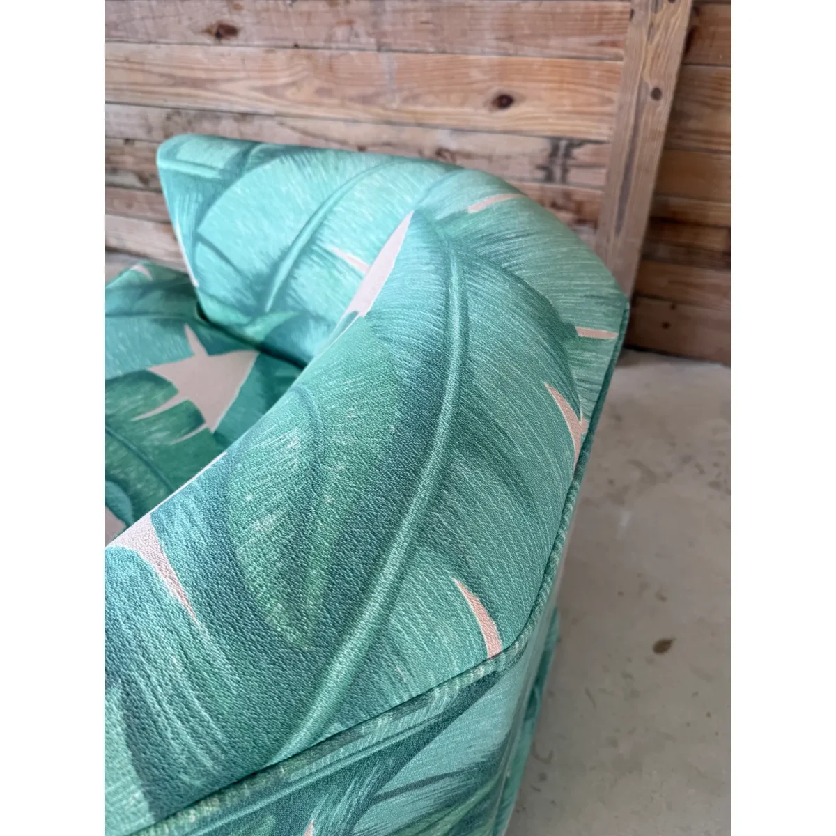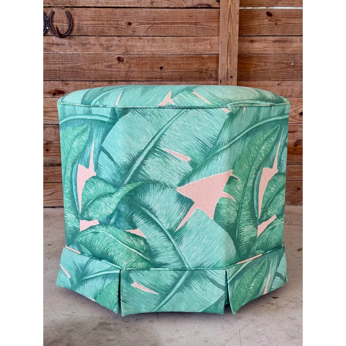 Elevate your space with this vintage Coastal Regency swivel tub chair, crafted by Southern Comfort of Clearwater, Florida. Original upholstery in a bold tropical banana leaf fabric in shades of green and blush pink, this chair brings a touch of Old Florida charm and coastal chic to any room.