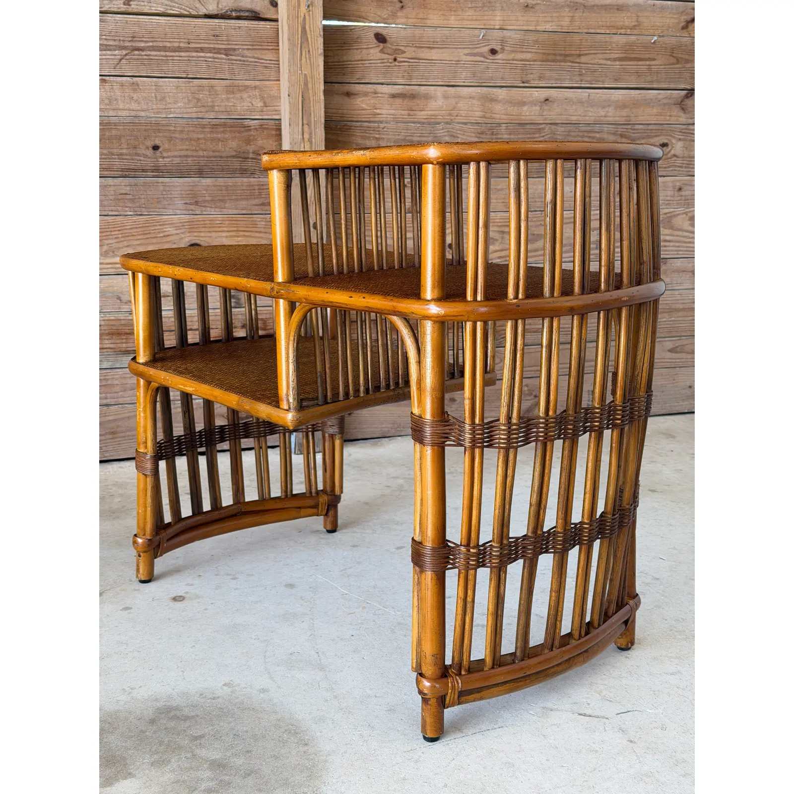 Charming and versatile vintage rattan tiered accent table featuring a warm honey-toned finish, woven rattan shelves, and beautifully turned vertical reed detailing. Designed with staggered levels, this piece works effortlessly between a pair of lounge chairs, beside a sofa, or as a sculptural accent table in a layered space.