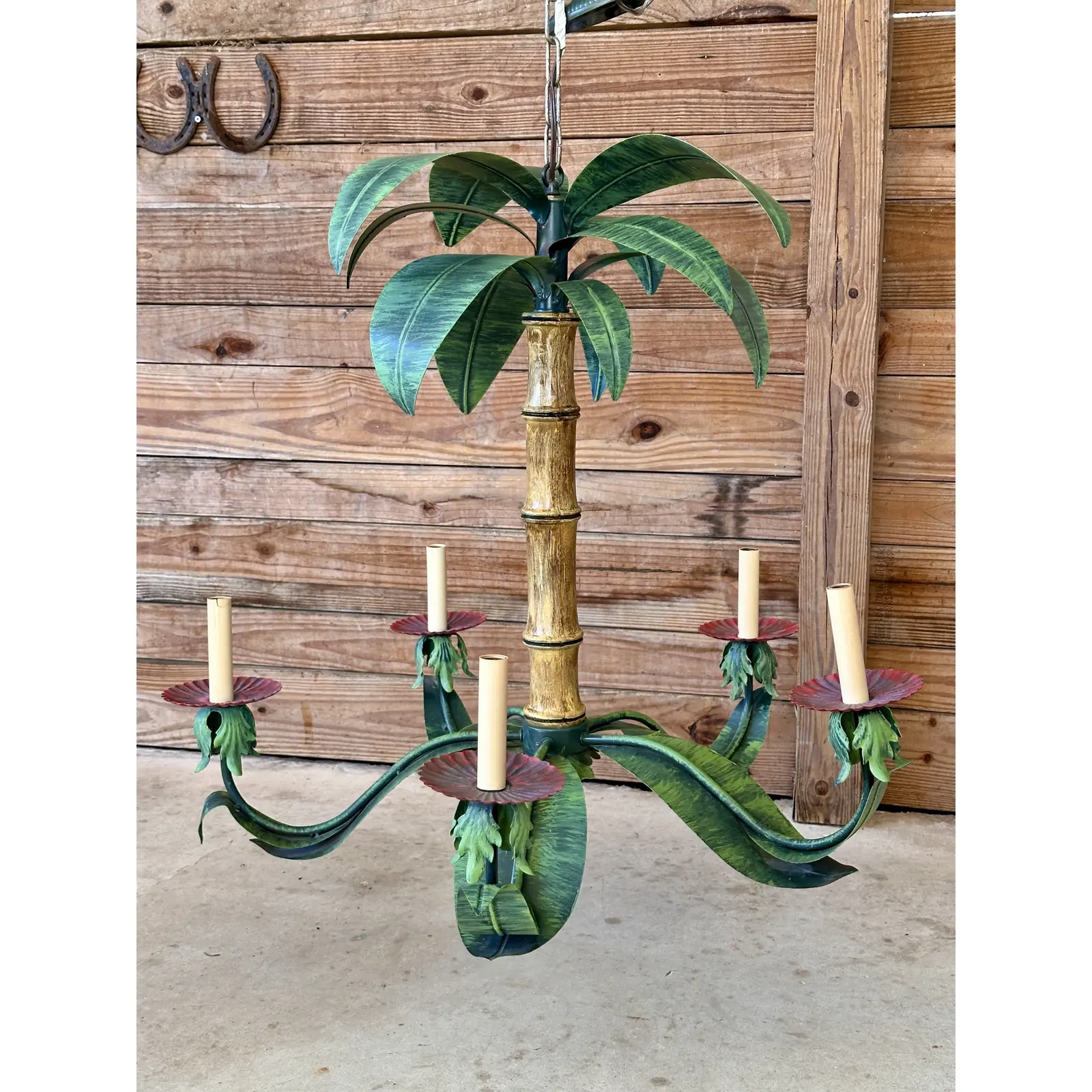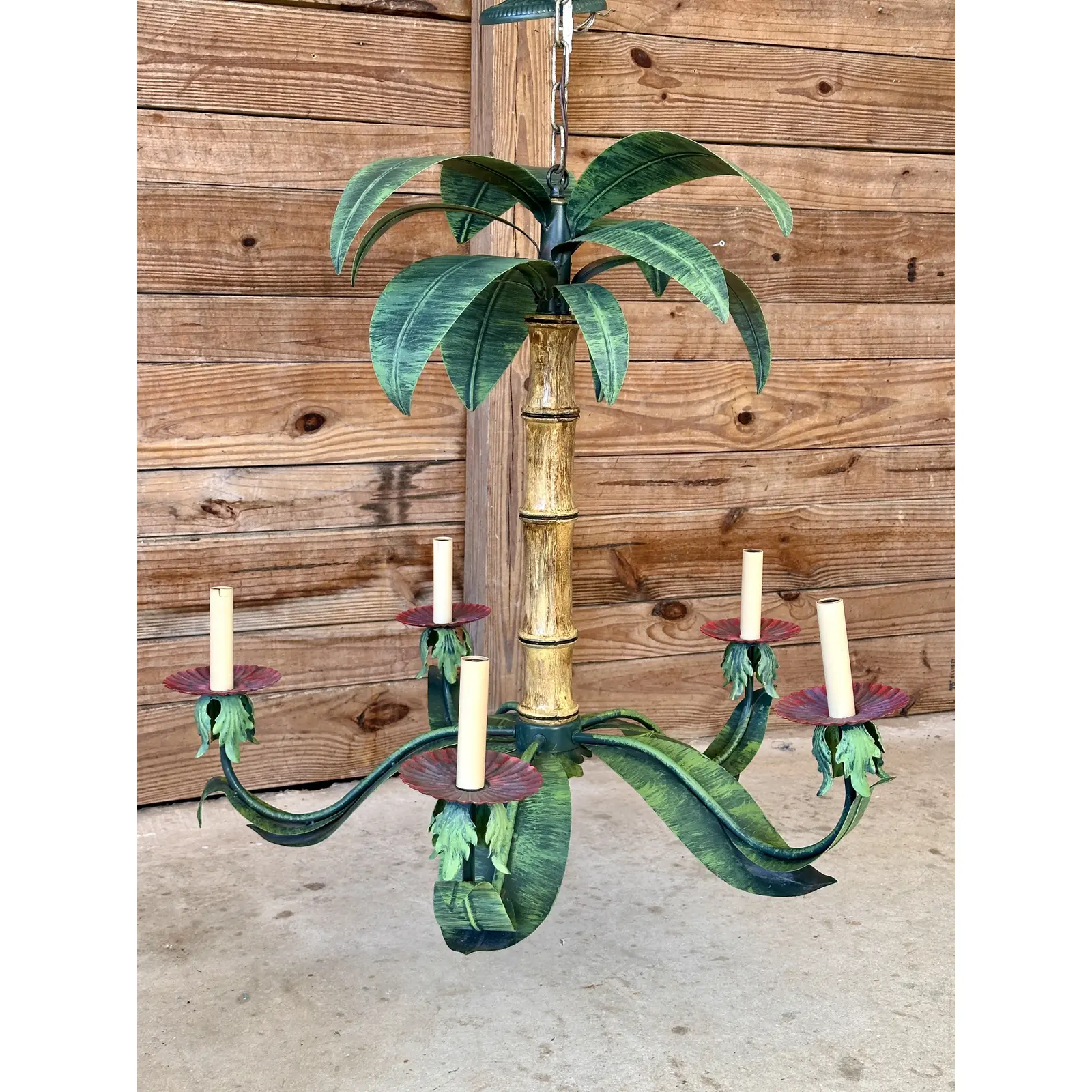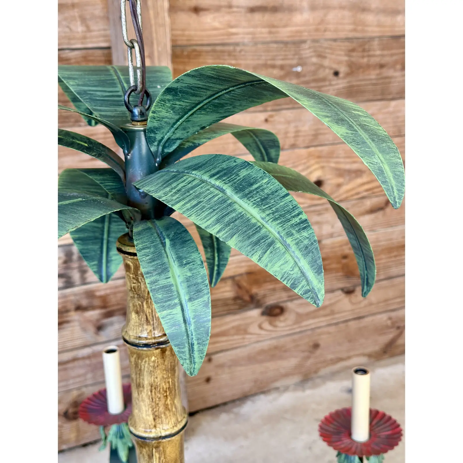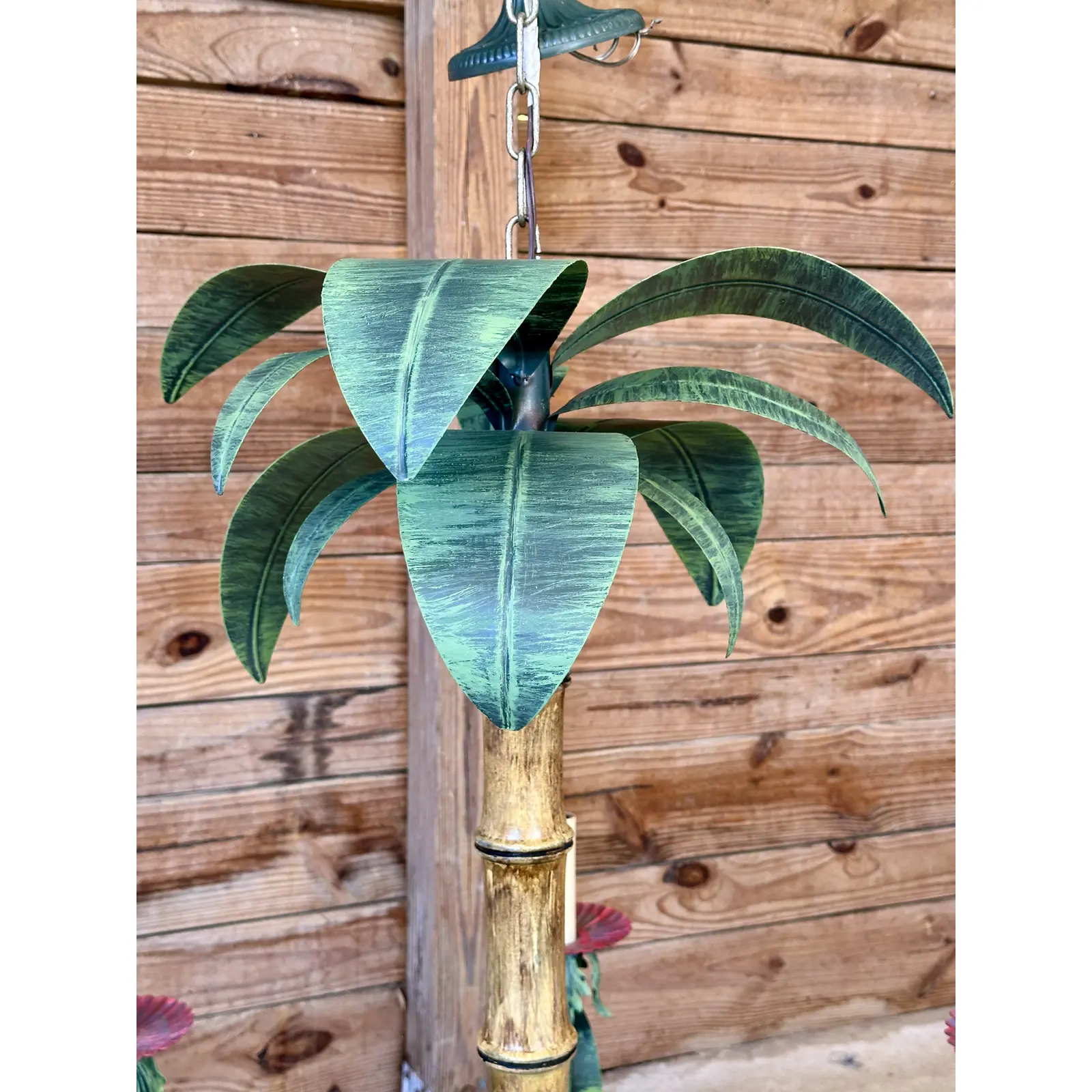 Bring a touch of tropical elegance to your space with this Vintage Metal Tole Palm Tree Chandelier.