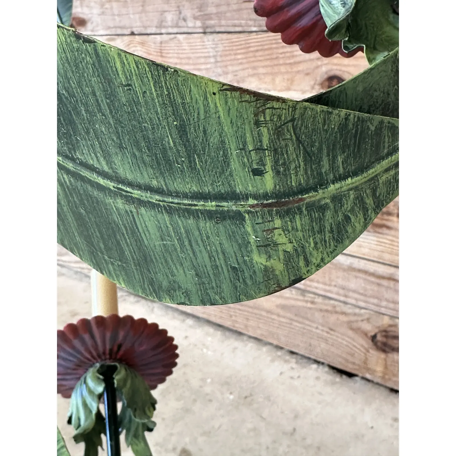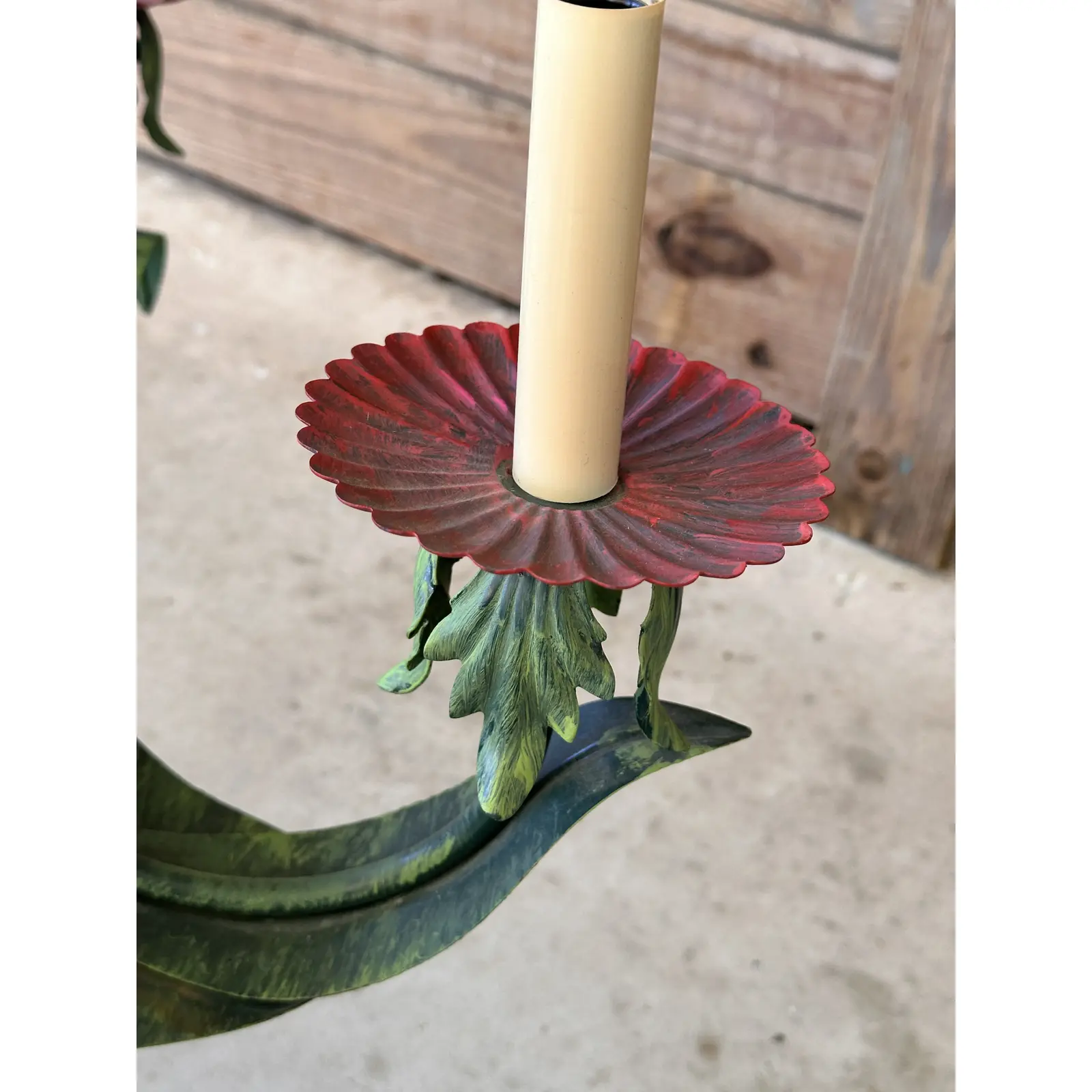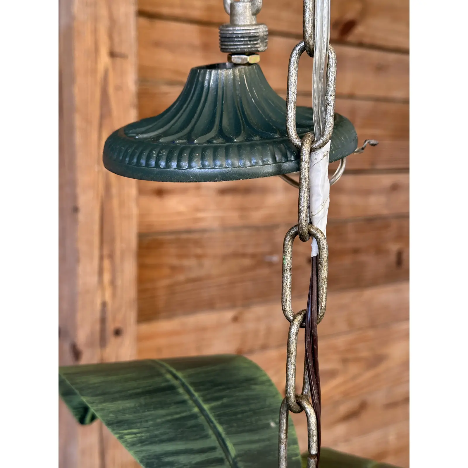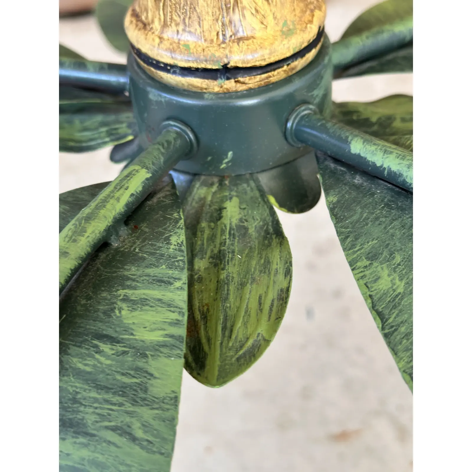 Bring a touch of tropical elegance to your space with this Vintage Metal Tole Palm Tree Chandelier.