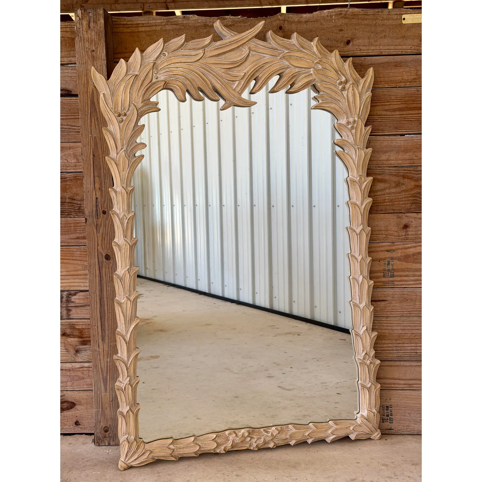 A beautifully carved vintage palm leaf wall mirror by Carolina Mirror Company, featuring layered botanical detailing and strong sculptural movement throughout the frame.