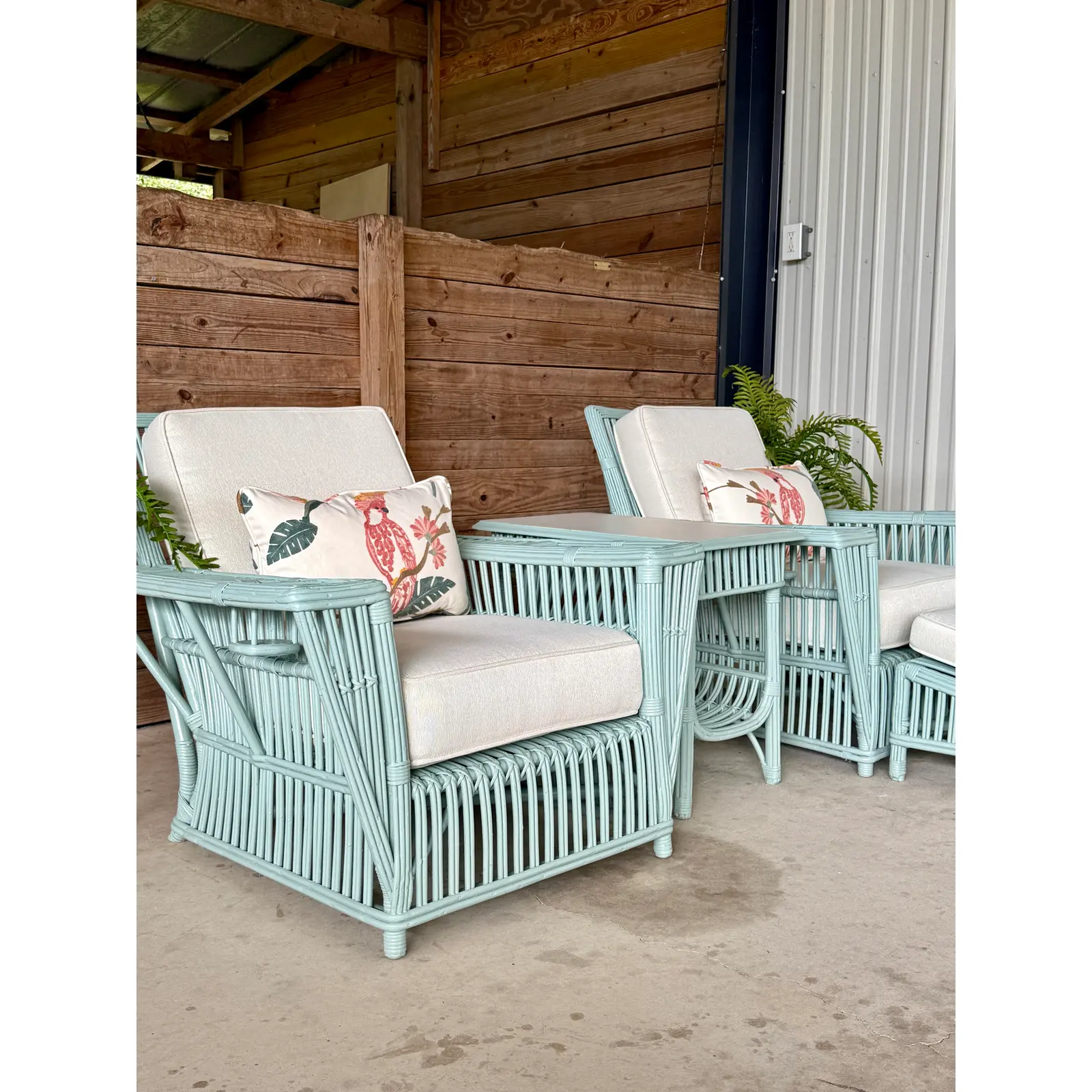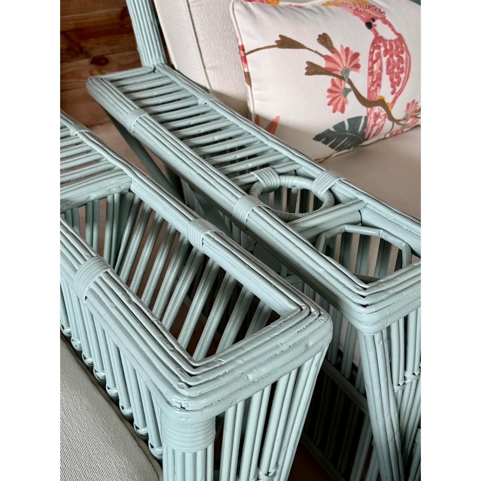 • Each piece is lacquered in Benjamin Moore’s Catalina, a serene coastal blue-green that highlights the sculptural stick rattan frame