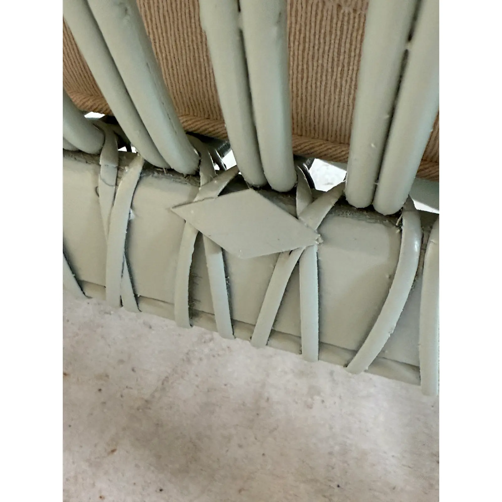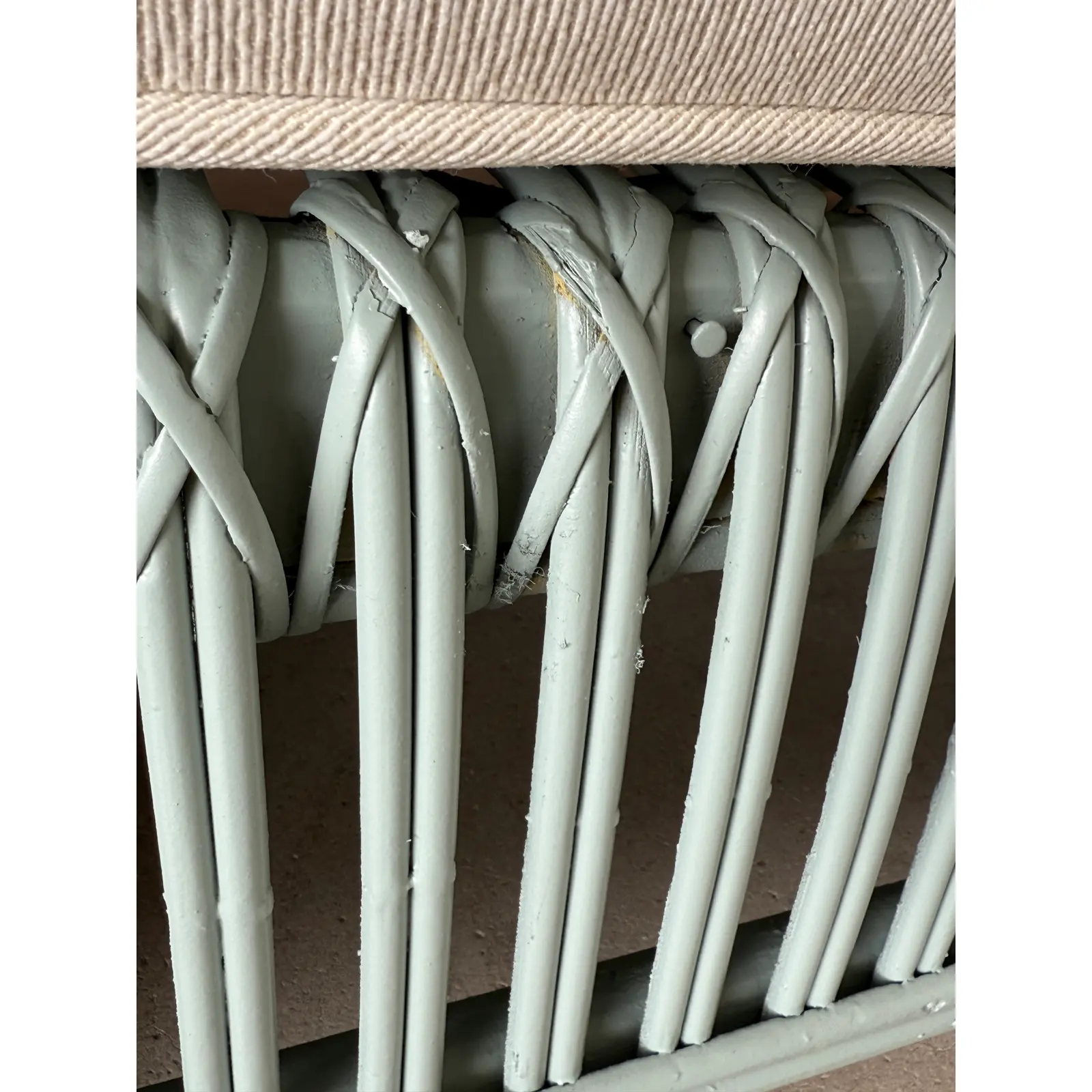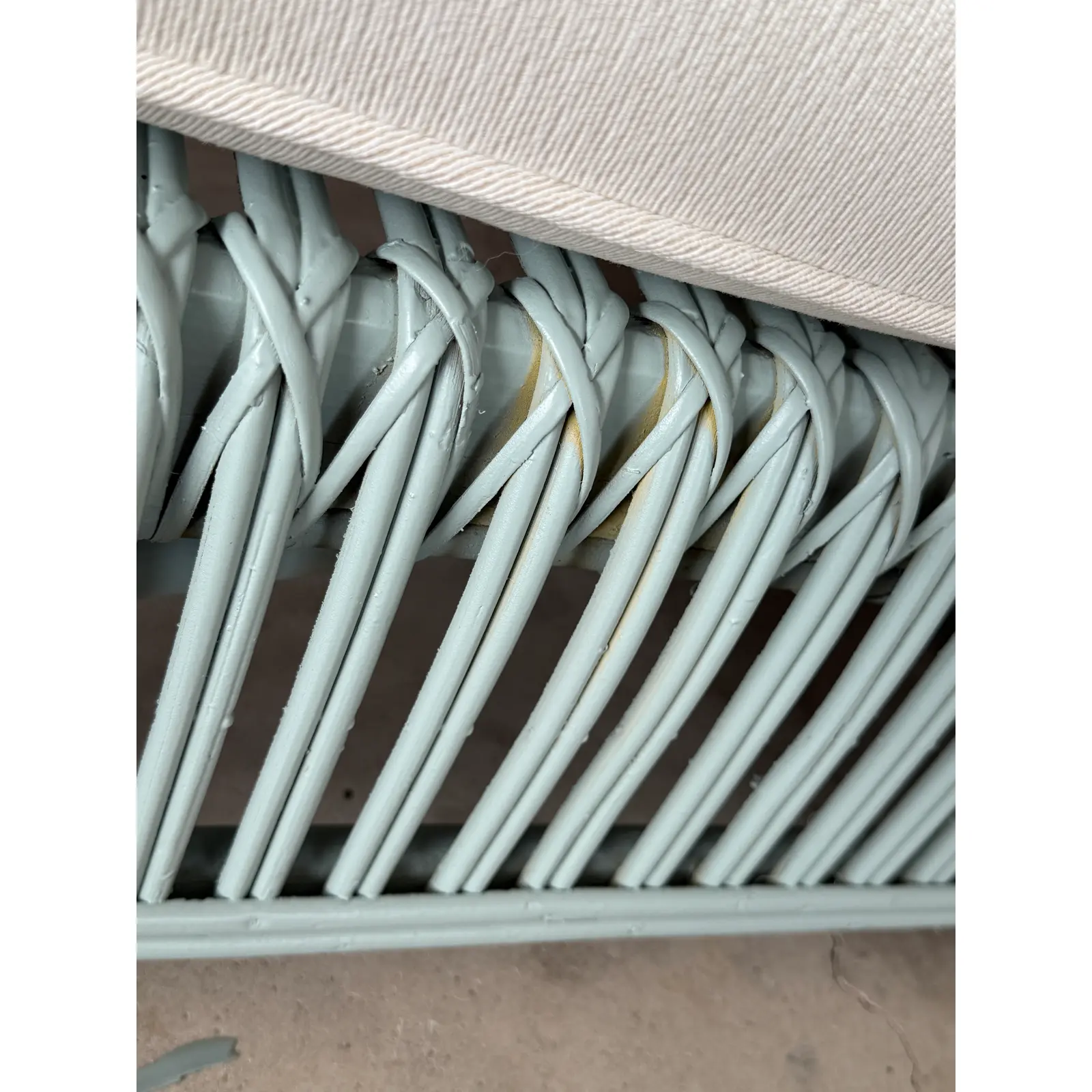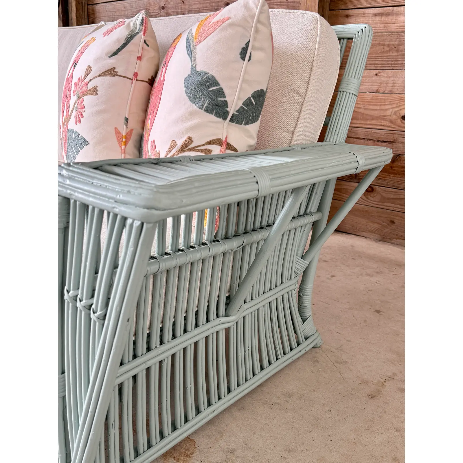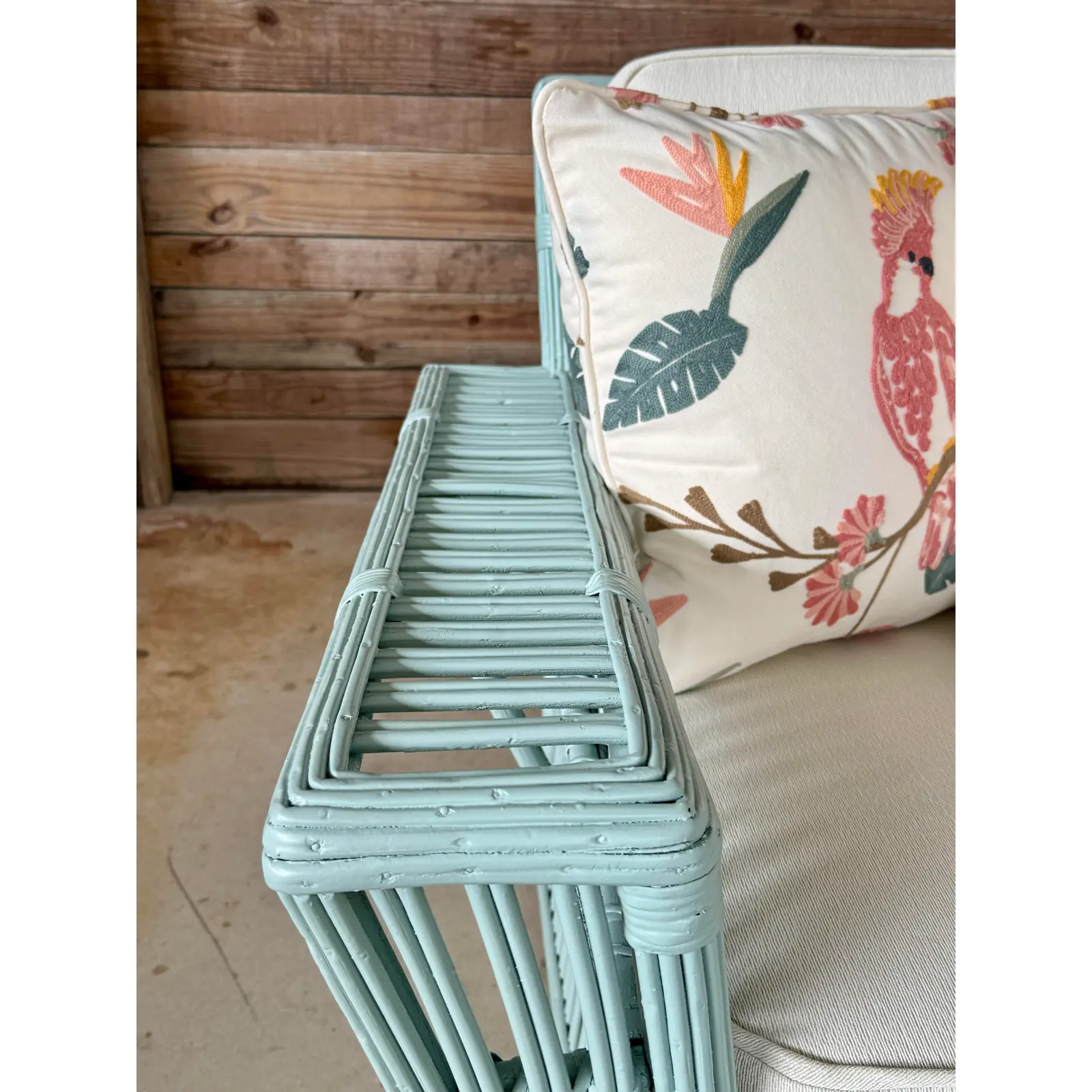 • Lacquered in Benjamin Moore’s “Catalina”, a soft coastal blue-green that perfectly complements its linear stick rattan frame