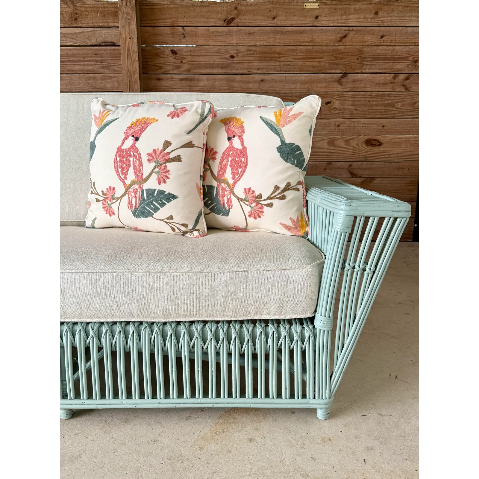 • Includes four accent pillows featuring exquisite embroidered crewel cockatoo and tropical floral motifs, adding a playful nod to classic Palm Beach whimsy