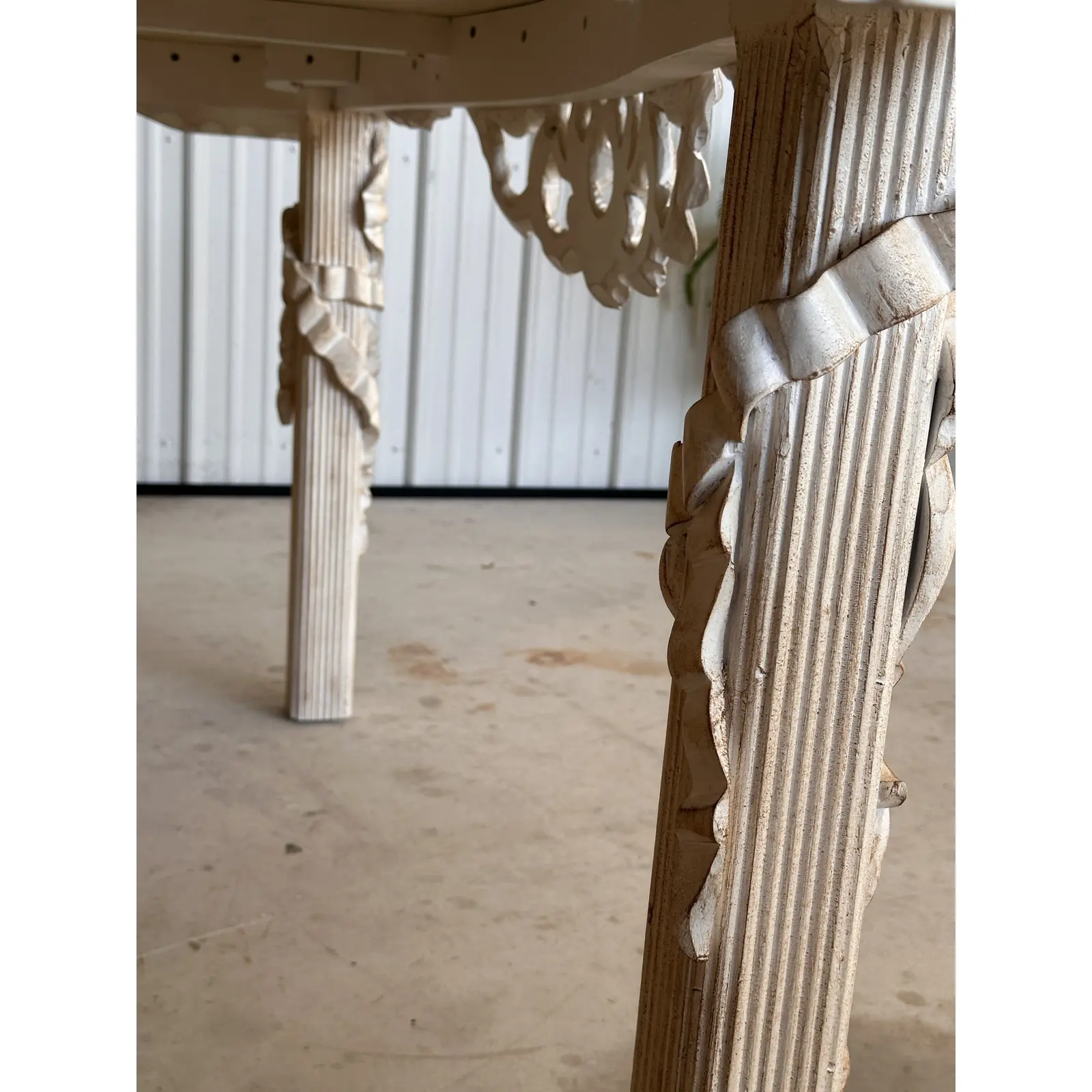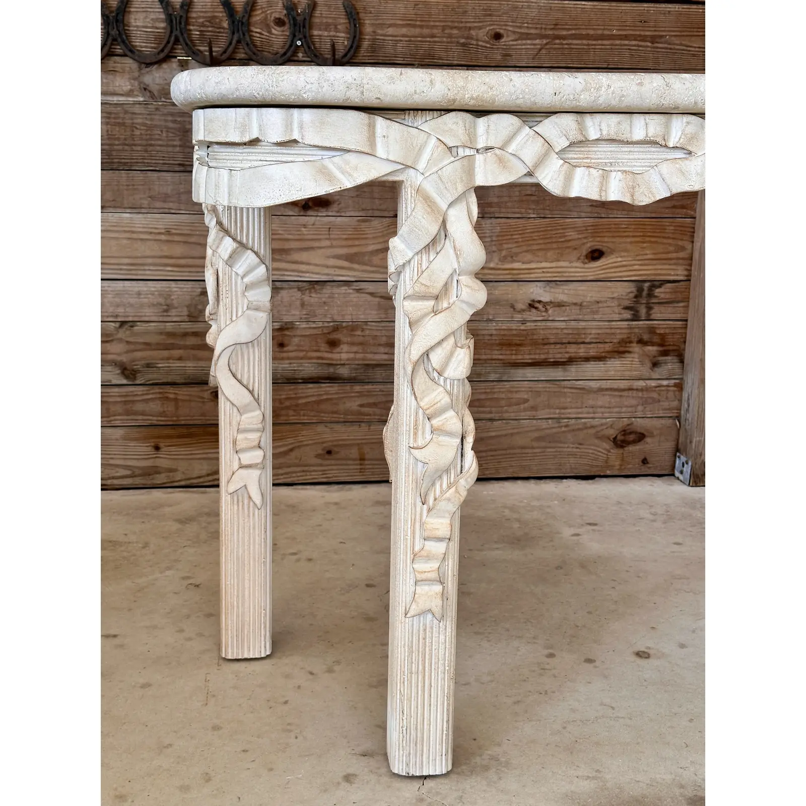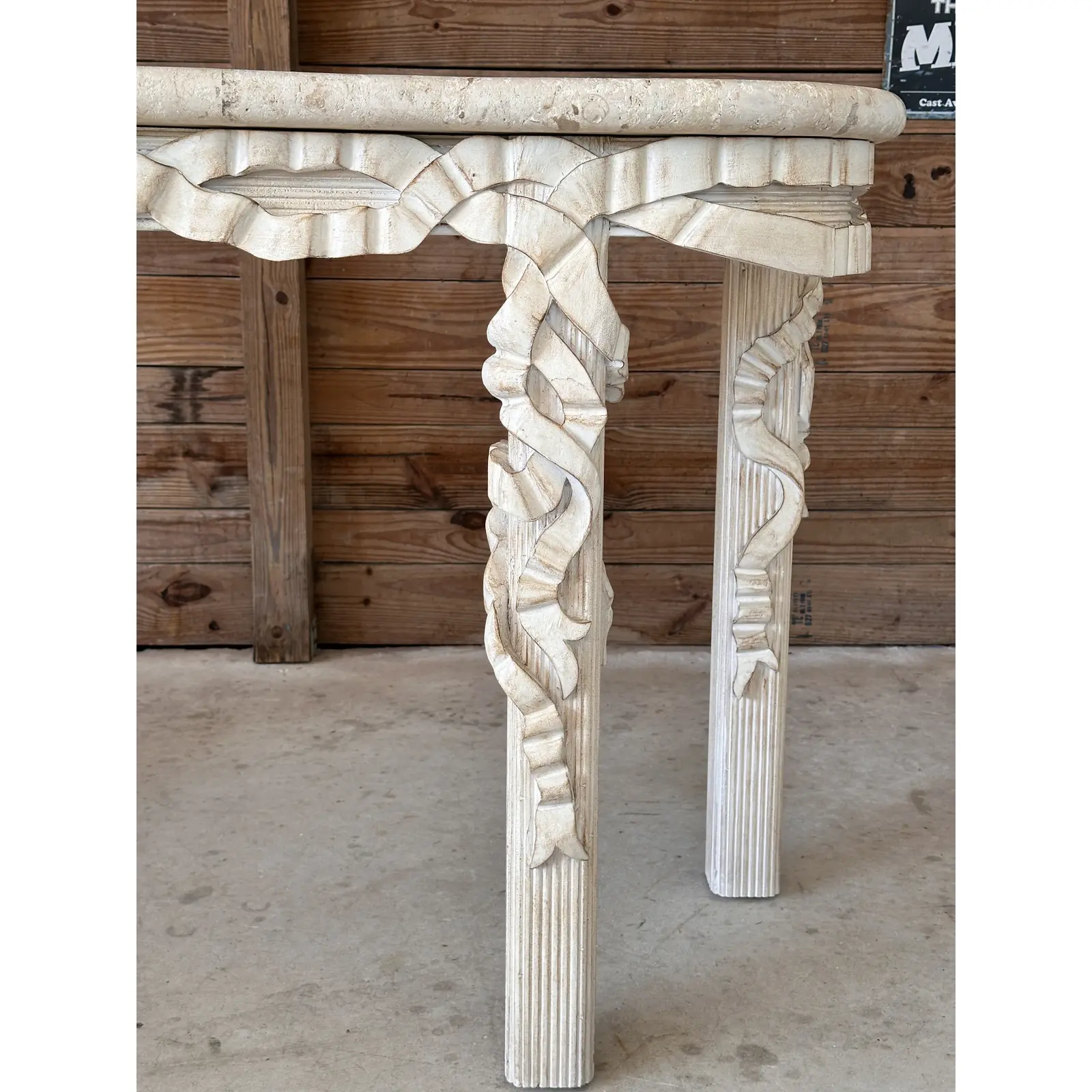 The intricate carved wood base showcases a flowing ribbon motif and reeded legs, finished in an antiqued whitewash for a coastal or neoclassical aesthetic. Perfect for a statement entryway or living space, this table blends elegance and versatility, reflecting the quality craftsmanship synonymous with Robb & Stucky.