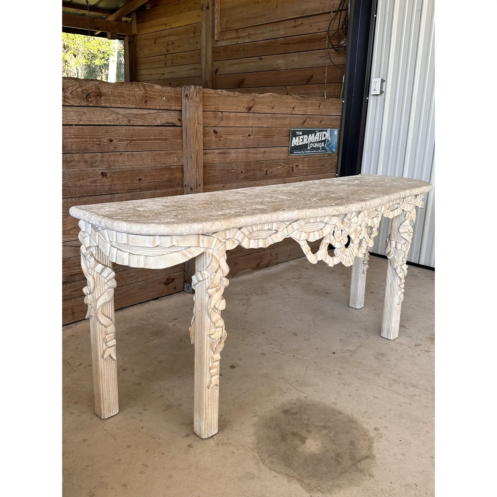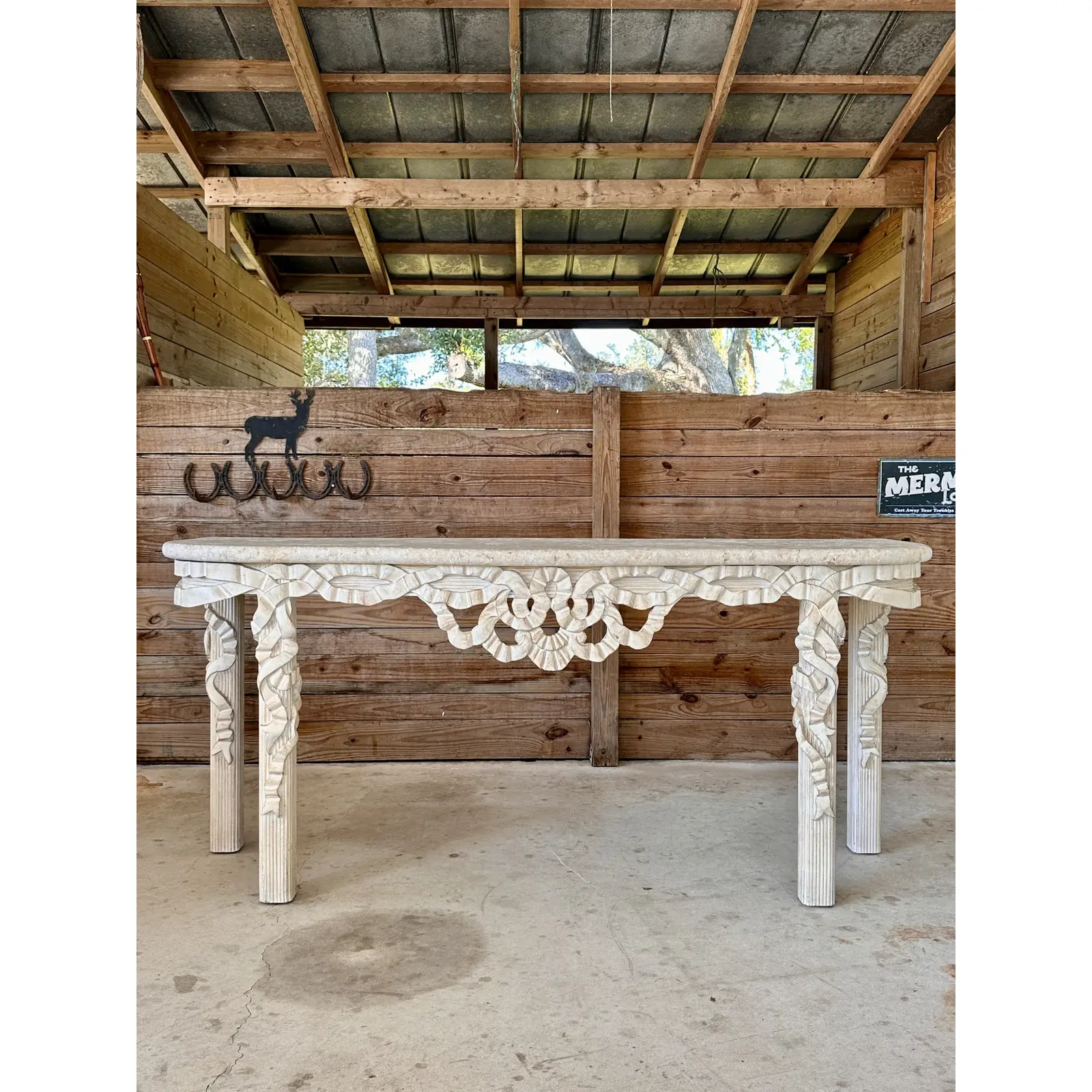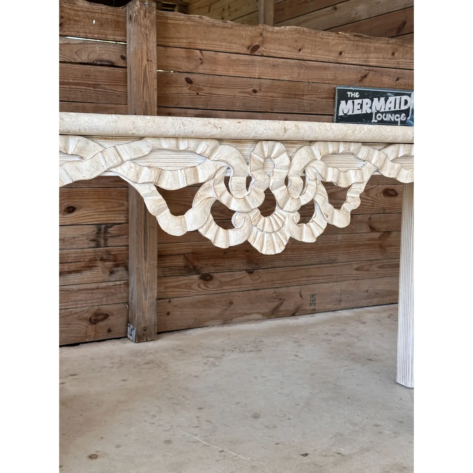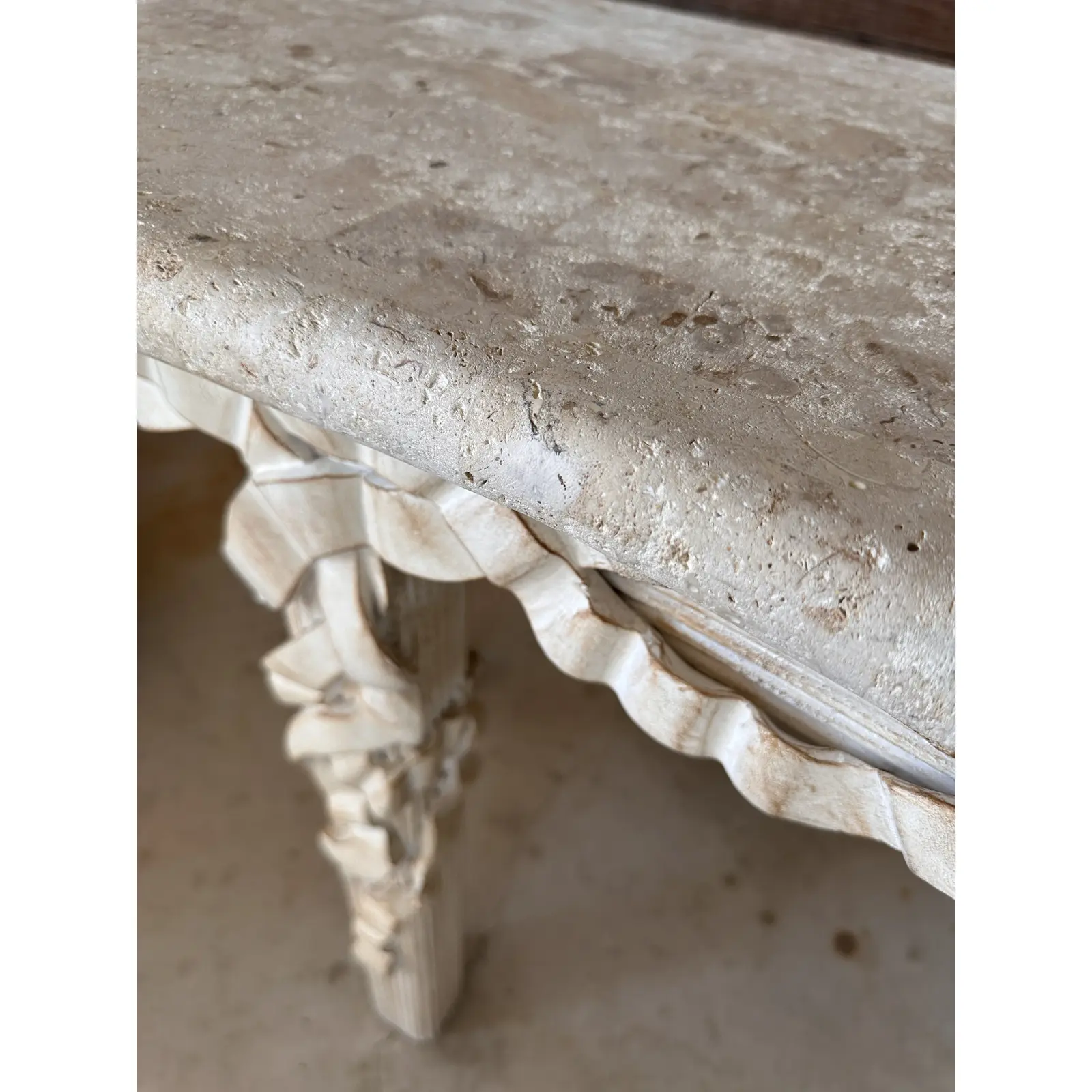 The intricate carved wood base showcases a flowing ribbon motif and reeded legs, finished in an antiqued whitewash for a coastal or neoclassical aesthetic. Perfect for a statement entryway or living space, this table blends elegance and versatility, reflecting the quality craftsmanship synonymous with Robb & Stucky.