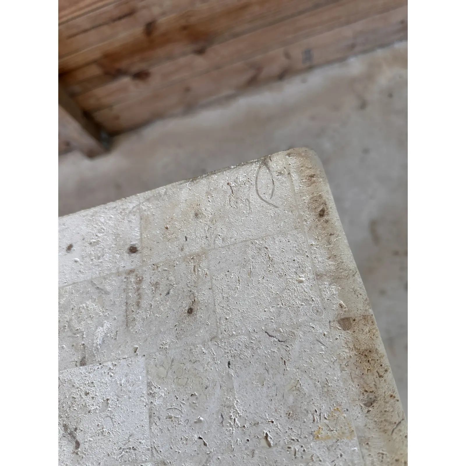 Imperfections and scuff to the faux stone top. Wear and some fading to the reed legs as seen in one photo. Overall great condition